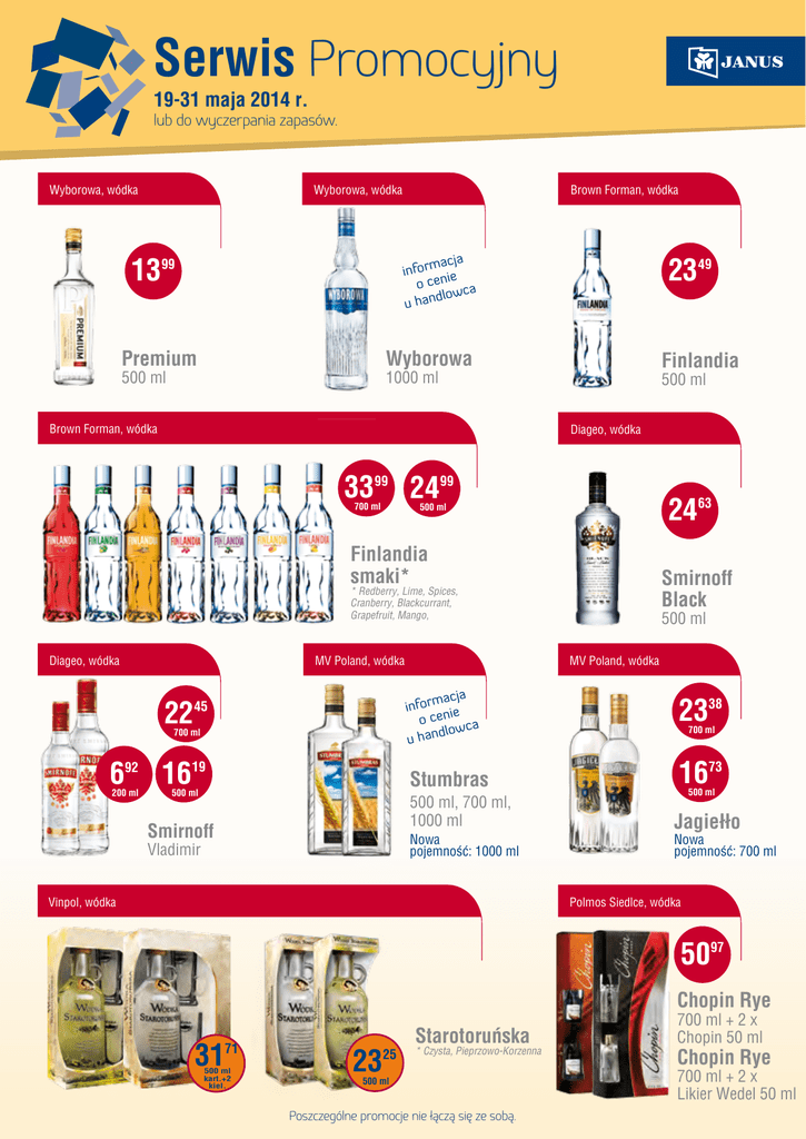 Serwis Promocyjny 19-31 maja 2014 r. lub do wyczerpania zapasów. Wyborowa, wódka Wyborowa, wódka Brown Forman, wódka acja inform ie o cen ca dlow u han 1399 Premium 2349 Wyborowa 500 ml Finlandia 1000 ml Brown Forman, wódka 500 ml Diageo, wódka 3399 2499 700 ml 2463 500 ml Finlandia smaki* Smirnoff Black * Redberry, Lime, Spices, Cranberry, Blackcurrant, Grapefruit, Mango, Diageo, wódka MV Poland, wódka 22 700 ml 692 1619 200 ml MV Poland, wódka acja inform ie n o ce a dlowc u han 45 Stumbras 500 ml 500 ml, 700 ml, 1000 ml Smirnoff Nowa pojemność: 1000 ml Vladimir 500 ml 2338 700 ml 1673 500 ml Jagiełło Nowa pojemność: 700 ml Polmos Siedlce, wódka Vinpol, wódka 5097 Chopin Rye 3171 500 ml kart.+2 kiel. 23 25 Starotoruńska * Czysta, Pieprzowo-Korzenna 500 ml Poszczególne promocje nie łączą się ze sobą. 700 ml + 2 x Chopin 50 ml Chopin Rye 700 ml + 2 x Likier Wedel 50 ml Express Cenowy CEDC, wódka CEDC, wódka acja inform ie o cen ca dlow u han acja inform ie o cen ca dlow u han Żubrówka Biała cytrynówka, grejpfrutowy, jabłko z miętą CEDC, wódka Absolwent Absolwent cytrynówka, grejpfrutowy, jabłko z miętą cytrynówka, grejpfrutowy, jabłko z miętą (mix*) 200 ml, acja inform ie n o ce a dlowc h u an Żytniówka (mix*) 500 ml, CEDC, wódka acja inform ie n e oc a dlowc h u an Żytniówka gorzka Żytniówka gorzka z miętą 100 ml, 200 ml, 500 ml 100 ml, 200 ml, 500 ml CEDC, wódka acja inform ie n e oc a dlowc h u an acja inform ie o cen ca dlow u han Soplica 100 ml, 200 ml, 500 ml 100 ml, 200 ml, 500 ml CEDC, wódka acja inform ie o cen ca dlow u han (mix*) 100 ml, acja inform ie n o ce a dlowc u han acja inform ie n o ce a dlowc u han CEDC, wódka Absolwent 100 ml, 200 ml, 500 ml CEDC, wódka CEDC, wódka acja inform ie n e oc a dlowc h u an Absolwent 100 ml, 200 ml, 500 ml CEDC, wódka CEDC, wódka CEDC, wódka acja inform ie o cen ca dlow u han acja inform ie o cen ca dlow u han Soplica Soplica Soplica śliwkowa, czarna porzeczka, malinowa, orzech laskowy, pigwowa, wiśniowa śliwkowa, czarna porzeczka, malinowa, orzech laskowy, pigwowa, wiśniowa śliwkowa, czarna porzeczka, malinowa, orzech laskowy, pigwowa, wiśniowa (mix*) 100 ml (mix*) 200 ml (mix*) 500 ml Promocja obowiązuje w okresie 19-31 maja 2014 r. lub do wyczerpania zapasów. Poszczególne promocje nie łączą się ze sobą. Express Cenowy MV Poland, wódka HWS Polska, wódka Nowy Smak acja inform ie o cen ca dlow u han Dębowa Polska, wódka 3610 3433 Stumbras 700 ml 2943 500 ml Stolichnaya Premium 500 ml * Pure, Cranberry, Caraway Dębowa Polska 700 ml Dębowa Polska, wódka Diageo, wódka 4013 MV Poland, wódka 3069 700 ml 2674 700 ml 3310 Smirnoff Black* 500 ml Dębowa Polska 700 ml *Lime&Mint, Espresso w tubie Ozone 700 ml W pakiecie nawet do 6,5 % dodatkowego rabatu! MV Poland, wódka Jantoń, likier 2319 Nowe smaki Herba Devynia 999 515 Nowe smaki (mix*) 500 ml * Brasiliana, Guanabana, Mango Colada, Pina Colada (mix*) 200 ml * Cytrynowa, Wiśniowa, Pigwa, Antonówka * Cytrynowa, Wiśniowa, Pigwa, Antonówka Bazilio, likier 3 83 Captain Tom Captain Tom Barmańska (mix*) 500 ml Jantoń, drink 678 245 Barmańska Bitter, Original, 500 ml Jantoń, drink Jantoń, likier (mix*) 200 ml 1624 700 ml 1333 500 ml * Brasiliana, Guanabana, Mango Colada, Pina Colada W pakiecie nawet do 9% dodatkowego rabatu! Bazilio Promocja obowiązuje w okresie 19-31 maja 2014 r. lub do wyczerpania zapasów. Poszczególne promocje nie łączą się ze sobą. Express Cenowy Polmos Siedlce, likier Diageo, likier Diageo, likier 5239 26 54 3910 Likier Czekoladowy Wedel 500 ml Diageo, likier 3910 700 ml 500 ml 3808 Brown Forman, whiskey 7769 4399 Bailey`s Irish Cream 1000 ml 5981 4575 Diageo, whisky Diageo, whisky 4145 4729 5362 Bushmills Bushmills 700 ml Original, Irish Honey 700 ml Blackbush 1000 ml 3199 2361 J.Walker Double Black Label 700 ml 700 ml 500 ml Bell`s Original Diageo, whisky 105 500 ml Jack Daniel`s 700 ml W pakiecie nawet do 16% dodatkowego rabatu! 18 700 ml Ballantine’s Brasil Biscotti, 700 ml Diageo, whisky Berries 500 ml W pakiecie nawet do 12% dodatkowego rabatu! Wyborowa, whisky Diageo, whisky Sheridans Sheridans Diageo, whisky 5449 8398 72 99 70 7748 500 ml puszka 99 700 ml 1000 ml + kart. J.Walker Black Label kartonik J.Walker Black Label 700 ml Promocja obowiązuje w okresie 19-31 maja 2014 r. lub do wyczerpania zapasów. Poszczególne promocje nie łączą się ze sobą. Express Cenowy Diageo, whisky Wyborowa, whisky Wyborowa, whisky 3018 acja inform ie o cen ca dlow u han Black & White Passport 700 ml Wyborowa, whisky Ballantine`s 200 ml acja inform ie n o ce a dlowc h u an 200 ml Ambra, brandy Wyborowa, whiskey 13 17 HIT acja inform ie o cen ca dlow u han Chivas Regal Pliska Jameson 200 ml Domain Menada, brandy acja inform ie n e oc a dlowc h u an 500 ml 200 ml Gurlex, brandy Domain Menada, brandy 1999 700 ml + kart. 16 71 20 36 1504 679 500 ml Belizza*5 Bacardi Martini, rum 500 ml Diageo, rum Bacardi Martini, rum 4399 Bacardi Superior, Black, Gold 700 ml Akron Napoleon Belizza*3 500 ml 200 ml 2827 Bacardi Oakheart 500 ml 3949 Captain Morgan Black, Spice Gold 700 ml Promocja obowiązuje w okresie 19-31 maja 2014 r. lub do wyczerpania zapasów. Poszczególne promocje nie łączą się ze sobą. Express Cenowy Diageo, rum Diageo, rum 3089 1828 Zacapa Centenario 23YO Spice Gold 500 ml Kijafa Cherry 700 ml TIM, wino 1077 750 ml Vinex, wino 1119 992 Vindicum Oak View (mix*) 750 ml (mix*) 750 ml *Cab.Sauv. cz.psł., Merlot cz.psł., Muscat b.psł. Vinex, wino HWS Polska, wino 14898 Captain Morgan HWS Polska, wino Wyjątkowy smak Ciociosan (mix*) 1000 ml * Bianco,Classico, Dry, Fragola, Grapefruit, Limone, Rosso, Sweet *Cabernet Sauv., Colombard Chardonnay, r. psł. Vinex, wino Jantoń, wino 1155 1219 Witosha Bongeronde Medium Imiglykos * cz., b. * Red, Rose, White * b. psł., cz. psł. (mix*) 750 ml Vinpol, wino (mix*) 750 ml Vinpol, wino 8HIT80 Totino Afrodite *Bianco, Cherry, Lime, Orange