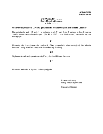 (PROJEKT) DRUK Nr 93 UCHWAŁA NR ……… Rady Miejskiej Leszna z dnia ……… w sprawie: przyjęcia „Planu gospodarki niskoemisyjnej dla Miasta Leszna”. Na podstawie art. 18 ust. 1 w związku z art. 7 ust. 1 pkt 1 ustawy z dnia 8 marca 1990 r. o samorządzie gminnym (Dz. U. z 2013 r. poz. 594 ze zm.) uchwala się, co następuje: § 1. Uchwala się i przyjmuje do realizacji „Plan gospodarki niskoemisyjnej dla Miasta Leszna”, który stanowi załącznik do niniejszej uchwały. § 2. Wykonanie uchwały powierza się Prezydentowi Miasta Leszna. § 3. Uchwała wchodzi w życie z dniem podjęcia. Przewodniczący Rady Miejskiej Leszna Sławomir Szczot UZASADNIENIE do uchwały Nr …………………… Rady Miejskiej Leszna z dnia …………… w sprawie: przyjęcia „Planu gospodarki niskoemisyjnej dla Miasta Leszna”. „Plan gospodarki niskoemisyjnej dla Miasta Leszna” jest dokumentem opracowanym zgodnie z wytycznymi Narodowego Funduszu Ochrony Środowiska i Gospodarki Wodnej. Wykonanie ww. opracowania jest współfinansowane ze środków Funduszu Spójności Programu Operacyjnego Infrastruktura i Środowisko 2007-2013 - projekt w ramach konkursu nr 2/POliŚ/9.3/2013, działanie 9.3 „Termomodernizacja obiektów użyteczności publicznej – plany gospodarki niskoemisyjnej”. Rada Miejska Leszna uchwałą Nr XXX/457/2013 z dnia 29 października 2013 r. wyraziła wolę przystąpienia do opracowania i wdrażania planu gospodarki niskoemisyjnej dla miasta Leszna, a następnie Uchwałą nr XLII/563/2014 z dnia 25 września 2014 roku zgodziła się na przyjęcie środków z Funduszu Spójności. Celem planu gospodarki niskoemisyjnej jest określenie, na podstawie analizy aktualnego stanu w zakresie zużycia energii i emisji gazów cieplarnianych na obszarze miasta Leszna, działań zmierzających do redukcji zużycia energii, zwiększenia wykorzystania źródeł odnawialnych oraz ograniczenia emisji gazów cieplarnianych wraz z ekologiczną oceną ich efektywności. Działania te przyczynią się do osiągnięcia celów określonych przez Unię Europejską w pakiecie klimatyczno-energetycznym do roku 2020. Powyższy dokument ma na celu również wzmacnianie działań na rzecz poprawy jakości powietrza na obszarach, na których odnotowano przekroczenia poziomów dopuszczalnych substancji w powietrzu poprzez redukcję emisji zanieczyszczeń. Plan gospodarki niskoemisyjnej jest dokumentem określającym cele strategiczne i szczegółowe oraz działania dla ich osiągnięcia w perspektywie krótko-, średnio- i długoterminowej wraz ze wskazaniem ich szacunkowych kosztów i przewidywanych źródeł finansowania. Ponadto ustala zasady monitorowania i raportowania wyników prowadzonej polityki ekologiczno-energetycznej. Opracowany plan gospodarki niskoemisyjnej oraz zaplanowane działania przyczynią się do poprawy stanu środowiska i jakości życia mieszkańców na terenie miasta Leszna. Projekt dokumentu wraz z prognozą oddziaływania na środowisko uzyskał pozytywne opinie Regionalnego Dyrektora Ochrony Środowiska w Poznaniu oraz Wielkopolskiego Państwowego Wojewódzkiego Inspektora Sanitarnego. Ponadto zgodnie z art. 30 ustawy z dnia 3 października 2008 r. o udostępnianiu informacji o środowisku i jego ochronie, udziale społeczeństwa w ochronie środowiska oraz o ocenach oddziaływania na środowisko (jt. Dz. U. z 2013 r. poz. 1235, ze zm.) zapewniono możliwość udziału społeczeństwa w postępowaniu dotyczącym opracowania niniejszego dokumentu poprzez podanie do publicznej wiadomości informacji o opracowaniu projektu Planu oraz o możliwości zapoznania się z jego treścią i składania uwag i wniosków. Dokument był dostępny zarówno w siedzibie organu jaki i poprzez Biuletyn Informacji Publicznej. Plan jest dokumentem, który może okazać się niezbędny do pozyskania funduszy europejskich w latach 2014- 2020 z niektórych osi priorytetowych. Nowa perspektywa finansowania ma służyć realizacji Strategii Europa 2020 i dążyć do stworzenia z Europy lidera w dziedzinie energii odnawialnej i technologii niskoemisyjnych. W związku z powyższym podjęcie niniejszej uchwały jest uzasadnione. Opracował : Wydział Gospodarki Komunalnej i Ochrony Środowiska Zatwierdził: