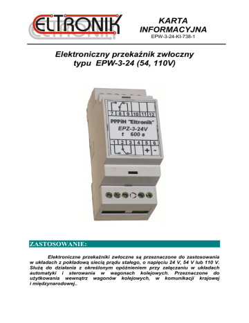 KARTA INFORMACYJNA EPW-3-24-KI-738-1 Elektroniczny przekaźnik zwłoczny typu EPW-3-24 (54, 110V) ZASTOSOWANIE: Q Elektroniczne przekaźniki zwłoczne są przeznaczone do zastosowania w układach z pokładową siecią prądu stałego, o napięciu 24 V, 54 V lub 110 V. Służą do działania z określonym opóźnieniem przy załączaniu w układach automatyki i sterowania w wagonach kolejowych. Przeznaczone do użytkowania wewnątrz wagonów kolejowych, w komunikacji krajowej i międzynarodowej.. OPIS: Przekaźnik zwłoczny jest wykonany z wykorzystaniem cyfrowych układów scalonych serii CMOS. Napięcie zasilania jest dostarczane do układu stabilizatora, zapewniającego stałe warunki zasilania, niezależne od wahań napięcia zasilania wagonu i temperatury otoczenia. Układ zasilania jest zabezpieczony przed uszkodzeniem wskutek przyłączenia zasilania o niewłaściwej biegunowości. Elementem wykonawczym jest przekaźnik elektromagnetyczny. Na obudowie są umieszczone zaciski do przyłączania zasilania i obwodów wykonawczych. Oznaczenie zacisków podano na obudowie. Ustawienia styków przedstawiono w sytuacji, gdy przekaźnik nie jest zasilany. W przekaźniku EPW ze zwłoką czasową przy wyłączaniu, przyłączenie do zacisków „+” i „-” napięcia zasilania nie spowoduje żadnej reakcji przekaźnika. Przyłączenie do zacisku „S” napięcia zbliżonego do napięcia zacisku „+” spowoduje przełączenie styków wykonawczych. Zmiana napięcia na zacisku „S” do wartości zbliżonej do „-” spowoduje uaktywnienie zwłoki czasowej i po tym czasie przekaźnik powróci do stanu wyjściowego. Przekaźnik jest przeznaczony do zamocowania na znormalizowanej szynie DIN. 36.0 90.0 58.0 DANE TECHNICZNE: • • • • • • • • • znamionowe napięcie zasilania UN…………………………….24 V d.c. dopuszczalny zakres zmian napięcia zasilania …(.od 0,6 do 1,25) UN znamionowy prąd obciążenia styków w kategorii DC1 ......16 A / 24 V zwłoka czasowa ……………………………………...….wg zamówienia dokładność realizowania zwłoki czasowej ……………………...± 10 % pobór prądu zasilania …………………...………………………..< 0.2 A obciążalność obwodów wykonawczych …………………………..…8 A zewnętrzna temperatura pracy .…klasa T3 wg PN-EN 50155 p. 2.1.2 masa ………………………..……………………….………………..106 g • wymiary …………………..…………………..90 mm x 58 mm x 36 mm • Warunki Techniczne Wykonania i Odbioru ……..…..EPZ-WTO-800-1 PPPiH ELTRONIK Sp. z o.o. ul. Lelewela 4B 61-409 POZNAŃ tel. +48 (0) 61 830 42 01, 061 839 92 44, 061 839 92 49, fax. 061 830 65 02 http://www.eltronik.pl e-mail: [email protected]