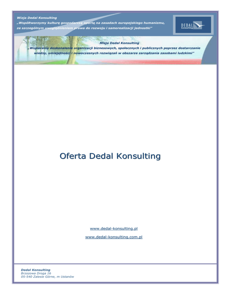 Wizja Dedal Konsulting „Współtworzymy kulturę gospodarczą opartą na zasadach europejskiego humanizmu, ze szczególnym uwzględnieniem prawa do rozwoju i samorealizacji jednostki” Misja Dedal Konsulting „Wspieramy doskonalenie organizacji biznesowych, społecznych i publicznych poprzez dostarczanie wiedzy, umiejętności i nowoczesnych rozwiązań w obszarze zarządzania zasobami ludzkimi” Oferta Dedal Konsulting www.dedal-konsulting.pl www.dedal-konsulting.com.pl Dedal Konsulting Brzozowa Droga 16 05-540 Zalesie Górne, m Ustanów O Offeerrttaa D Deeddaall K Koonnssuullttiinngg O O ffiirrm miie e Dedal Konsulting powstał w wyniku rozwoju Firmy Konsultingowej Jacek Olkowski istniejącej od 1999 roku. Dynamicznie rosnąca liczba klientów oraz pozytywne referencje i opinie o naszych usługach na rynku stały się motorem rozwoju firmy. Realizowaliśmy projekty doradcze m.in. dla firm z branŜ: produkcyjnej, FMCG, budowlanej, ubezpieczeniowej, transportowej i usługowej. DuŜe projekty szkoleniowe i pojedyncze treningi takŜe dla wielkich korporacji i firm zatrudniających nawet 2500 pracowników. KaŜde przedsięwzięcie jest traktowane indywidualnie. Firma nie oferuje gotowych produktów w postaci szkoleń lub projektów doradczych, poniewaŜ potrzeby klientów są zróŜnicowane i nacechowane specyfiką branŜy oraz rynków, na jakich funkcjonują nasi klienci. Dlatego kaŜda oferta współpracy jest poprzedzona spotkaniem z klientem, dla ustalenia jego unikalnych potrzeb i przygotowania z ich uwzględnieniem najlepszych rozwiązań. Specjalizujemy się w indywidualnych projektach doradczych dla przedsiębiorstw, oraz szkoleniach z zakresu opisanego na kolejnych stronach. Dzięki konsekwentnej realizacji wizji i misji naszej firmy, doświadczeniu i stale podnoszonym kwalifikacjom konsultantów budujemy długofalowe i trwałe relacje z naszymi klientami, partnerami biznesowymi oraz środowiskiem otoczenia społecznego firmy. Dedal Konsulting (+48) (52) 320 40 80 Brzozowa Droga 16 05-540 Zalesie Górne, m Ustanów 1 O Offeerrttaa D Deeddaall K Koonnssuullttiinngg P Prro ojje ek kttyy d do orra ad dcczze e ♦ Zarządzanie zmianą w organizacji Opracowanie planu komunikacji i przygotowania pracowników do zmiany Szkolenia dla kadry zarządzającej dotyczące mechanizmów zmiany i kierowania zespołami pracowniczymi w okresie zmiany Tworzenie narzędzi wspierających zarządzanie zmianą w organizacji Wyłanianie i szkolenie Liderów Zmiany BieŜący monitoring efektywności działań i planowanie niezbędnych modyfikacji ♦ Rekrutacja pracowników Projekty rekrutacyjne na stanowiska menedŜerskie, top management, handlowców, specjalistów. Rekrutacja zewnętrzna i wewnętrzna. Opracowanie systemów rekrutacji, procedur i narzędzi w połączeniu z procesami kadrowymi i rozwojowymi firmy klienta ♦ Assessment Center Doradztwo w zakresie Zarządzania Zasobami Ludzkimi Systemy ocen pracowniczych i modele kompetencyjne Systemy motywacyjne i wynagrodzeń, wartościowanie stanowisk oraz siatki płac ŚcieŜki kariery i planowanie sukcesji Rozwiązywanie sytuacji konfliktowych Budowanie i zmiany kultury organizacyjnej w kierunku oczekiwanym przez klienta Kreowanie roli działu ZZL w organizacji jako „wewnętrznego konsultanta” ♦ Szkolenia i rozwój pracowników Tworzenie systemu szkoleniowego (procesy i procedury), zespołów trenerów wewnętrznych, programów szkoleniowych. Identyfikacja potrzeb szkoleniowych w oparciu o badanie luk kompetencyjnych oraz planowane zmiany w organizacji i jej otoczeniu Indywidualne plany rozwojowe dla kadry menedŜerskiej Development Center Dedal Konsulting (+48) (52) 320 40 80 Brzozowa Droga 16 05-540 Zalesie Górne, m Ustanów 2 O Offeerrttaa D Deeddaall K Koonnssuullttiinngg S Szzk ko olle en niia a Wybrane tematy szkoleń zostały przedstawione szerzej w postaci przykładowych celów i zagadnień programowych. Mamy nadzieje, Ŝe pozwoli to Państwu lepiej poznać naszą ofertę. Wszystkie programy szkoleniowe realizowane są metodami interaktywnymi ze szczególnym naciskiem na ćwiczenia praktyczne (scenki, studia przypadków, samodzielne ćwiczenia umiejętności np. prezentacje). Trenerzy prowadzący to sprawdzeni i doświadczeni praktycy biznesowi i szkoleniowcy posiadający takŜe dyplomy najlepszych uczelni i certyfikaty stowarzyszeń zawodowych oraz wymagane licencje. Dossier wybranych trenerów i konsultantów znajdziecie Państwo w rozdziale Konsultanci. ♦ Umiejętności menedŜerskie Podstawowe umiejętności menedŜerskie CELE SZKOLENIA Poznania zasad budowania i kierowania zespołami pracowniczymi Poznanie narzędzi wspierających planowanie i przećwiczenie ich wykorzystania Zrozumienie procesu podejmowania decyzji i przećwiczenie stosowania narzędzi wspierających ten proces Zrozumienie i przećwiczenie podstawowych umiejętności menedŜerskich tj.: wyznaczanie i komunikowanie celów, delegowanie zadań, motywowanie pracowników i kontrola wykonania pracy. Rozwiniecie umiejętności radzenia sobie ze stresem PROGRAM SZKOLENIA Zasady budowania i funkcjonowania zespołu. Role i funkcje menedŜerskie Umiejętności menedŜera - proces podejmowania decyzji Planowanie pracy swojej i zespołu Umiejętności komunikacyjne – podstawowa kompetencja menedŜera Umiejętności rozwiązywania sytuacji konfliktowych Umiejętności interpersonalne – radzenie sobie ze stresem Budowanie zespołu z elementami przywództwa. Leadership, czyli kiedy menedŜer staje się przywódcą. Coaching - budowanie doskonałości zespołu. Mentoring – jak wychować następcę i wspierać rozwój najlepszych pracowników. Dedal Konsulting (+48) (52) 320 40 80 Brzozowa Droga 16 05-540 Zalesie Górne, m Ustanów 3 O Offeerrttaa D Deeddaall K Koonnssuullttiinngg Szkolenia ♦ Zarządzanie projektami Szkolenie z podstaw zarządzania projektami dla kierowników i uczestników zespołów projektowych CELE SZKOLENIA Poznanie podstawowych pojęć oraz form