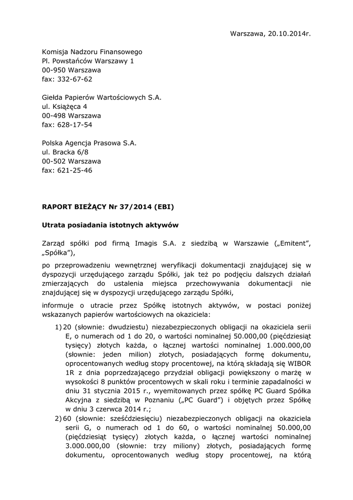Warszawa, 20.10.2014r. Komisja Nadzoru Finansowego Pl. Powstańców Warszawy 1 00-950 Warszawa fax: 332-67-62 Giełda Papierów Wartościowych S.A. ul. Książęca 4 00-498 Warszawa fax: 628-17-54 Polska Agencja Prasowa S.A. ul. Bracka 6/8 00-502 Warszawa fax: 621-25-46 RAPORT BIEŻĄCY Nr 37/2014 (EBI) Utrata posiadania istotnych aktywów Zarząd spółki pod firmą Imagis S.A. z siedzibą w Warszawie („Emitent”, „Spółka”), po przeprowadzeniu wewnętrznej weryfikacji dokumentacji znajdującej się w dyspozycji urzędującego zarządu Spółki, jak też po podjęciu dalszych działań zmierzających do ustalenia miejsca przechowywania dokumentacji nie znajdującej się w dyspozycji urzędującego zarządu Spółki, informuje o utracie przez Spółkę istotnych aktywów, w postaci poniżej wskazanych papierów wartościowych na okaziciela: 1) 20 (słownie: dwudziestu) niezabezpieczonych obligacji na okaziciela serii E, o numerach od 1 do 20, o wartości nominalnej 50.000,00 (pięćdziesiąt tysięcy) złotych każda, o łącznej wartości nominalnej 1.000.000,00 (słownie: jeden milion) złotych, posiadających formę dokumentu, oprocentowanych według stopy procentowej, na którą składają się WIBOR 1R z dnia poprzedzającego przydział obligacji powiększony o marżę w wysokości 8 punktów procentowych w skali roku i terminie zapadalności w dniu 31 stycznia 2015 r., wyemitowanych przez spółkę PC Guard Spółka Akcyjna z siedzibą w Poznaniu („PC Guard”) i objętych przez Spółkę w dniu 3 czerwca 2014 r.; 2) 60 (słownie: sześćdziesięciu) niezabezpieczonych obligacji na okaziciela serii G, o numerach od 1 do 60, o wartości nominalnej 50.000,00 (pięćdziesiąt tysięcy) złotych każda, o łącznej wartości nominalnej 3.000.000,00 (słownie: trzy miliony) złotych, posiadających formę dokumentu, oprocentowanych według stopy procentowej, na którą składają się WIBOR 1R z dnia poprzedzającego przydział obligacji powiększony o marżę w wysokości 8 punktów procentowych w skali roku i terminie zapadalności w dniu 30 września 2015 r., wyemitowanych przez PC Guard i objętych przez Spółkę w dniu 10 lipca 2014 r.; 3) 80 (słownie: osiemdziesięciu) niezabezpieczonych obligacji na okaziciela serii A, o numerach od 1 do 80, o wartości nominalnej 50.000,00 (słownie: pięćdziesiąt tysięcy) złotych każda, o łącznej wartości nominalnej 4.000.000,00 (słownie: cztery miliony) złotych, posiadających formę dokumentu, oprocentowanych według stopy procentowej, na którą składają się WIBOR 1R z dnia poprzedzającego przydział obligacji powiększony o marżę w wysokości 8 punktów procentowych w skali roku i terminie zapadalności w dniu 31 stycznia 2015 r., wyemitowanych przez spółkę CG Finanse spółka z ograniczoną odpowiedzialnością z siedzibą w Poznaniu („CG Finanse”) – będącą spółką zależną od spółki PC Guard i objętych przez Spółkę w dniu 5 czerwca 2014 r.; 4) 80 (słownie: osiemdziesięciu) niezabezpieczonych obligacji na okaziciela serii B, o numerach od 1 do 80, o wartości nominalnej 50.000,00 (słownie: pięćdziesiąt tysięcy) złotych każda, o łącznej wartości nominalnej 4.000.000,00 (słownie: cztery miliony) złotych, posiadających formę dokumentu, oprocentowanych według stopy procentowej, na którą składają się WIBOR 1R z dnia poprzedzającego przydział obligacji powiększony o marżę w wysokości 8 punktów procentowych w skali roku i terminie zapadalności w dniu 30 września 2015 r., wyemitowanych przez CG Finanse będącą spółką zależną od PC Guard i objętych przez Spółkę w dniu 10 lipca 2014 r.; Zarząd Emitenta informuje, że dokumenty obligacji, o których mowa w pkt 1) – 4) powyżej, zostały ważnie nabyte przez Emitenta (o ich objęciu przez Emitenta mowa w raporcie bieżącym nr 36/2014), jednakże dokumenty obligacji nie znajdują się w posiadaniu urzędującego zarządu Spółki. Stosownie do informacji posiadanych przez pracowników Spółki, dokumenty ww. obligacji, jako stanowiące majątek Spółki, znajdowały się w posiadaniu Prezesa Zarządu Emitenta, zawieszonego w czynnościach uchwałą Rady Nadzorczej Spółki z dnia 2 października 2014 r. (o czy mowa w raporcie bieżącym Nr 31/2014), który mimo zawieszenia go w czynnościach i wezwaniu go do przekazania Spółce (członkom Rady Nadzorczej Spółki, względnie członkom jej Zarządu, który nie zostali zawieszeni w czynnościach) dokumentów obligacji – nie przekazał tych dokumentów, jak też nie wskazał miejsca ich przechowywania. W trakcie posiedzenia Rady Nadzorczej Emitenta w dniu 16 października 2014 r., na które nie stawił się osobiście zawieszony w czynnościach Prezes Zarządu Spółki, reprezentujący go pełnomocnik przekazał Radzie Nadzorczej Spółki pisemne oświadczenie, iż: „ (…) (1) według mojej najlepszej wiedzy reprezentowany przeze mnie Marcin Niewęgłowski działając w imieniu spółki IMAGIS S.A. z siedzibą w Warszawie („Spółka”) zdeponował obligacje na okaziciela, o których mowa w skierowanym do niego przez członków Rady Nadzorczej Spółki ‘Wezwaniu’ z dnia 6 października 2014 r. w bezpiecznym miejscu, pozwalającym na zachowanie obligacji w nienaruszonym stanie,; (2) Pan Marcin Niewęgłowski z pewnością nie będzie uprawniony do posiadania informacji na temat ww. obligacji w przypadku odwołania go z funkcji Prezesa Zarządu; (…)” Jednocześnie wskazał, iż nie posiada wiedzy odnośnie miejsca zdeponowania ww. obligacji. Miejsce i podstawy zdeponowania obligacji do chwili obecnej nie zostały wskazane także bezpośrednio przez zawieszonego w czynnościach Prezesa Zarządu Spółki, pomimo wezwania go do tego na piśmie. Zarząd Emitenta wskazuje przy tym, że w posiadaniu osób wchodzących w skład jego organów (które nie są zawieszone w pełnieniu czynności), nie znajdują się żadne umowy lub dokumenty, z których wyni
