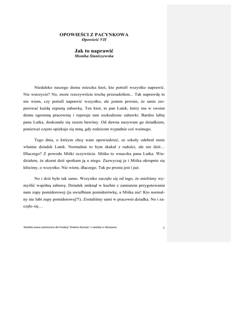 OPOWIEŚCI Z PACYNKOWA Opowieść VII Jak to naprawić Monika Staniszewska Niedaleko naszego domu mieszka ktoś, kto potrafi wszystko naprawić. Nie wierzycie? No, może rzeczywiście trochę przesadziłem... Tak naprawdę to nie wiem, czy potrafi naprawić wszystko, ale jestem pewien, że umie zreperować każdą zepsutą zabawkę. Ten ktoś, to pan Lutek, który ma w swoim domu ogromną pracownię i reperuje tam uszkodzone zabawki. Bardzo lubię pana Lutka, doskonale się razem bawimy. Od dawna nazywam go dziadkiem, ponieważ często opiekuje się mną, gdy rodzicom wypadnie coś ważnego. Tego dnia, o którym chcę wam opowiedzieć, ze szkoły odebrał mnie właśnie dziadek Lutek. Normalnie to bym skakał z radości, ale nie dziś… Dlaczego? Z powodu Miśki oczywiście. Miśka to wnuczka pana Lutka. Wiedziałem, że akurat dziś spotkam ją u niego. Zazwyczaj ja i Miśka okropnie się kłócimy, o wszystko. Nie wiem, dlaczego. Tak po prostu jest i już. No i dziś było tak samo. Wszystko zaczęło się od tego, że mieliśmy wymyślić wspólną zabawę. Dziadek zniknął w kuchni z zamiarem przygotowania nam zupy pomidorowej (ja uwielbiam pomidorówkę, a Miśka nie! Kto normalny nie lubi zupy pomidorowej?!). Zostaliśmy sami w pracowni dziadka. No i zaczęło się… Wszelkie prawa zastrzeżone dla Fundacji "Drabina Rozwoju" z siedzibą w Warszawie. 1 – Ja chcę się bawić tylko w restaurację – oświadczyła buntowniczo Miśka i od razu zmarszczyła brwi, jakby wiedziała, że się nie zgodzę. No i miała rację! Natychmiast poczułem wściekłość. – A ja chcę grać w piłkę! – krzyknąłem. Miśka nadąsała się i wycedziła przez zęby: – Albo restauracja, albo „Księżniczkowe Domino”. – Phi! Też mi pomysł! – prychnąłem. – Zabawa w księżniczki jest tylko dla dziewczyn. – No bo ja właśnie jestem dziewczyną, mądralo! I lubię się bawić w księżniczki! – wrzasnęła Miśka całkiem nie jak księżniczka. I co z taką robić? W ogóle nie dało się z nią rozmawiać, a co dopiero bawić! Kłóciliśmy się jeszcze dobre piętnaście minut, aż w końcu Miśka – jak zwykle zresztą – zaczęła ryczeć. Paweł Klimowicz 25.6.2014 16:30 – Ale z ciebie beksa – rzuciłem z pogardą i odwróciłem się do niej plecami. Usiadłem przy wielkim pudle z zepsutymi zabawkami. Czekały tu na swoją kolej, aż zręczne palce dziadka zreperują to, co uszkodzone. Wziąłem do ręki niebieskie audi. Nie miało jednego koła i było na dodatek paskudnie zarysowane. Na podwoziu dostrzegłem nasmarowane markerem imię „Krzyś”. Tak samo podpisane były jeszcze dwie mniejsze wyścigówki – czerwona z wymalowanym z boku pomarańczowo-złotym piorunem i żółta z płomienną błyskawicą. Postawiłem wyścigówki obok audi. Wyglądały razem żałośnie. Auto z piorunem miało rozbite światło i wgnieciony bok, a to z błyskawicą – wyrwane lewe drzwi i koło. – Ale was ten „Krzyś” urządził, nie ma co... – westchnąłem. Wszelkie prawa zastrzeżone dla Fundacji "Drabina Rozwoju" z siedzibą w Warszawie. 2 Komentarz [1]: Zapytaj o uczucia i potrzeby Tomka i Miśki – To nie wina Krzysia, tylko tego czerwonego gruchota – wrzasnęła nagle żółta wyścigówka. Oniemiałem ze zdumienia... Coś mi się chyba przesłyszało!? To przecież niemożliwe, żeby auta mówiły! A jednak... – Co ty wygadujesz, żółta niezdaro! – krzyczało czerwone auto, pobrzękując zderzakami. – To ty wymyśliłaś ten wyścig, kiedy Krzysia nie było w domu. I to przez ciebie spadliśmy ze schodów! Przeraziłem się nie na żarty. Oto dwie wyścigówki kłóciły się całkiem jak my, pacynki z Pacynkowa, albo jak ludzie. Jak to możliwe!? Jak to się stało, że rozumiem mowę samochodów?! „A może zostałem zamieniony w samochód?!” – pomyślałem z trwogą. Szybko dotknąłem moich nóg, żeby sprawdzić, czy nie są miękkimi oponami, a potem mocno nacisnąłem swój nos, żeby się upewnić, że nie zamienił się w samochodowy klakson! Uff! Wszystko w porządku, nadal jestem pacynką! Co za ulga! Dla pewności spojrzałem jeszcze na Miśkę. Stała jak wryta, wpatrując się w gadające samochody. Na jej twarzy malowało się niebotyczne zdumienie. Nie ulegało wątpliwości, że słyszała to samo, co ja. Tymczasem samochody kłóciły się nadal. Żółta wyścigówka zaczęła nawet pochlipywać: – To nieprawda, Piorunie, zawsze zwalasz winę na mnie, a przecież nikt cię nie zmuszał do tego wyścigu! – łkała, ocierając rzęsiste łzy ruchomymi wycieraczkami. – Mam cię dosyć, Błyskawico! – darł się rozwścieczony Piorun. – Nigdy już nie będę się z tobą ścigał! Wszelkie prawa zastrzeżone dla Fundacji "Drabina Rozwoju" z siedzibą w Warszawie. 3 – Wygląda na to, że macie do siebie sporo żalu – odezwało się niespodziewanie niebieskie audi, wyraźnie starsze od małych wyścigówek. – Krzyczycie i oskarżacie się wzajemnie. – Tak, tato – Piorun zwrócił się do niebieskiego samochodu – bo przez te głupie popisy mojej zarozumiałej siostry mam wgnieciony bok i rozbite światła! – prychnął ze złością. Paweł Klimowicz 25.6.2014 16:31 – To rzeczywiście nieprzyjemne – brak świateł i zniszczony bok. Masz żal do siostry, ponieważ to ona wymyśliła ten wyścig, który skończył się wypadkiem – powiedziało ze zrozumieniem audi. – No właśnie – żalił się dalej Piorun – ona zawsze chce mi udowodnić, że jest szybsza... i wymyśla takie trudne wyścigi. – Owszem, wymyślam trudne wyścigi – krzyknęła żółta wyścigówka, patrząc z wyrzutem na brata – ale tylko dla ciebie, Piorunie! Bo w łatwych wcale byś nie wziął udziału! Jesteś przecież starszy i szybszy, to ja jestem zawsze ta wolniejsza – chlipnęła. – A ja bardzo lubię się z tobą ścigać – dodała łamiącym się głosem, a jej brat ze zdziwienia zamrugał uszkodzonymi świa