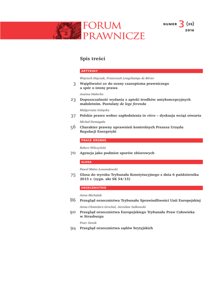 numer 3 (35) 2016 Spis treści artykuły Wojciech Dajczak, Franciszek Longchamps de Bérier 3 Wątpliwości co do oceny czasopisma prawniczego a spór o istotę prawa Joanna Haberko 23 Dopuszczalność wydania z apteki środków antykoncepcyjnych małoletnim. Postulaty de lege ferenda Małgorzata Gałązka 37 Polskie prawo wobec zapłodnienia in vitro – dyskusja wciąż otwarta Michał Domagała 56 Charakter prawny uprawnień kontrolnych Prezesa Urzędu Regulacji Energetyki prace drobne Robert Wilczyński 70 Agencja jako podmiot sporów zbiorowych glosa Paweł Malec-Lewandowski 75 Glosa do wyroku Trybunału Konstytucyjnego z dnia 6 października 2015 r. (sygn. akt SK 54/13) orzecznictwo Anna Michalak 86 Przegląd orzecznictwa Trybunału Sprawiedliwości Unii Europejskiej 90 Anna Chmielarz‑Grochal, Jarosław Sułkowski Przegląd orzecznictwa Europejskiego Trybunału Praw Człowieka w Strasburgu Piotr Sitnik 94 Przegląd orzecznictwa sądów brytyjskich Zasady składania materiałów do „Forum Prawniczego” Redakcja „Forum Prawniczego” przyjmuje następujące teksty: 1) artykuły – materiały powinny mieć objętość do 60 000 znaków. Do artykułu należy dołączyć krótkie streszczenie w języku angielskim (maksymalnie 1500 znaków). 2) artykuły recenzyjne – powinny dotyczyć publikacji, które ukazały się nie wcześniej niż rok (w przypadku publikacji polskich) lub dwa lata (w przypadku publikacji zagranicznych) przed oddaniem artykułu do redakcji. Artykuł recenzyjny powinien mieć objętość do 20 000 znaków. 3) glosy – powinny dotyczyć orzeczeń, które w istotny sposób rozwijają lub zmieniają dotychczasową linię orzecznictwa, a także orzeczeń podejmujących problemy dotychczas niestanowiące przedmiotu zainteresowania judykatury. Glosy powinny mieć objętość do 30 000 znaków. Prosimy także o dołączenie zdjęcia oraz krótkiej notki biograficznej o autorze (imię i nazwisko, stopnie i tytuły naukowe oraz zawodowe, dorobek naukowy, zajmowane stanowiska). Materiały należy przesyłać w formie elektronicznej na adres: [email protected]. Teksty składane do redakcji podlegają wewnętrznej procedurze oceny, stanowiącej podstawę decyzji o przyjęciu albo odrzuceniu tekstu. Procedurze oceny wskazanej wyżej nie podlegają: polemiki z recenzjami, oświadczenia, sprawozdania, nekrologi. Nie recenzujemy również tekstów zamówionych przez redakcję, tj.: artykułów wstępnych, wywiadów oraz przeglądów orzecznictwa. Numer 3 (35) | 2016 Dwumiesięcznik ISSN: 2081-688X wydawca Fundacja „Utriusque Iuris” ul. Dobra 27/35 00-344 Warszawa rada programowa Pr ze wo dnic zący: prof. Jer z y Stelmach – Uniwers y tet Jagielloński prof. Martin Avenarius – Uniwersytet w Kolonii (Niemcy) prof. Petr Blaho – Uniwersytet Trnawski (Słowacja) prof. Bartosz Brożek – Uniwersytet Jagielloński prof. Zbigniew Cieślak – Uniwersytet Kardynała Stefana Wyszyńskiego prof. Tomasz Giaro – Uniwersytet Warszawski prof. Joseph Hoffmann – Uniwersytet Indiany (USA) prof. Sang Yong Kim – Uniwers y tet Koreańsk i (Korea Południowa) prof. Małgorzata Korzycka – Uniwersytet Warszawski prof. Jarosław Majewski – Uniwersytet Kardynała Stefana Wyszyńskiego prof. Marek Michalski – Uniwersytet Kardynała Stefana Wyszyńskiego prof. Artur Nowak‑Far – Szkoła Główna Handlowa prof. Aurelia Nowicka – Uniwersytet im. Adama Mickiewicza w Poznaniu prof. Jerzy Pisuliński – Uniwersytet Jagielloński prof. Michał Romanowski – Uniwersytet Warszawski prof. Grażyna Skąpska – Uniwersytet Jagielloński prof. Andrzej Skoczylas – Uniwersytet im. Adama Mickiewicza w Poznaniu prof. Bogdan Szlachta – Uniwersytet Jagielloński prof. Piotr Tuleja – Uniwersytet Jagielloński prof. Daniil Tuzov – Uniwersytet Państwowy w St. Petersburgu ks. prof. Krzysztof Warchałowski – Uniwersytet Kardynała Stefana Wyszyńskiego prof. Paweł Wiliński – Uniwersytet im. Adama Mickiewicza w Poznaniu zespół redakcyjny Redaktor naczelny: prof. Wojciech Dajczak – Uniwersytet im. Adama Mickiewicza w Poznaniu Sekretarz redakcji: dr Krzysztof Szczucki – Uniwersytet Warszawski dr Jan Andrzejewski – Uniwersytet im. Adama Mickiewicza w Poznaniu Redaktorzy tematyczni: ks. prof. Franciszek Longchamps de Bérier – historia i filozofia prawa – Uniwersytet Jagielloński prof. UW dr hab. Michał Królikowski – prawo karne – Uniwersytet Warszawski dr Adam Szafrański – prawo administracyjne i konstytucyjne – Uniwersytet Warszawski prof. UW dr hab. Leszek Bosek – prawo prywatne – Uniwersytet Warszawski opracowanie redakcyjne Alicja Dąbrowska-Nowacka Skład: Janusz Świnarski Przekład streszczeń: Piotr Sitnik Projekt graficzny: item:grafika adres redakcji Fundacja „Utriusque Iuris” ul. Dobra 27/35 00-344 Warszawa www.forumprawnicze.eu [email protected] Wersja papierowa „Forum Prawniczego” ma charakter pierwotny. Nakład 100 egz. Wojciech Dajczak, Franciszek Longchamps de Bérier Wątpliwości co do oceny czasopisma prawniczego a spór o istotę prawa Wojciech Dajczak Profesor nauk prawnych, kierownik Katedry Prawa Rzymskiego i Historii Prawa Sądowego Uniwersytetu im. Adama Mickiewicza, członek Komitetu Ewaluacji Jednostek Na- ukowych i Komitetu Nauk Prawnych Polskiej Akademii Nauk. Ks. Franciszek Longchamps de Bérier Second Thoughts about the Evaluation of Legal Journals and the Dispute on the Essence of Law The Polish Ministry of Science and Higher Education made public a new evaluation of legal journals at the end of 2015. How much algorithmic and quantitative criteria of the evaluation are relevant to what is expected from legal journals? The answer could be tendered only by a resolution of the dispute on the essence of law. In order to start with the general criteria concerning the evaluation of legal science, the authors focus on two issues. They present how productive the tradition of Roman law is as against contemporary continenta