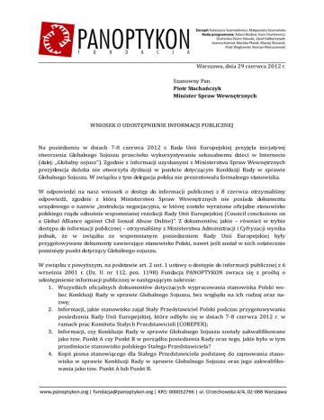 Warszawa, dnia 29 czerwca 2012 r. Szanowny Pan Piotr Stachańczyk Minister Spraw Wewnętrznych WNIOSEK O UDOSTĘPNIENIE INFORMACJI PUBLICZNEJ Na posiedzeniu w dniach 7-8 czerwca 2012 r. Rada Unii Europejskiej przyjęła inicjatywę stworzenia Globalnego Sojuszu przeciwko wykorzystywaniu seksualnemu dzieci w Internecie (dalej: „Globalny sojusz”). Zgodnie z informacji uzyskanymi z Ministerstwa Spraw Wewnętrznych prezydencja duńska nie otworzyła dyskusji w punkcie dotyczącym Konkluzji Rady w sprawie Globalnego Sojuszu. W związku z tym delegacja polska nie prezentowała formalnego stanowiska. W odpowiedzi na nasz wniosek o dostęp do informacji publicznej z 8 czerwca otrzymaliśmy odpowiedź, zgodnie z którą Ministerstwo Spraw Wewnętrznych nie posiada dokumentu urzędowego o nazwie „instrukcja negocjacyjna, w której zostało wyrażone oficjalne stanowisko polskiego rządu odnośnie wspomnianej rezolucji Rady Unii Europejskiej (Council conclusions on a Global Alliance against Chil Sexual Abuse Online)”. Z dokumentów, jakie – również w trybie dostępu do informacji publicznej – otrzymaliśmy z Ministerstwa Administracji i Cyfryzacji wynika jednak, że w związku ze wspomnianym posiedzeniem Rady Unii Europejskiej były przygotowywane dokumenty zawierające stanowisko Polski, nawet jeśli został w nich ostatecznie pominięty punkt dotyczący Globalnego sojuszu. W związku z powyższym, na podstawie art. 2 ust. 1 ustawy o dostępie do informacji publicznej z 6 września 2001 r. (Dz. U. nr 112, poz. 1198) Fundacja PANOPTYKON zwraca się z prośbą o udostępnienie informacji publicznej w następującym zakresie: 1. Wszystkich oficjalnych dokumentów dotyczących wypracowania stanowiska Polski wobec Konkluzji Rady w sprawie Globalnego Sojuszu, bez względu na ich rodzaj oraz nazwę; 2. Informacji, jakie stanowisko zajął Stały Przedstawiciel Polski podczas przygotowywania posiedzenia Rady Unii Europejskiej, które odbyło się w dniach 7-8 czerwca 2012 r. w ramach prac Komitetu Stałych Przedstawicieli (COREPER); 3. Informacji, czy Konkluzje Rady w sprawie Globalnego Sojuszu zostały zakwalifikowane jako tzw. Punkt A czy Punkt B w porządku posiedzenia Rady oraz tego, jakie było w tym przedmiocie stanowisko polskiego Stałego Przedstawiciela? 4. Kopii pisma stanowiącego dla Stałego Przedstawiciela podstawę do zajmowania stanowiska w sprawie Konkluzji Rady w sprawie Globalnego Sojuszu oraz jego zakwalifikowania jako tzw. Punkt A lub Punkt B. Jednocześnie prosimy o udostępnienie informacji, czy po wspomnianym posiedzeniu Rady odbyło się spotkanie przedstawicieli Komitetu do Spraw Europejskich i Komitetu Rady Ministrów do Spraw Cyfryzacji, którego przedmiotem były jakiekolwiek ustalenia dotyczące stanowiska rządu w sprawie blokowania stron internetowych. Jeśli nie, czy takie spotkanie jest planowane? Jeśli do takiego spotkania doszło prosimy o informację, jakie były jego konkluzje. Prosimy o przesłanie informacji drogą elektroniczną w otwartym formacie umożliwiającym kopiowanie (pdf, odt, doc lub rtf) na adres mailowy: [email protected]. W imieniu Fundacji PANOPTYKON, Katarzyna Szymielewicz