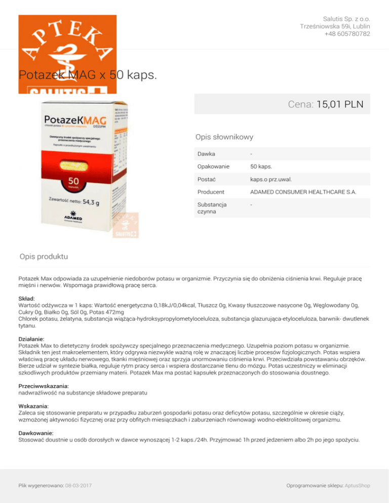 Salutis Sp. z o.o. Trześniowska 59i, Lublin +48 605780782 Potazek MAG x 50 kaps. Cena: 15,01 PLN Opis słownikowy Dawka - Opakowanie 50 kaps. Postać kaps.o prz.uwal. Producent ADAMED CONSUMER HEALTHCARE S.A. Substancja czynna - Opis produktu Potazek Max odpowiada za uzupełnienie niedoborów potasu w organizmie. Przyczynia się do obniżenia ciśnienia krwi. Reguluje pracę mięśni i nerwów. Wspomaga prawidłową pracę serca. Skład: Wartość odżywcza w 1 kaps: Wartość energetyczna 0,18kJ/0,04kcal, Tłuszcz 0g, Kwasy tłuszczowe nasycone 0g, Węglowodany 0g, Cukry 0g, Białko 0g, Sól 0g, Potas 472mg Chlorek potasu, żelatyna, substancja wiążąca-hydroksypropylometyloceluloza, substancja glazurująca-etyloceluloza, barwnik- dwutlenek tytanu. Działanie: Potazek Max to dietetyczny środek spożywczy specjalnego przeznaczenia medycznego. Uzupełnia poziom potasu w organizmie. Składnik ten jest makroelementem, który odgrywa niezwykle ważną rolę w znaczącej liczbie procesów fizjologicznych. Potas wspiera właściwą pracę układu nerwowego, tkanki mięśniowej oraz sprzyja unormowaniu ciśnienia krwi. Przeciwdziała powstawaniu obrzęków. Bierze udział w syntezie białka, reguluje rytm pracy serca i wspiera dostarczanie tlenu do mózgu. Potas uczestniczy w eliminacji szkodliwych produktów przemiany materii. Potazek Max ma postać kapsułek przeznaczonych do stosowania doustnego. Przeciwwskazania: nadwrażliwość na substancje składowe preparatu Wskazania: Zaleca się stosowanie preparatu w przypadku zaburzeń gospodarki potasu oraz deficytów potasu, szczególnie w okresie ciąży, wzmożonej aktywności fizycznej oraz przy obfitych miesiączkach i zaburzeniach równowagi wodno-elektrolitowej organizmu. Dawkowanie: Stosować doustnie u osób dorosłych w dawce wynoszącej 1-2 kaps./24h. Przyjmować 1h przed jedzeniem albo 2h po jego spożyciu. Plik wygenerowano: 08-03-2017 Oprogramowanie sklepu: AptusShop Salutis Sp. z o.o. Trześniowska 59i, Lublin +48 605780782 Przed użyciem zapoznaj się z ulotką dołączoną do opakowania, która zawiera wskazania, przeciwwskazania, dane dotyczące działań niepożądanych i dawkowanie oraz informacje dotyczące stosowania i przechowywania produktu leczniczego, bądź skonsultuj się z lekarzem lub farmaceutą, gdyż każdy lek niewłaściwie stosowany zagraża Twojemu życiu lub zdrowiu. Plik wygenerowano: 08-03-2017 Powered by TCPDF (www.tcpdf.org) Oprogramowanie sklepu: AptusShop