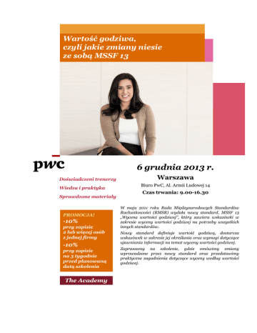 Wartość godziwa, czyli jakie zmiany niesie ze sobą MSSF 13 6 grudnia 2013 r. • Doświadczeni trenerzy • Wiedza i praktyka • Sprawdzone materiały PROMOCJA! -10% przy zapisie 2 lub więcej osób z jednej firmy -10% przy zapisie na 3 tygodnie przed planowaną datą szkolenia The Academy Warszawa Biuro PwC, Al. Armii Ludowej 14 Czas trwania: 9.00-16.30 W maju 2011 roku Rada Międzynarodowych Standardów Rachunkowości (RMSR) wydała nowy standard, MSSF 13 „Wycena wartości godziwej”, który zawiera wskazówki w zakresie wyceny wartości godziwej na potrzeby wszystkich innych standardów. Nowy standard definiuje wartość godziwą, dostarcza wskazówek w zakresie jej określania oraz wymogi dotyczące ujawniania informacji na temat wyceny wartości godziwej. Zapraszamy na szkolenie, gdzie omówimy zmiany wprowadzone przez nowy standard oraz przedstawimy praktyczne zagadnienia dotyczące wyceny według wartości godziwej. PROGRAM SZKOLENIA: Część księgowa 1. Definicja wartości godziwej 2. Czynniki uwzględniane przy ustaleniu wartości godziwej: Aktywa lub zobowiązania Rynek Uczestnicy rynku Cena 3. Dodatkowe kwestie specyficzne dla rodzajów pozycji: Aktywa niefinansowe Instrumenty finansowe Zobowiązania (finansowe i niefinansowe) oraz własne instrumenty kapitałowe 4. Hierarchia wartości godziwej Chcesz wiedzieć więcej? www.pwcacademy.pl [email protected] Justyna Denham Koordynator ds. szkoleń Tel.: +48 22 523 4455 Katarzyna Korneluk Koordynator ds. szkoleń Tel.: +48 22 746 7064 Lokalizacja PwC Polska Sp. z o.o. Al. Armii Ludowej 14 00-638 Warszawa (metro Politechnika) 5. Podejścia do wyceny: podejście rynkowe Znajdź nas na Facebooku podejście kosztowe Cena dla firm: podejście przychodowe 6. Ujawnienia 695 PLN 7. Studium przypadków +23% VAT za osobę Metody wyceny 1. Cena obejmuje materiały, przerwy kawowe oraz lunch Wprowadzenie do najczęściej stosowanych metod wyceny DCF Podejście rynkowe Podejście kosztowe 2. 3. Wyceny w praktyce Atrakcyjne rabaty -10% Wybór podejścia do wyceny – wady i zalety metod przy zapisie 2 lub więcej osób Na co uważać - założenia mające największy wpływ na wynik wyceny -10% Studium przypadków przy zapisie na 3 tygodnie przed planowaną datą szkolenia Wycena nieruchomości 1. Jak należy rozumieć wartość godziwą nieruchomości? PROWADZĄCY: 2. Różne podejścia do wyceny nieruchomości - na co zwrócić uwagę w raportach z wyceny? 3. Sposoby prezentowania raportów na potrzeby wyceny dla sprawozdań finansowych. Agata Sajewicz, wykładowca Akademii PwC. Agata poprzednio była konsultantem pracującym w ramach Zespołu Usług Doradztwa Księgowego w PwC dla Europy Środkowo-Wschodniej zajmującego się doradztwem w zakresie Międzynarodowych Standardów Sprawozdawczości Finansowej, jak i polskich zasad rachunkowości. Warunki uczestnictwa Prosimy o przesłanie formularza zgłoszeniowego na podany adres e-mail lub numer fax. Termin nadsyłania zgłoszeń upływa 5 dni przed szkoleniem. Szczegółowe informacje administracyjne zostaną wysłane nie później niż 3 dni przed datą szkolenia. Leszek Orłowski, starszy konsultant w dziale usług doradczych. Leszek specjalizuje się w projektach z zakresu szacowania wartości, modelowania finansowego. Katarzyna Kowalczyk, menedżer w dziale usług doradczych. Katarzyna specjalizuje się w wycenach nieruchomości. Przeprowadziła wiele wycen różnego typu nieruchomości oraz projektów deweloperskich w Polsce i innych krajach Europy Centralnej i Wschodniej.