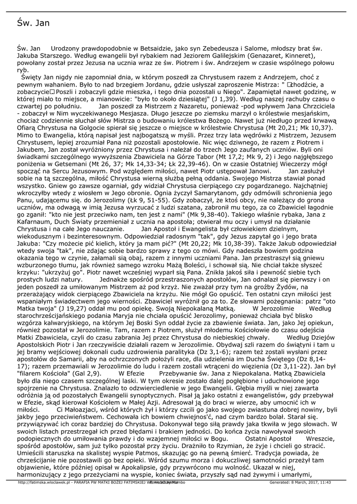 Św. Jan Św. Jan Urodzony prawdopodobnie w Betsaidzie, jako syn Zebedeusza i Salome, młodszy brat św. Jakuba Starszego. Według ewangelii był rybakiem nad Jeziorem Galilejskim (Genazaret, Kinneret), powołany został przez Jezusa na ucznia wraz ze św. Piotrem i św. Andrzejem w czasie wspólnego połowu ryb. Święty Jan nigdy nie zapomniał dnia, w którym poszedł za Chrystusem razem z Andrzejem, choć z pewnym wahaniem. Było to nad brzegiem Jordanu, gdzie usłyszał zaproszenie Mistrza: " «chodźcie, a zobaczycie». Poszli i zobaczyli gdzie mieszka, i tego dnia pozostali u Niego". Zapamiętał nawet godzinę, w której miało to miejsce, a mianowicie: "było to około dziesiątej" (J 1,39). Według naszej rachuby czasu o czwartej po południu. Jan poszedł za Mistrzem z Nazaretu, ponieważ -pod wpływem Jana Chrzciciela - zobaczył w Nim wyczekiwanego Mesjasza. Długo jeszcze po ziemsku marzył o królestwie mesjańskim, chociaż codziennie słuchał słów Mistrza o budowaniu królestwa Bożego. Nawet już niedługo przed krwawą Ofiarą Chrystusa na Golgocie spierał się jeszcze o miejsce w królestwie Chrystusa (Mt 20,21; Mk 10,37). Mimo to Ewangelia, którą napisał jest najbogatszą w myśli. Przez trzy lata wędrówki z Mistrzem, Jezusem Chrystusem, lepiej zrozumiał Pana niż pozostali apostołowie. Nic więc dziwnego, że razem z Piotrem i Jakubem, Jan został wyróżniony przez Chrystusa i należał do trzech Jego zaufanych uczniów. Byli oni świadkami szczególnego wywyższenia Zbawiciela na Górze Tabor (Mt 17,2; Mk 9, 2) i Jego najgłębszego poniżenia w Getsemani (Mt 26, 37; Mk 14,33-34; Łk 22,39-46). On w czasie Ostatniej Wieczerzy mógł spocząć na Sercu Jezusowym. Pod względem miłości, nawet Piotr ustępował Janowi. Jan zasłużył sobie na tą szczególna, miłość Chrystusa wierną służbą pełną oddania. Swojego Mistrza stawiał ponad wszystko. Gniew go zawsze ogarniał, gdy widział Chrystusa cierpiącego czy pogardzanego. Najchątniej wkroczyłby wtedy z wiosłem w Jego obronie. Ognia życzył Samarytanom, gdy odmówili schronienia jego Panu, udającemu się. do Jerozolimy (Łk 9, 51-55). Gdy zobaczył, że ktoś obcy, nie należący do grona uczniów, ma odwagą w imią Jezusa wyrzucać z ludzi szatana, zabronił mu tego, za co Zbawiciel łagodnie go zganił: "kto nie jest przeciwko nam, ten jest z nami" (Mk 9,38-40). Takiego właśnie rybaka, Jana z Kafarnaum, Duch Światy przemieniał z ucznia na apostoła; otwierał mu oczy i umysł na działanie Chrystusa i na całe Jego nauczanie. Jan Apostoł i Ewangelista był człowiekiem dzielnym, wiekodusznym i bezinteresownym. Odpowiedział radosnym "tak", gdy Jezus zapytał go i jego brata Jakuba: "Czy możecie pić kielich, który ja mam pić?" (Mt 20,22; Mk 10,38-39). Także Jakub odpowiedział wtedy swoja "tak", nie zdając sobie bardzo sprawy z tego co mówi. Gdy nadeszła bowiem godzina okazania tego w czynie, załamali sią obaj, razem z innymi uczniami Pana. Jan przestraszył sią gniewu wzburzonego tłumu, jak również samego wzroku Mażą Boleści, i schował sią. Nie chciał także słyszeć krzyku: "ukrzyżuj go". Piotr nawet wcześniej wyparł sią Pana. Znikła jakoś siła i pewność siebie tych prostych ludzi natury. Jednakże spośród przestraszonych apostołów, Jan odnalazł się pierwszy i on jeden poszedł za umiłowanym Mistrzem aż pod krzyż. Nie zważał przy tym na groźby Żydów, na przerażający widok cierpiącego Zbawiciela na krzyżu. Nie mógł Go opuścić. Ten ostatni czyn miłości jest wspaniałym świadectwem jego wierności. Zbawiciel wyróżnił go za to. Ze słowami pożegnania: patrz "oto Matka twoja" (J 19,27) oddał mu pod opiekę. Swoją Niepokalaną Matką. W Jerozolimie Według starochrześcijańskiego podania Maryja nie chciała opuścić Jerozolimy, ponieważ chciała być blisko wzgórza kalwaryjskiego, na którym Jej Boski Syn oddał życie za zbawienie świata. Jan, jako Jej opiekun, również pozostał w Jerozolimie. Tam, razem z Piotrem, służył młodemu Kościołowie do czasu odejścia Matki Zbawiciela, czyli do czasu zabrania Jej przez Chrystusa do niebieskiej chwały. Według Dziejów Apostolskich Piotr i Jan rzeczywiście działali razem w Jerozolimie. Obydwaj szli razem do świątyni i tam u jej bramy wejściowej dokonali cudu uzdrowienia paralityka (Dz 3,1-6); razem też zostali wysłani przez apostołów do Samarii, aby na ochrzczonych położyli race, dla udzielenia im Ducha Świętego (Dz 8,1417); razem przemawiali w Jerozolimie do ludu i razem zostali wtrąceni do więzienia (Dz 3,11-22). Jan był "filarem Kościoła" (Gal 2,9). W Efezie Przebywanie św. Jana z Niepokalana. Matką Zbawiciela było dla niego czasem szczególnej laski. W tym okresie zostało dalej pogłębione i uduchowione jego spojrzenie na Chrystusa. Znalazło to odzwierciedlenie w jego Ewangelii. Głębia myśli w niej zawarta odróżnia ją od pozostałych Ewangelii synoptycznych. Pisał ją jako ostatni z ewangelistów, gdy przebywał w Efezie, skąd kierował Kościołem w Małej Azji. Adresował ją do braci w wierze, aby umocnić ich w miłości. Ci Małoazjaci, wśród których żył i którzy czcili go jako swojego zwiastuna dobrej nowiny, byli jakby jego przeciwieństwem. Cechowała ich bowiem chwiejnos'ć, nad czym bardzo bolał. Starał się. przywiązywać ich coraz bardziej do Chrystusa. Dokonywał tego siłą prawdy jaka tkwiła w jego słowach. W swoich listach przestrzegał ich przed błędami i brakiem jedności. Do końca życia nawoływał swoich podopiecznych do umiłowania prawdy i do wzajemnej miłości w Bogu. Ostatni Apostoł Wreszcie, spośród apostołów, sam już tylko pozostał przy życiu. Drażniło to Rzymian, że żyje i chcieli go stracić. Umieścili staruszka na skalistej wyspie Patmos, skazując go na pewną śmierć. Tradycja powiada, że chrześcijanie nie pozostawili go bez opieki. Wśród szumu morza i dokuczliwej samotn