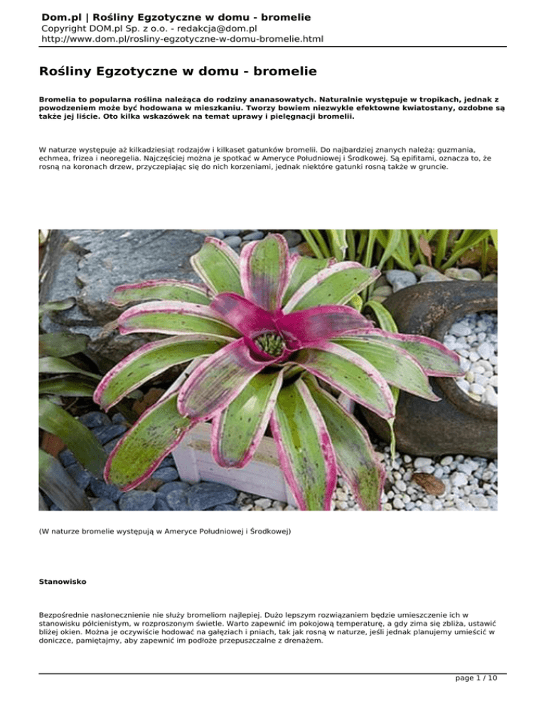 Dom.pl | Rośliny Egzotyczne w domu - bromelie Copyright DOM.pl Sp. z o.o. - [email protected] http://www.dom.pl/rosliny-egzotyczne-w-domu-bromelie.html Rośliny Egzotyczne w domu - bromelie Bromelia to popularna roślina należąca do rodziny ananasowatych. Naturalnie występuje w tropikach, jednak z powodzeniem może być hodowana w mieszkaniu. Tworzy bowiem niezwykle efektowne kwiatostany, ozdobne są także jej liście. Oto kilka wskazówek na temat uprawy i pielęgnacji bromelii. W naturze występuje aż kilkadziesiąt rodzajów i kilkaset gatunków bromelii. Do najbardziej znanych należą: guzmania, echmea, frizea i neoregelia. Najczęściej można je spotkać w Ameryce Południowej i Środkowej. Są epifitami, oznacza to, że rosną na koronach drzew, przyczepiając się do nich korzeniami, jednak niektóre gatunki rosną także w gruncie. (W naturze bromelie występują w Ameryce Południowej i Środkowej) Stanowisko Bezpośrednie nasłonecznienie nie służy bromeliom najlepiej. Dużo lepszym rozwiązaniem będzie umieszczenie ich w stanowisku półcienistym, w rozproszonym świetle. Warto zapewnić im pokojową temperaturę, a gdy zima się zbliża, ustawić bliżej okien. Można je oczywiście hodować na gałęziach i pniach, tak jak rosną w naturze, jeśli jednak planujemy umieścić w doniczce, pamiętajmy, aby zapewnić im podłoże przepuszczalne z drenażem. page 1 / 10 Dom.pl | Rośliny Egzotyczne w domu - bromelie Copyright DOM.pl Sp. z o.o. - [email protected] http://www.dom.pl/rosliny-egzotyczne-w-domu-bromelie.html (Bromelie preferują stanowiska półcieniste) Podlewanie Liście bromelii ułożone są w rozetę, która w środowisku naturalnym pomaga im gromadzić wodę z deszczu i mgły. To właśnie w środek tej rozety należy wlać wodę, gdy podlewamy roślinę. Pamiętajmy też, ze ziemia nie powinna tracić wilgotności, ale nie może też być zbyt mokra. Zimą podlewanie należy ograniczyć, za to od marca do października bromeliom należy podawać nawóz dla roślin kwitnących. Rozpuszczamy go jednak w dwu- lub trzykrotnie większej ilości wody, niż jest to zasugerowane na opakowaniu. page 2 / 10 Dom.pl | Rośliny Egzotyczne w domu - bromelie Copyright DOM.pl Sp. z o.o. - [email protected] http://www.dom.pl/rosliny-egzotyczne-w-domu-bromelie.html (Dzięki swojej budowie bromelie mogą gromadzić wodę z deszczu i mgły) Problemy z pielęgnacją Co może się stać, jeśli nie będziemy przestrzegali powyższych wskazówek? Zbytnie nasłonecznienie może sprawić, że dojdzie do poparzeń liści rośliny. Gdy przesadzimy z ilością wody, może się natomiast okazać, że dojdzie do zmian gnilnych. Z kolei, gdy zaniedbamy je w kwestii nawożenia, mogą łatwo paść ofiarą szkodników, takich jak wełnowce, przędziorki, tarczniki, czy page 3 / 10 Dom.pl | Rośliny Egzotyczne w domu - bromelie Copyright DOM.pl Sp. z o.o. - [email protected] http://www.dom.pl/rosliny-egzotyczne-w-domu-bromelie.html wciornastki. Rozmnażanie Rozmnażanie bromelii nie jest łatwe. Można spróbować oddzielić odrosty od rozety macierzystej i ukorzenić, jednak szanse na zakwitnięcie tak uzyskanej rośliny są nikłe. Jednym ze sposobów na pobudzenie jej do kwitnienie jest umieszczenie jej w worku foliowym razem z dojrzałymi owocami. Wydzielają one etylen, który pomaga w zawiązywaniu pąków kwiatowych. Otrzymane w ten sposób kwiaty nie są jednak zbyt efektowne. Zobacz także: Paprotki w doniczkach – jak o nie zadbać? Według obiegowej opinii uprawa paproci w doniczce jest dosyć skomplikowana. Tak naprawdę nie ma w tym jednak zbyt wiele prawdy. Zastanówmy się – czy gdyby gatunek ten nie był odporny na wiele czynników, przetrwałby tak wiele lat? Paprocie towarzyszą bowiem człowiekowi niemal od zawsze. Rośliny doniczkowe: difenbachia – popularna ozdoba domu Difenbachia jest bardzo znaną i lubianą rośliną doniczkową. Swoją popularność zawdzięcza głównie pięknym liściom. Aby mogła godnie pełnić funkcję ozdoby mieszkania należy odpowiednio ją pielęgnować. page 4 / 10 Dom.pl | Rośliny Egzotyczne w domu - bromelie Copyright DOM.pl Sp. z o.o. - [email protected] http://www.dom.pl/rosliny-egzotyczne-w-domu-bromelie.html page 5 / 10 Dom.pl | Rośliny Egzotyczne w domu - bromelie Copyright DOM.pl Sp. z o.o. - [email protected] http://www.dom.pl/rosliny-egzotyczne-w-domu-bromelie.html Rośliny Egzotyczne – uprawa hibiskusa w doniczce page 6 / 10 Dom.pl | Rośliny Egzotyczne w domu - bromelie Copyright DOM.pl Sp. z o.o. - [email protected] http://www.dom.pl/rosliny-egzotyczne-w-domu-bromelie.html Łatwość uprawy, oraz częste i efektowne kwitnienie – oto główne zalety hibiskusa. Dawniej traktowano go jak typową roślinę pokojową, dzisiaj rośnie także w ogrodach i na tarasach. Oto kilka wskazówek dotyczących uprawy hibiskusa w doniczce. page 7 / 10 Dom.pl | Rośliny Egzotyczne w domu - bromelie Copyright DOM.pl Sp. z o.o. - [email protected] http://www.dom.pl/rosliny-egzotyczne-w-domu-bromelie.html page 8 / 10 Dom.pl | Rośliny Egzotyczne w domu - bromelie Copyright DOM.pl Sp. z o.o. - [email protected] http://www.dom.pl/rosliny-egzotyczne-w-domu-bromelie.html Rośliny Egzotyczne – dracena w doniczce Dracena to jedna z najpopularniejszych roślin doniczkowych. Jest bardzo dekoracyjna, a zarazem uniwersalna – pasuje do większości aranżacji. Choć pozornie uznawana jest za łatwą w uprawie, w praktyce może przysporzyć pewnych problemów. Oto kilka wskazówek dotyczących jej hodowli w domowym zaciszu. page 9 / 10 Dom.pl | Rośliny Egzotyczne w domu - bromelie Copyright DOM.pl Sp. z o.o. - [email protected] http://www.dom.pl/rosliny-egzotyczne-w-domu-bromelie.html