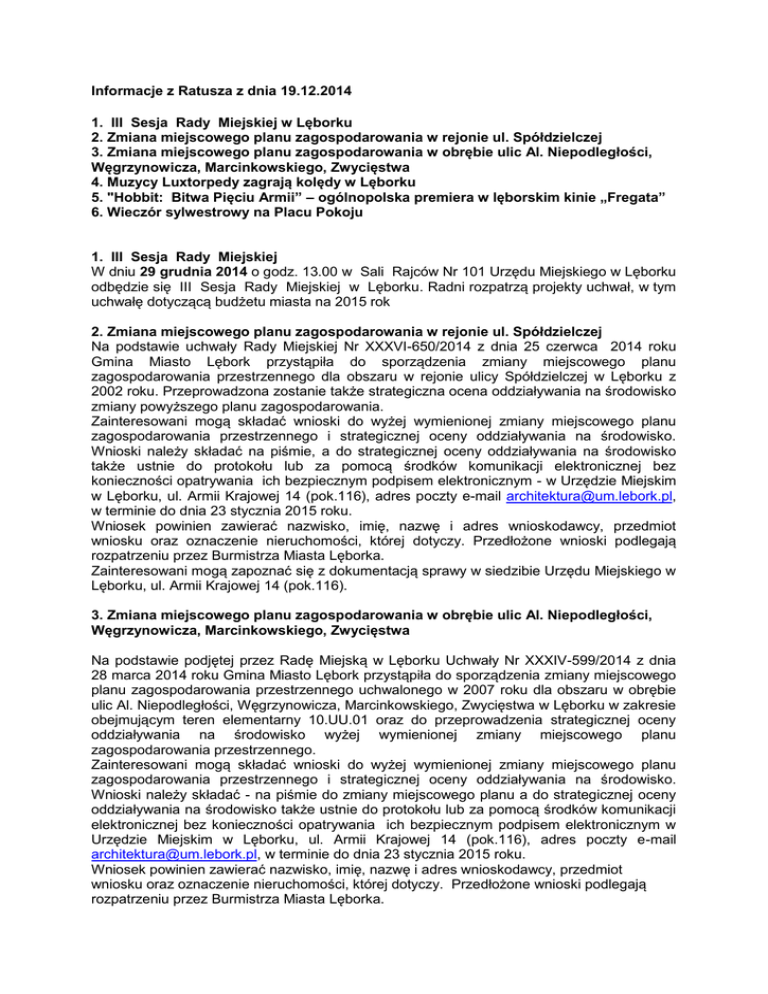 Informacje z Ratusza z dnia 19.12.2014 1. III Sesja Rady Miejskiej w Lęborku 2. Zmiana miejscowego planu zagospodarowania w rejonie ul. Spółdzielczej 3. Zmiana miejscowego planu zagospodarowania w obrębie ulic Al. Niepodległości, Węgrzynowicza, Marcinkowskiego, Zwycięstwa 4. Muzycy Luxtorpedy zagrają kolędy w Lęborku 5. "Hobbit: Bitwa Pięciu Armii” – ogólnopolska premiera w lęborskim kinie „Fregata” 6. Wieczór sylwestrowy na Placu Pokoju 1. III Sesja Rady Miejskiej W dniu 29 grudnia 2014 o godz. 13.00 w Sali Rajców Nr 101 Urzędu Miejskiego w Lęborku odbędzie się III Sesja Rady Miejskiej w Lęborku. Radni rozpatrzą projekty uchwał, w tym uchwałę dotyczącą budżetu miasta na 2015 rok 2. Zmiana miejscowego planu zagospodarowania w rejonie ul. Spółdzielczej Na podstawie uchwały Rady Miejskiej Nr XXXVI-650/2014 z dnia 25 czerwca 2014 roku Gmina Miasto Lębork przystąpiła do sporządzenia zmiany miejscowego planu zagospodarowania przestrzennego dla obszaru w rejonie ulicy Spółdzielczej w Lęborku z 2002 roku. Przeprowadzona zostanie także strategiczna ocena oddziaływania na środowisko zmiany powyższego planu zagospodarowania. Zainteresowani mogą składać wnioski do wyżej wymienionej zmiany miejscowego planu zagospodarowania przestrzennego i strategicznej oceny oddziaływania na środowisko. Wnioski należy składać na piśmie, a do strategicznej oceny oddziaływania na środowisko także ustnie do protokołu lub za pomocą środków komunikacji elektronicznej bez konieczności opatrywania ich bezpiecznym podpisem elektronicznym - w Urzędzie Miejskim w Lęborku, ul. Armii Krajowej 14 (pok.116), adres poczty e-mail [email protected], w terminie do dnia 23 stycznia 2015 roku. Wniosek powinien zawierać nazwisko, imię, nazwę i adres wnioskodawcy, przedmiot wniosku oraz oznaczenie nieruchomości, której dotyczy. Przedłożone wnioski podlegają rozpatrzeniu przez Burmistrza Miasta Lęborka. Zainteresowani mogą zapoznać się z dokumentacją sprawy w siedzibie Urzędu Miejskiego w Lęborku, ul. Armii Krajowej 14 (pok.116). 3. Zmiana miejscowego planu zagospodarowania w obrębie ulic Al. Niepodległości, Węgrzynowicza, Marcinkowskiego, Zwycięstwa Na podstawie podjętej przez Radę Miejską w Lęborku Uchwały Nr XXXIV-599/2014 z dnia 28 marca 2014 roku Gmina Miasto Lębork przystąpiła do sporządzenia zmiany miejscowego planu zagospodarowania przestrzennego uchwalonego w 2007 roku dla obszaru w obrębie ulic Al. Niepodległości, Węgrzynowicza, Marcinkowskiego, Zwycięstwa w Lęborku w zakresie obejmującym teren elementarny 10.UU.01 oraz do przeprowadzenia strategicznej oceny oddziaływania na środowisko wyżej wymienionej zmiany miejscowego planu zagospodarowania przestrzennego. Zainteresowani mogą składać wnioski do wyżej wymienionej zmiany miejscowego planu zagospodarowania przestrzennego i strategicznej oceny oddziaływania na środowisko. Wnioski należy składać - na piśmie do zmiany miejscowego planu a do strategicznej oceny oddziaływania na środowisko także ustnie do protokołu lub za pomocą środków komunikacji elektronicznej bez konieczności opatrywania ich bezpiecznym podpisem elektronicznym w Urzędzie Miejskim w Lęborku, ul. Armii Krajowej 14 (pok.116), adres poczty e-mail [email protected], w terminie do dnia 23 stycznia 2015 roku. Wniosek powinien zawierać nazwisko, imię, nazwę i adres wnioskodawcy, przedmiot wniosku oraz oznaczenie nieruchomości, której dotyczy. Przedłożone wnioski podlegają rozpatrzeniu przez Burmistrza Miasta Lęborka. Zainteresowani mogą zapoznać się z dokumentacją sprawy w siedzibie Urzędu Miejskiego w Lęborku, ul. Armii Krajowej 14 (pok.116). 4. Muzycy Luxtorpedy zagrają kolędy w Lęborku Lęborskie Centrum Kultury „Fregata” zaprasza na koncert kolęd w wykonaniu ZESPOŁU W SKŁADZIE. Grupę tworzą członkowie czołowych wykonawców polskiej sceny muzycznej, między innymi: Luxtorpedy, Armii, Happysad, Deus Meus czy 2TM2,3. Koncert odbędzie się w niedzielę, 28 grudnia 2014, w Sanktuarium Św. Jakuba Apostoła w Lęborku. Początek o godzinie 19.00. Wstęp wolny. Współorganizatorem wydarzenia jest Parafia Ojców Franciszkanów w Lęborku. Zapraszamy serdecznie. Skład zespołu: Kasia Bogusz - śpiew (Dikanda, Deus Meus) Robert Drężek - gitara (Luxtorpeda, Arka Noego, 2Tm2,3) Krzysztof Kmiecik - bas (Luxtorpeda, Arka Noego, 2Tm2,3) Łukasz Kluczniak - saksofon+piano (Coherence Quartet, Yanina Free Wave, Lidia Pospieszalska Inaije Band) Daniel Pomorski - trąbka+piano (Happysad, Deus Meus) Przemysław Pacan - perkusja (Armia, Urszula Dudziak, Smolik, Mika Urbaniak) 5. "Hobbit: Bitwa Pięciu Armii” – ogólnopolska premiera w lęborskim kinie „Fregata” W piątek 26 grudnia w kinie „Fregata” odbędzie się pierwszy premierowy pokaz filmu "Hobbit: Bitwa Pięciu Armii". Przedsprzedaż biletów rozpocznie się 22 grudnia w kasie kina przy ulicy Gdańskiej 12. - Trzecią część przygód Hobbita, podobnie jak dwie pierwsze, nasi widzowie będą mieli okazję zobaczyć premierowo – mówi Paweł Piwka, dyrektor LCK „Fregata”. – To dla nas bardzo ważne wydarzenie filmowe, ponieważ jest to najbardziej oczekiwany tytuł tego roku. Kino „Fregata” zachęca do wcześniejszego zakupu i rezerwacji biletów. Kasa czynna jest codziennie na godzinę przed pierwszym seansem. Rezerwacji telefonicznych można dokonywać pod numerem telefonu 59 8622-530 od poniedziałku do piątku w godzinach od 10 do 15. 6. Wieczór sylwestrowy na Placu Pokoju 31 grudnia 2014 roku o godzinie 23.00 na Placu Pokoju w Lęborku rozpocznie się wieczór sylwestrowy. Gwiazdą wieczoru będzie zespół „Trio Janerio”. Kulminacyjny moment spotkania, czyli godzinę 24.00 - początek Nowego Roku, uświetni pokaz sztucznych ogni. Program Integracyjnego Spotkania Sylwestrowego na placu Pokoju 31 grudnia 2014r. godz. 23.00 – 01.00: 23.00 - 23.15 Przywitanie mieszkańców, muzyka mecha
