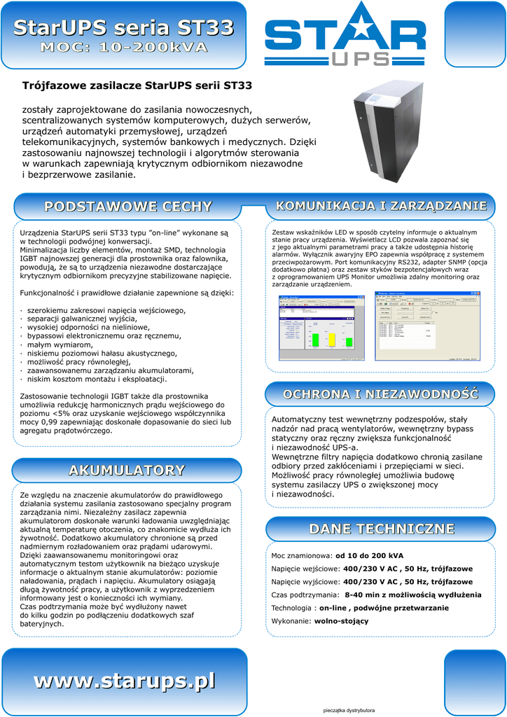 StarUPS seria ST33 MOC: 10-200kVA Trójfazowe zasilacze StarUPS serii ST33 zostały zaprojektowane do zasilania nowoczesnych, scentralizowanych systemów komputerowych, dużych serwerów, urządzeń automatyki przemysłowej, urządzeń telekomunikacyjnych, systemów bankowych i medycznych. Dzięki zastosowaniu najnowszej technologii i algorytmów sterowania w warunkach zapewniają krytycznym odbiornikom niezawodne i bezprzerwowe zasilanie. PODSTAWOWE CECHY Urządzenia StarUPS serii ST33 typu ”on-line” wykonane są w technologii podwójnej konwersacji. Minimalizacja liczby elementów, montaż SMD, technologia IGBT najnowszej generacji dla prostownika oraz falownika, powodują, że są to urządzenia niezawodne dostarczające krytycznym odbiornikom precyzyjne stabilizowane napięcie. KOMUNIKACJA I ZARZĄDZANIE Zestaw wskaźników LED w sposób czytelny informuje o aktualnym stanie pracy urządzenia. Wyświetlacz LCD pozwala zapoznać się z jego aktualnymi parametrami pracy a także udostępnia historię alarmów. Wyłącznik awaryjny EPO zapewnia współpracę z systemem przeciwpożarowym. Port komunikacyjny RS232, adapter SNMP (opcja dodatkowo płatna) oraz zestaw styków bezpotencjałowych wraz z oprogramowaniem UPS Monitor umożliwia zdalny monitoring oraz zarządzanie urządzeniem. Funkcjonalność i prawidłowe działanie zapewnione są dzięki: · · · · · · · · · szerokiemu zakresowi napięcia wejściowego, separacji galwanicznej wyjścia, wysokiej odporności na nieliniowe, bypassowi elektronicznemu oraz ręcznemu, małym wymiarom, niskiemu poziomowi hałasu akustycznego, możliwość pracy równoległej, zaawansowanemu zarządzaniu akumulatorami, niskim kosztom montażu i eksploatacji. Zastosowanie technologii IGBT także dla prostownika umożliwia redukcję harmonicznych prądu wejściowego do poziomu <5% oraz uzyskanie wejściowego współczynnika mocy 0,99 zapewniając doskonałe dopasowanie do sieci lub agregatu prądotwórczego. AKUMULATORY Ze względu na znaczenie akumulatorów do prawidłowego działania systemu zasilania zastosowano specjalny program zarządzania nimi. Niezależny zasilacz zapewnia akumulatorom doskonałe warunki ładowania uwzględniając aktualną temperaturę otoczenia, co znakomicie wydłuża ich żywotność. Dodatkowo akumulatory chronione są przed nadmiernym rozładowaniem oraz prądami udarowymi. Dzięki zaawansowanemu monitoringowi oraz automatycznym testom użytkownik na bieżąco uzyskuje informacje o aktualnym stanie akumulatorów: poziomie naładowania, prądach i napięciu. Akumulatory osiągają długą żywotność pracy, a użytkownik z wyprzedzeniem informowany jest o konieczności ich wymiany. Czas podtrzymania może być wydłużony nawet do kilku godzin po podłączeniu dodatkowych szaf bateryjnych. OCHRONA I NIEZAWODNOŚĆ Automatyczny test wewnętrzny podzespołów, stały nadzór nad pracą wentylatorów, wewnętrzny bypass statyczny oraz ręczny zwiększa funkcjonalność i niezawodność UPS-a. Wewnętrzne filtry napięcia dodatkowo chronią zasilane odbiory przed zakłóceniami i przepięciami w sieci. Możliwość pracy równoległej umożliwia budowę systemu zasilaczy UPS o zwiększonej mocy i niezawodności. DANE TECHNICZNE Moc znamionowa: od 10 do 200 kVA Napięcie wejściowe: 400/230 V AC , 50 Hz, trójfazowe Napięcie wyjściowe: 400/230 V AC , 50 Hz, trójfazowe Czas podtrzymania: 8-40 min z możliwością wydłużenia Technologia : on-line , podwójne przetwarzanie Wykonanie: wolno-stojący www.starups.pl pieczątka dystrybutora StarUPS seria ST33 SPECYFIKACJA TECHNICZNA MOC: 10-60kVA MO OD DE E LL MOC Wyjściowa (kVA) ST33-10 ST33-15 ST33-20 ST33-30 ST33-40 ST33-60 10 15 20 30 40 60 Współczynnik mocy wyjścia 0,8 W WE E JJ Ś ŚC C II E E 380V / 400V / 415V 3 fazy Napięcie Tolerancja napięcia ± 15% (standardowo) Częstotliwość 50Hz lub 60Hz Tolerancja częstotliwości ± 10% W WY Y JJ Ś ŚC CI E E 380V / 400V / 415V 3 fazy Napięcie ± 1% Tolerancja napięcia (statyczna) Tolerancja napięcia (dynamiczna) ± 5% THD napięcia obciążenie liniowe < 3% THD napięcia obciążenie nieliniowe < 5% Współczynnik szczytu 3:1 50Hz lub 60Hz Częstotliwość Tolerancja częstotliwości ± 0,2% P PR R ZZ E EC C II Ą Ą ŻŻ A A LL N NO OŚ ŚĆ Ć 100%-125% obciążenia 10 minut 125%-150% obciążenia 1 minuta Sprawność ≥ 90% B A TT E ER R II E E Typ akumulatorów kwasowo-ołowiowe, bezobsługowe Czas podtrzymania standardowo 10-15 minut – możliwość wydłużenia czasu podtrzymania Pozostałe zabezpieczenie przed przeładowaniem i nadmiernym rozładowaniem, monitoring baterii B BY YP PA AS SS S Ręczny tak, wbudowany Statyczny tak, bezprzerwowy opcjonalnie Zewnętrzny K KO OM MU UN N II K KA AC C JJ A A RS232 i styki bezpotencjałowe, adapter WEB/SNMP (opcja dodatkowo płatna) Interfejs W WY YM M II A AR RY Y Masa bez akumulatorów (kg) ST33-10 ST33-15 ST33-20 ST33-30 ST33-40 ST33-60 225 255 270 285 400 475 Wymiary szer. x gł. x wys. (mm) 490 x 650 x 1190 565 x 860 x 1400 O O TT O OC C ZZ E EN N II E E < 55 dBA Hałas słyszalny Temperatura pracy < 60 dBA 0°C....+ 40°C (ze względu na żywotność akumulatorów zalecana temperatura pracy to + 20°C....+ 25°C Wilgotność względna Normy i certyfikaty 0-95% bez kondensacji EN 62040-1-1 (bezpieczeństwo), EN 62040-2 (EMC), CE OP PC C JJ E szafa bateryjna, regał bateryjny, regał bateryjny chroniony plexiglasem, praca równoległa, adapter SNMP, rozdzielone zasilanie bypass-u, zdalny panel kontrolny, dodatkowe filtry, prostownik 12 impulsowy, THDCL, inne napięcia wej./wyj., dodatkowy zasilacz ładowania, kompensacja temperatury przy ładowaniu, modem, RS485, Eco-mode, oprogramowanie komunikacyjne, powiadomienie GSM, współpraca z agregatem prądotwórczym, wyjściowy transformator izolacji galwanicznej, wyłącznik EPO napięcia DC, serwis plan, wydłużenie gwarancji do 5 lat. STARups – wszelkie prawa zastrzeżone. Specyfikacja techniczna może