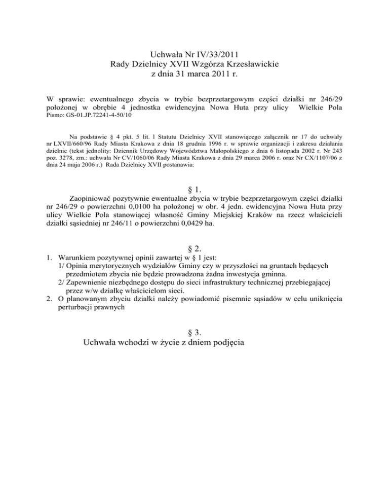 Uchwała Nr IV/33/2011 Rady Dzielnicy XVII Wzgórza Krzesławickie z dnia 31 marca 2011 r. W sprawie: ewentualnego zbycia w trybie bezprzetargowym części działki nr 246/29 położonej w obrębie 4 jednostka ewidencyjna Nowa Huta przy ulicy Wielkie Pola Pismo: GS-01.JP.72241-4-50/10 Na podstawie § 4 pkt. 5 lit. l Statutu Dzielnicy XVII stanowiącego załącznik nr 17 do uchwały nr LXVII/660/96 Rady Miasta Krakowa z dnia 18 grudnia 1996 r. w sprawie organizacji i zakresu działania dzielnic (tekst jednolity: Dziennik Urzędowy Województwa Małopolskiego z dnia 6 listopada 2002 r. Nr 243 poz. 3278, zm.: uchwała Nr CV/1060/06 Rady Miasta Krakowa z dnia 29 marca 2006 r. oraz Nr CX/1107/06 z dnia 24 maja 2006 r.) Rada Dzielnicy XVII postanawia: § 1. Zaopiniować pozytywnie ewentualne zbycia w trybie bezprzetargowym części działki nr 246/29 o powierzchni 0,0100 ha położonej w obr. 4 jedn. ewidencyjna Nowa Huta przy ulicy Wielkie Pola stanowiącej własność Gminy Miejskiej Kraków na rzecz właścicieli działki sąsiedniej nr 246/11 o powierzchni 0,0429 ha. § 2. 1. Warunkiem pozytywnej opinii zawartej w § 1 jest: 1/ Opinia merytorycznych wydziałów Gminy czy w przyszłości na gruntach będących przedmiotem zbycia nie będzie prowadzona żadna inwestycja gminna. 2/ Zapewnienie niezbędnego dostępu do sieci infrastruktury technicznej przebiegającej przez w/w działkę właścicielom sieci. 2. O planowanym zbyciu działki należy powiadomić pisemnie sąsiadów w celu uniknięcia perturbacji prawnych § 3. Uchwała wchodzi w życie z dniem podjęcia Uchwała Nr IV/34/2011 Rady Dzielnicy XVII Wzgórza Krzesławickie z dnia 31 marca 2011 r. W sprawie: korekty zadań priorytetowych na rok 2011 Na podstawie § 5 ust. 5 Statutu Dzielnicy XVII stanowiącego załącznik nr 17 do uchwały nr LXVII/660/96 Rady Miasta Krakowa z dnia 18 grudnia 1996 r. w sprawie organizacji i zakresu działania dzielnic (tekst jednolity: Dziennik Urzędowy Województwa Małopolskiego z dnia 6 listopada 2002 r. Nr 243 poz. 3278, zm.: uchwała Nr CV/1060/06 Rady Miasta Krakowa z dnia 29 marca 2006 r. oraz Nr CX/1107/06 z dnia 24 maja 2006 r.) Rada Dzielnicy XVII postanawia: § 1. 1. Zrezygnować z zadania: 1/ Dział 921 – Kultura i Ochrona Dziedzictwa Narodowego a) wniosek nr 32 – Muzeum PRL-u - organizacja wystawy z okazji stanu wojennego 1.500,2. Środki pozyskane o których mowa w ust.1. w wysokości 1.500,- przeznaczyć na zadanie: 1/ Dział 921 – Kultura i Ochrona Dziedzictwa Narodowego a) wniosek nr 42 – Młodzieżowy Dom Kultury im. J. Korczaka – organizacja wystawy z okazji 30-lecia stanu wojennego § 2. Uchwała wchodzi w życie z dniem podjęcia 1.500,- Uchwała Nr IV/35/2011 Rady Dzielnicy XVII Wzgórza Krzesławickie z dnia 31 marca 2011 r. w sprawie: zawarcia umowy najmu lokalu mieszkalnego położonego w os. Na Wzgórzach pismo: ML-02.MW.714094-211/10 Na podstawie § 4 ust. 5 lit. g Statutu Dzielnicy XVII stanowiącego załącznik nr 17 do uchwały nr LXVII/660/96 Rady Miasta Krakowa z dnia 18 grudnia 1996 r. w sprawie organizacji i zakresu działania dzielnic (tekst jednolity: Dziennik Urzędowy Województwa Małopolskiego z dnia 6 listopada 2002 r. Nr 243 poz. 3278, zm.: uchwała Nr CV/1060/06 Rady Miasta Krakowa z dnia 29 marca 2006 r. oraz Nr CX/1107/06 z dnia 24 maja 2006 r.) Rada Dzielnicy XVII postanawia: §1 Zaopiniować pozytywnie wniosek dotyczący ponownego zawarcia umowy najmu lokalu mieszkalnego wymienionego w piśmie ML-02.MW.714094-211/10 w os. Na Wzgórzach w Krakowie z Panem Krzysztofem W. §2 Do Rady Dzielnicy XVII „Wzgórza Krzesławickie” nie wpłynęły negatywne opinie o nagannym zachowaniu Pana Krzysztofa W., co było podstawą do wydania opinii zawartej w §1. §3 Uchwała wchodzi w życie z dniem podjęcia Uchwała Nr IV/36/2011 Rady Dzielnicy XVII Wzgórza Krzesławickie z dnia 31 marca 2011 r. w sprawie: zawarcia umowy najmu lokalu mieszkalnego położonego w os. Na Wzgórzach pismo: ML-02.7123.35.2011.MW Na podstawie § 4 ust. 5 lit. g Statutu Dzielnicy XVII stanowiącego załącznik nr 17 do uchwały nr LXVII/660/96 Rady Miasta Krakowa z dnia 18 grudnia 1996 r. w sprawie organizacji i zakresu działania dzielnic (tekst jednolity: Dziennik Urzędowy Województwa Małopolskiego z dnia 6 listopada 2002 r. Nr 243 poz. 3278, zm.: uchwała Nr CV/1060/06 Rady Miasta Krakowa z dnia 29 marca 2006 r. oraz Nr CX/1107/06 z dnia 24 maja 2006 r.) Rada Dzielnicy XVII postanawia: §1 Zaopiniować pozytywnie wniosek dotyczący ponownego zawarcia umowy najmu lokalu mieszkalnego wymienionego w piśmie ML-02.7123.35.2011.MW w os. Na Wzgórzach w Krakowie z Panem Krzysztofem G. §2 Do Rady Dzielnicy XVII „Wzgórza Krzesławickie” nie wpłynęły negatywne opinie o nagannym zachowaniu Pana Krzysztofa G., co było podstawą do wydania opinii zawartej w §1. §3 Uchwała wchodzi w życie z dniem podjęcia Uchwała Nr IV/37/2011 Rady Dzielnicy XVII Wzgórza Krzesławickie z dnia 31 marca 2011 r. w sprawie: przyjęcia rocznego sprawozdania z działalności merytorycznej i finansowej Zarządu za rok 2010 Na podstawie § 19 ust. 1 Statutu Dzielnicy XVII stanowiącego załącznik nr 17 do uchwały nr LXVII/660/96 Rady Miasta Krakowa z dnia 18 grudnia 1996 r. w sprawie organizacji i zakresu działania dzielnic (tekst jednolity: Dziennik Urzędowy Województwa Małopolskiego z dnia 6 listopada 2002 r. Nr 243 poz. 3278, zm.: uchwała Nr CV/1060/06 Rady Miasta Krakowa z dnia 29 marca 2006 r. oraz Nr CX/1107/06 z dnia 24 maja 2006 r.) Rada Dzielnicy XVII postanawia: § 1. Rada Dzielnicy XVII „Wzgórza Krzesławickie” przyjmuje sprawozdanie Zarządu z działalności merytorycznej i realizacji planu finansowego wydatków Dzielnicy za rok 2010. § 2. Sprawozdanie Zarządu z działalności merytorycznej i realizacji planu finansowego wydatków Dzielnicy za rok 2010 stanowi integralną część uchwały. § 3. Uchwała wchodzi w życie z dniem podjęcia Uchwała Nr IV/38/2011 Rad