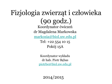 Fizjologia zwierząt i człowieka (90 godz.) Koordynator ćwiczeń dr Magdalena Markowska [email protected] Tel: +22 554 10 15 Pokój 15A Koordynator wykładu dr hab. Piotr Bębas [email protected] 2014/2015 PROGRAM ĆWICZEŃ lp. data prowadzący temat 1 18, 19, II Informacja wstępna dr Magdalena Markowska 2 24, 25, 27 II Wpływ temperatury na niektóre reakcje zwierząt zmiennocieplnych dr Aleksandra Skawina, dr Magdalena Markowska 3 3, 4, 6 III Narządy zmysłów – elektrolokacja u ryb dr Piotr Bernatowicz, dr hab. Piotr Bębas 4 10, 11, 13, III Nerwy i mięśnie szkieletowe, charakterystyka reakcji odruchowych dr Magdalena Markowska, dr Jan Jabłonka 5 17, 18, 20 III Automatyzm serca, regulacja pracy serca, EKG dr Marta Polańska, mgr Agnieszka Suszczyńska 6 24, 25, 27 III Fizjologia mięśni gładkich, regulacja krążenia w naczyniach dr Paweł Majewski, mgr Urszula Kędzierska 7 31 III, 1, 10 IV Wymiana gazowa zwierząt dr hab. Piotr Bębas, mgr Tomasz Czerwik 8 14, 15, 17 IV Charakterystyka porównawcza komórek krwi kręgowców dr Paweł Majewski, dr Joanna Kotwica-Rolińska 9 21, 22, 24 IV Działanie soków trawiennych dr Magdalena Markowska, dr Jan Jabłonka 28,29 IV Kolokwium I – pisemne z ćwiczeń 2-6, w godzinach ćwiczeń, grupy piątkowe piszą kolokwium w czasie wykładu 10 12, 13, 15 V Regulacja hormonalna – wpływ insuliny na poziom glukozy w krwi Cukrzyca alloksanowa – (ćwiczenie komputerowe) dr Magdalena Markowska, dr Aleksandra Skawina 11 19, 20, 22 V Wpływ hormonów na metamorfozę owadów cz. 1 Regulacja hormonalna – hormonalna terapia zastępcza. (ćwiczenie komputerowe) dr Marta Polańska , dr Joanna Kotwica-Rolińska 12 26, 27, 29 V Wpływ hormonów osi tarczycowej na metabolizm (ćwiczenie komputerowe) Wpływ hormonów na metamorfozę owadów cz. 2 dr Marta Polańska , dr Joanna Kotwica-Rolińska 3.VI Kolokwium II – pisemne z ćwiczeń 7-12; 12.30 – 14.30 (103 B) 10. VI Kol. poprawkowe (I i II - pisemne); 12.30 – 14.30 (103 B) 13. VI EGZAMIN; 12.30 – 14.30 (103 B) REGULAMIN PRACOWNI “FIZJOLOGII ZWIERZĄT” WYMIAR 90 GODZ., ROK AKADEMICKI 2014/2015 1. Pracownia składa się z 12 ćwiczeń i dwóch kolokwiów pisemnych. Pierwsze kolokwium obejmuje ćwiczenia od 2 do 6 (tkz. dział 1), drugie kolokwium obejmuje ćwiczenia od 7 do 12 (tkz. dział 2). 2. Pierwsze ćwiczenia poświęcone są omówieniu tematyki i regulaminu pracowni. Wszystkie pozostałe są poprzedzone 10 minutowym sprawdzianem testowym jednokrotnego wyboru złożonym z 10 pytań. Sprawdzian jest częścią kolokwium. Za każdą dobrą odpowiedź student otrzymuje 1 punkt. Test jest zaliczony gdy 6 lub więcej odpowiedzi jest prawidłowych. 3. Ćwiczenie jest zaliczone jeśli student był na nim obecny, odbył test i pracował na ćwiczeniach w sposób zadawalający, co oceniają prowadzący zajęcia. 4. Nieobecność na ćwiczeniach jest usprawiedliwiona tylko po przedłożeniu kierownikowi pracowni zwolnienia lekarskiego. Musi to nastąpić na pierwszych zajęciach po przebytej chorobie. 5. Niezaliczenie 3 ćwiczeń w ciągu semestru, lub niezdanie z wynikiem pomyślnym obu kolokwiów powoduje, bez względu na przyczyny, niezaliczenie pracowni. 6. Wyniki z kolejnych testów są uwzględniane przy wystawianiu ocen z ćwiczeń w sposób następujący: a) przed każdym kolokwium jest obliczana średnia ocen z testów danego działu. Nieusprawiedliwiona nieobecność na ćwiczeniach daje wynik z testu = 0. W przypadkach nieobecności usprawiedliwionej średnią oblicza się na podstawie wyników pozostałych testów z tego działu. Jeżeli średnia wynosi minimum 6,0 student zdaje kolokwium w trybie normalnym. b) jeżeli średnia z testów danego działu jest niższa od 6,0 to dział ten nie jest zaliczony, a ocena wystawiana na jego zakończenie jest niedostateczna. W takim przypadku student zostaje dopuszczony do kolokwium, ale jest ono traktowane już jako poprawkowe. c) w przypadku kolokwium 1 przy obecności na wszystkich zajęciach student otrzymuje nastepujące oceny z kolokwium: dst, jeżeli średnia z testów wynosi 6,0 dst+ - 7, db – 8, db+ - 9, bdb – 10 punktów; jeśli student chce uzyskać ocenę lepszą od uzyskanej na podstawie średniej z testów (6 lub powyżej punktów) musi zdawać kolokwium, przy czy wynik słabszy od oczekiwanego nie anuluje oceny uzyskanej na podstawie testów d) jeśli student nie był obecny na wszystkich zajęciach, bez względu na przyczynę tej nieobecności, musi przystepować do kolokwium e) kolokwium 2 jest obowiązkowe dla wszystkich studentów przy czym nadal obowiązuje zasada z punktu b) 7. Nie stawienie się na kolokwium w ustalonym terminie bez usprawiedliwienia oznacza rezygnację z tego terminu. 8. Zaliczenie pracowni na ocenę bardzo dobrą powoduje, że student zostaje zwolniony z egzaminu. REGULAMIN BHP PRACOWNI FIZJOLOGII ZWIERZĄT A) Podczas pracy laboratoryjnej, ze względów higienicznych, nie wolno na sali spożywać posiłków, żuć gumy i pić napojów. B) Po zakończeniu pracy ze zwierzętami należy umyć ręce mydłem. C) Przerwy w pracy zależą od przebiegu doświadczenia. Winno się je spędzać tak, aby nie przeszkadzać innym. D) Ze względu na rodzaj pracy i stosowane odczynniki (często żrące lub barwne) należy ćwiczenia odbywać w fartuchu. E) Podczas pracy z komputerem wszelkie zaburzenia w jego działaniu lub używanego programu należy zgłaszać prowadzącemu ćwiczenia, a nie naprawiać „na własną rękę”. F) Odzież wierzchnią prosimy pozostawiać w szatni. G) Wszelkie torby, teczki i plecaki należy na pracowni odłożyć na specjalną, przeznaczoną na nie półkę, którą wskaże prowadzący ćwiczenia. H) Prosimy, aby podczas zajęć telefony komórkowe były wyłączone lub, w razie potrzeby, wyciszone. WYKAZ PODRĘCZNIKÓW ZALECENACH DO ĆWICZEŃ Z „FIZJOLOGII ZWIERZĄT” W ROKU AKADEMICKIM 2010/2011 Podręczniki podstawowe: 1. Schmidt-Nielsen, K. – Fizjologia zwierz