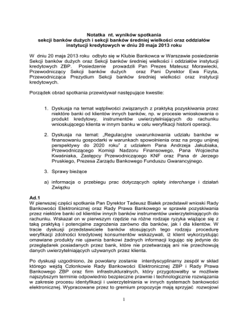 Notatka nt. wyników spotkania sekcji banków dużych i sekcji banków średniej wielkości oraz oddziałów instytucji kredytowych w dniu 20 maja 2013 roku W dniu 20 maja 2013 roku odbyło się w Klubie Bankowca w Warszawie posiedzenie Sekcji banków dużych oraz Sekcji banków średniej wielkości i oddziałów instytucji kredytowych ZBP. Posiedzenie prowadzili Pan Prezes Mateusz Morawiecki, oraz Pani Dyrektor Ewa Fizyta, Przewodniczący Sekcji banków dużych Przewodnicząca Prezydium Sekcji banków średniej wielkości oraz instytucji kredytowych. Porządek obrad spotkania przewidywał następujące kwestie: 1. Dyskusja na temat wątpliwości związanych z praktyką pozyskiwania przez niektóre banki od klientów innych banków, np. w procesie wnioskowania o produkt kredytowy, instrumentów uwierzytelniających do rachunku wnioskującego klienta w innym banku w celu weryfikacji historii operacji. 2. Dyskusja na temat: „Regulacyjne uwarunkowania udziału banków w finansowaniu gospodarki w warunkach spowolnienia oraz na progu unijnej perspektywy do 2020 roku” z udziałem Pana Andrzeja Jakubiaka, Przewodniczącego Komisji Nadzoru Finansowego, Pana Wojciecha Kwaśniaka, Zastępcy Przewodniczącego KNF oraz Pana dr Jerzego Pruskiego, Prezesa Zarządu Bankowego Funduszu Gwarancyjnego. 3. Sprawy bieżące a) informacja o przebiegu prac dotyczących opłaty interchange i działań Związku Ad.1 W pierwszej części spotkania Pan Dyrektor Tadeusz Białek przedstawił wnioski Rady Bankowości Elektronicznej oraz Rady Prawa Bankowego w sprawie pozyskiwania przez niektóre banki od klientów innych banków instrumentów uwierzytelniających do rachunku. Wskazał on w pierwszym rzędzie na różne rodzaje ryzyka wiążące się z taką praktyką i potencjalne zagrożenia zarówno dla banków, jak i dla klientów. W tracie dyskusji przedstawiciele banków stosujących tego rodzaju procedurę weryfikacji zdolności kredytowej konsumentów wskazywali, iż klient wykorzystując omawiane produkty nie ujawnia bankowi żadnych informacji logując się jedynie do przeglądarek posiadanych przez bank, które nie przetwarzają ani nie przechowują danych uwierzytelniających używanych przez klienta. Po dyskusji uzgodniono, że powołany zostanie interdyscyplinarny zespół w skład którego wejdą Członkowie Rady Bankowości Elektronicznej ZBP i Rady Prawa Bankowego ZBP oraz firm infrastrukturalnych, który przygotowałby w możliwie najszybszym terminie odpowiednio bezpieczne prawnie i technologicznie rozwiązania w zakresie procesu identyfikacji i uwierzytelniania w innych systemach bankowości elektronicznej. Wypracowane przez to gremium propozycje mają sprzyjać rozwojowi 1 biznesu i nowych metod zarządzania ryzykiem, ale bez groźby utraty reputacji oraz wiarygodności bankowości/gospodarki elektronicznej, w szczególności w czasach, gdy w mediach pojawia się tak wiele kontrowersji wokół dysponowania danymi klientów przez różnych przedsiębiorców. Ponadto Zarząd ZBP wystąpi z pismem do banków z prośbą o rozważenie zawieszenia stosowania tej metody do czasu wypracowania nowych rozwiązań. Ad.2 W kolejnej części spotkania odbyła się dyskusja z udziałem Pana Andrzeja Jakubiaka, Przewodniczącego Komisji Nadzoru Finansowego, Pana Wojciecha Kwaśniaka, Zastępcy Przewodniczącego KNF oraz Pana dr Jerzego Pruskiego, Prezesa Zarządu Bankowego Funduszu Gwarancyjnego, na temat „Regulacyjne uwarunkowania udziału banków w finansowaniu gospodarki w warunkach spowolnienia oraz na progu unijnej perspektywy do 2020 roku” Poza uwarunkowaniami makroekonomicznymi działalności polskich banków Prezes Krzysztof Pietraszkiewicz przedstawił gościom najważniejsze kwestie regulacyjne, które zdaniem polskiego sektora bankowego powinny być przedmiotem pogłębionej analizy: • • • weryfikacja założeń zmiany rekomendacji S, w tym rozdzielenie jej na część dotyczącą działalności gospodarczej i konsumentów, odpowiednia kalibracja LtV dla nieruchomości komercyjnych, bardziej konsekwentne zastosowanie zasady proporcjonalności poprzez rezygnację z pracochłonnych i kosztochłonnych wymogów dla banków posiadających mały portfel hipoteczny oraz zastosowanie dłuższego okresu okres przejściowego dla zgromadzenia wkładu własnego 20% (4 lata). Postulaty ZBP wynikają przy tym między innymi z obawy przed ograniczeniem kredytowania projektów komercyjnych przez polskie banki na rzecz konkurujących zagranicznych instytucji finansowych. wytyczne EBA dotyczące oceny kwalifikacji członków organu zarządzającego i osób pełniących najważniejsze funkcje, jako że niektóre zapisy (oparte na systemie anglosaskim) nie są możliwe do wdrożenia wyłącznie poprzez rekomendacje KNF, ale konieczne są zmiany w Prawie bankowym. szersze skorzystanie przez organ nadzoru z zasady proporcjonalności w regulacjach i inspekcjach, jako że modyfikacje regulacji wymagają coraz bardziej zaawansowanych metod zarządzania i wdrażania kosztownych systemów informatycznych (rekomendacje M, D, S czy T), narażają banki na nadmiarową pracę i koszty nieadekwatne do efektów nadzorczych czy biznesowych. Przedstawiciele KNF wskazali, że z nadzorczego punktu widzenia najważniejsze kwestie dla sprawnego i bezpiecznego funkcjonowania sektora bankowego to jego odpowiednia kapitalizacja, potrzeba stabilnych źródeł długoterminowego refinansowania działalności, poziom wewnętrznego finansowania w ramach międzynarodowych grup kapitałowych oraz zapewnienie reprezentatywności lokalnej stawki referencyjnej na rynku międzybankowym. Odnosząc się do konkretnych pytań zgłaszanych przez uczestników spotkania wskazali między innymi na finalizowane obecnie prace nad aktualizacją „Podręcznika inspekcji na miejscu”, które powinny uwzględniać postulaty sektora bankowego. Zapowiedziano także, że prowadzona 2 procedura oceny BION będzie także uwzględniała rozmowę z kierowni