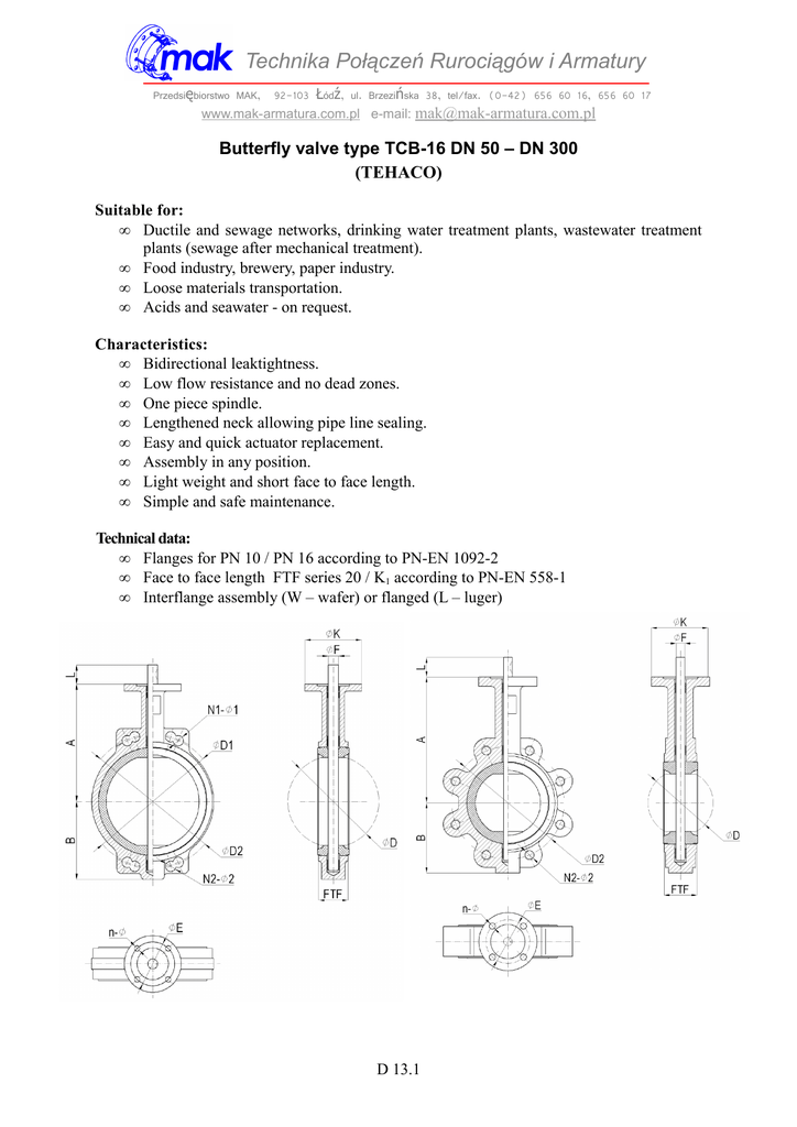 Technika Połączeń Rurociągów i Armatury Przedsiębiorstwo MAK, 92-103 Łódź, ul. Brzezińska 38, tel/fax. (0-42) 656 60 16, 656 60 17 www.mak-armatura.com.pl e-mail: [email protected] Butterfly valve type TCB-16 DN 50 – DN 300 (TEHACO) Suitable for: • Ductile and sewage networks, drinking water treatment plants, wastewater treatment plants (sewage after mechanical treatment). • Food industry, brewery, paper industry. • Loose materials transportation. • Acids and seawater - on request. Characteristics: • Bidirectional leaktightness. • Low flow resistance and no dead zones. • One piece spindle. • Lengthened neck allowing pipe line sealing. • Easy and quick actuator replacement. • Assembly in any position. • Light weight and short face to face length. • Simple and safe maintenance. Technical data: • Flanges for PN 10 / PN 16 according to PN-EN 1092-2 • Face to face length FTF series 20 / K1 according to PN-EN 558-1 • Interflange assembly (W – wafer) or flanged (L – luger) D 13.1 Technika Połączeń Rurociągów i Armatury Przedsiębiorstwo MAK, 92-103 Łódź, ul. Brzezińska 38, tel/fax. (0-42) 656 60 16, 656 60 17 www.mak-armatura.com.pl e-mail: [email protected] Material specification: Name Material* Body Disk Spindle Grey cast iron EN-GJL-250 / nodular cast iron EN-GJS-500, epoxy coated Nodular cast iron nickel coated EN-GJS-500 + Ni Stainless steel Seal EPDM / NBR Bearing PTFE *other materials on request. Diameters and sizes table: Wafer DN Maximum working pressure FTF A [MPa] ∅D B ∅ D1/ ∅ D2 [mm] N1-∅1 / N2-∅2 Luger M ∅ D2 PN10 / PN16 [mm] N2-∅2 M PN16 [kg] [mm] [kg] 40 1.6 33 142 70 41.1 110 4-M16 2 110 4-M16 3 50 1.6 43 162 76 52.9 125 4-M16 2 125 4-M16 4 65 1.6 46 175 89 64.5 145 4-M16 3 145 4-M16 4 80 1.6 46 181 95 78.8 160 8-M16 4 160 8-M16 5 100 1.6 52 200 114 104.0 180 8-M16 5 180 8-M16 8 125 1.6 56 213 127 123.3 210 8-M16 7 210 8-M16 10 150 1.6 56 225 140 155.7 240 8-M20 8 240 8-M20 12 200 1.6 60 260 177 202.5 295 8-M20 / 12-M20 13 295 12-M20 17 250 1.6 68 292 203 250.4 350/355 12-M20 / 12-M24 19 355 12-M24 29 300 1.6 78 337 242 301.5 400/410 12-M20 / 12-M24 33 410 12-M24 50 DN 40 50 65 80 100 125 150 200 250 300 ISO 5211 n-∅ F05 F05 F05 F05 F07 F07 F07 F10 F10 F10 4-M6 4-M6 4-M6 4-M6 4-M8 4-M8 4-M8 4-M10 4-M10 4-M10 Actuator connection ∅K ∅E [mm] 77 50 77 50 77 50 77 50 92 70 92 70 92 70 126 102 126 102 141 102 D 13.2 ∅F L 12.7 12.7 12.7 12.7 15.9 19.0 19.0 22.2 28.6 31.7 32 32 32 32 32 32 32 45 45 45