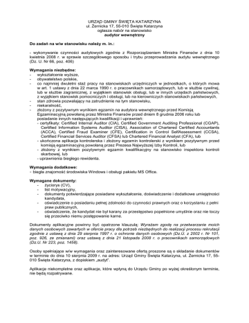 URZĄD GMINY ŚWIĘTA KATARZYNA ul. śernicka 17, 55-010 Święta Katarzyna ogłasza nabór na stanowisko audytor wewnętrzny Do zadań na w/w stanowisku naleŜy m. in.: - wykonywanie czynności audytowych zgodnie z Rozporządzeniem Ministra Finansów z dnia 10 kwietnia 2008 r. w sprawie szczegółowego sposobu i trybu przeprowadzania audytu wewnętrznego (Dz. U. Nr 66, poz. 406) Wymagania niezbędne: - wykształcenie wyŜsze, - obywatelstwo polskie, - co najmniej dwuletni staŜ pracy na stanowiskach urzędniczych w jednostkach, o których mowa w art. 1 ustawy z dnia 22 marca 1990 r. o pracownikach samorządowych, lub w słuŜbie cywilnej, lub w słuŜbie zagranicznej, z wyjątkiem stanowisk obsługi, lub w innych urzędach państwowych, z wyjątkiem stanowisk pomocniczych i obsługi, lub na kierowniczych stanowiskach państwowych, - stan zdrowia pozwalający na zatrudnienie na tym stanowisku, - niekaralność, - złoŜony z pozytywnym wynikiem egzamin na audytora wewnętrznego przed Komisją Egzaminacyjną powołaną przez Ministra Finansów przed dniem 8 grudnia 2006 roku lub posiadanie innych następujących kwalifikacji i uprawnień: - certyfikaty: Certified Internal Auditor (CIA), Certified Government Auditing Professional (CGAP), Certified Information Systems Auditor (CISA), Association of Chartered Certified Accountants (ACCA), Certified Fraud Examiner (CFE), Certification in Control SelfAssessment (CCSA), Certified Financial Services Auditor (CFSA) lub Chartered Financial Analyst (CFA), lub - ukończona aplikacja kontrolerska i złoŜony egzamin kontrolerski z wynikiem pozytywnym przed komisją egzaminacyjną powołaną przez Prezesa NajwyŜszej Izby Kontroli, lub - złoŜony z wynikiem pozytywnym egzamin kwalifikacyjny na stanowisko inspektora kontroli skarbowej, lub - uprawnienia biegłego rewidenta. Wymagania dodatkowe: - biegła znajomość środowiska Windows i obsługi pakietu MS Office. Wymagane dokumenty: - Ŝyciorys (CV), - list motywacyjny, - dokumenty potwierdzające posiadane wykształcenie, doświadczenie i dodatkowe umiejętności kandydata, - oświadczenie o posiadaniu pełnej zdolności do czynności prawnych oraz o korzystaniu z pełni praw publicznych, - oświadczenie, Ŝe kandydat nie był karany za przestępstwo popełnione umyślnie oraz nie toczy się przeciwko niemu postępowanie karne. Dokumenty aplikacyjne powinny być opatrzone klauzulą: WyraŜam zgodę na przetwarzanie moich danych osobowych zawartych w ofercie pracy dla potrzeb niezbędnych do realizacji procesu rekrutacji zgodnie z ustawą z dnia 29 sierpnia 1997 r. o ochronie danych osobowych (Dz.U. z 2002 r. Nr 101, poz. 926, ze zmianami) oraz ustawą z dnia 21 listopada 2008 r. o pracownikach samorządowych (Dz.U. Nr 223, poz. 1458). Osoby spełniające w/w wymagania oraz zainteresowane ofertą proszone są o składanie dokumentów w terminie do dnia 10 sierpnia 2009 r. na adres: Urząd Gminy Święta Katarzyna, ul. śernicka 17, 55010 Święta Katarzyna, z dopiskiem „audyt”. Aplikacje niekompletne oraz aplikacje, które wpłyną do Urzędu Gminy po wyŜej określonym terminie, nie będą rozpatrywane.