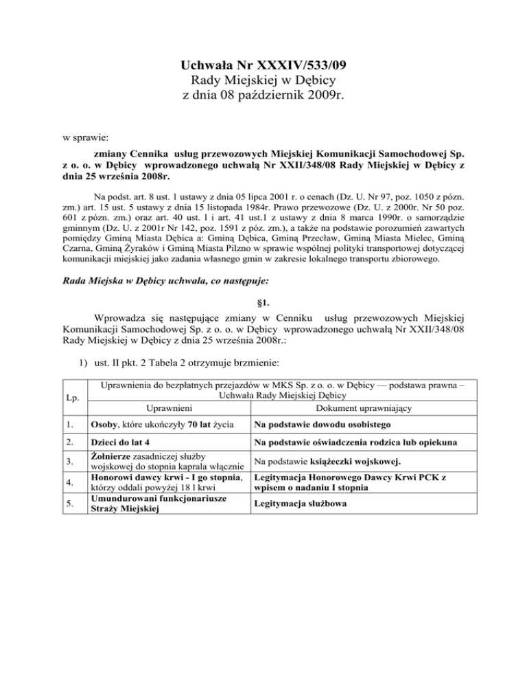 Uchwała Nr XXXIV/533/09 Rady Miejskiej w Dębicy z dnia 08 październik 2009r. w sprawie: zmiany Cennika usług przewozowych Miejskiej Komunikacji Samochodowej Sp. z o. o. w Dębicy wprowadzonego uchwałą Nr XXII/348/08 Rady Miejskiej w Dębicy z dnia 25 września 2008r. Na podst. art. 8 ust. 1 ustawy z dnia 05 lipca 2001 r. o cenach (Dz. U. Nr 97, poz. 1050 z pózn. zm.) art. 15 ust. 5 ustawy z dnia 15 listopada 1984r. Prawo przewozowe (Dz. U. z 2000r. Nr 50 poz. 601 z pózn. zm.) oraz art. 40 ust. l i art. 41 ust.1 z ustawy z dnia 8 marca 1990r. o samorządzie gminnym (Dz. U. z 2001r Nr 142, poz. 1591 z póz. zm.), a takŜe na podstawie porozumień zawartych pomiędzy Gminą Miasta Dębica a: Gminą Dębica, Gminą Przecław, Gminą Miasta Mielec, Gminą Czarna, Gminą śyraków i Gminą Miasta Pilzno w sprawie wspólnej polityki transportowej dotyczącej komunikacji miejskiej jako zadania własnego gmin w zakresie lokalnego transportu zbiorowego. Rada Miejska w Dębicy uchwala, co następuje: §1. Wprowadza się następujące zmiany w Cenniku usług przewozowych Miejskiej Komunikacji Samochodowej Sp. z o. o. w Dębicy wprowadzonego uchwałą Nr XXII/348/08 Rady Miejskiej w Dębicy z dnia 25 września 2008r.: 1) ust. II pkt. 2 Tabela 2 otrzymuje brzmienie: Lp. Uprawnienia do bezpłatnych przejazdów w MKS Sp. z o. o. w Dębicy — podstawa prawna – Uchwała Rady Miejskiej Dębicy Uprawnieni Dokument uprawniający 1. Osoby, które ukończyły 70 lat Ŝycia Na podstawie dowodu osobistego 2. Dzieci do lat 4 Na podstawie oświadczenia rodzica lub opiekuna 3. 4. 5. śołnierze zasadniczej słuŜby wojskowej do stopnia kaprala włącznie Honorowi dawcy krwi - I go stopnia, którzy oddali powyŜej 18 l krwi Umundurowani funkcjonariusze StraŜy Miejskiej Na podstawie ksiąŜeczki wojskowej. Legitymacja Honorowego Dawcy Krwi PCK z wpisem o nadaniu I stopnia Legitymacja słuŜbowa 6. 7. Legitymacja emeryta-rencisty dokumentująca niepełnosprawność Inwalidzi (w tym niewidomi i Legitymacja Polskiego Związku Niewidomych głuchoniemi) o znacznym stopniu dokumentująca niepełnosprawność. niepełnosprawności, wraz z Legitymacja dokumentująca niepełnosprawność opiekunami. wydana przez Starostę. Niewidomi o umiarkowanym stopniu Legitymacja wystawiona przez MKS sp. z o. o. w niepełnosprawności wraz z opiekunami. Dębicy wraz dowodem osobistym*. Osoby, które uzyskały orzeczenie powiatowego Zespołu ds. orzekania o znacznym stopniu niepełnosprawności wraz z opiekunami. * - legitymacja wystawiana jest na podstawie orzeczeń o stopniu niepełnosprawności wydanych przez uprawnione organy, dla uprawnionych, których legitymacje nie zawierają: zdjęcia osoby uprawnianej i wpisu o stopniu niepełnosprawności. Mieszkańcy miast partnerskich Dokument wydany w miastach partnerskich Imienny miesięczny bilet wolnej jazdy wystawiony dla uprawnionego i jednego opiekuna przez MKS Sp. z o. o. w Dębicy — waŜny na trasie: miejsce 8. zamieszkania - szkoła -ośrodek rehabilitacji. (Bilet wystawiany na podstawie zamówienia wystawionego przez Gminę miejsca zamieszkania dziecka) Przewóz wózków dziecięcych dla uprawnionych: tab. 2 poz. 2, oraz wózków inwalidzkich lub innych urządzeń technicznych związanych z inwalidztwem dla uprawnionych: tab.1 poz. 2 i tab. 2 poz. 6 i 8 - nie podlega opłacie i odbywa się w oparciu o bilet 0,00 zł., pobrany u kierowcy z drukarki fiskalnej. Dzieci i młodzieŜ niepełnosprawna wraz z opiekunami, z miejsca zamieszkania i z powrotem, do publicznych szkół i gimnazjów oraz na zajęcia rehabilitacyjne. §2. Tekst jednolity Cennika usług Przewozowych Miejskiej Komunikacji Samochodowej Sp. z o.o. w Dębicy stanowi załącznik Nr 1 do niniejszej uchwały. §3. Wykonanie uchwały powierza się Burmistrzowi Miasta. §4. Uchwała podlega ogłoszeniu w Dzienniku Urzędowym Podkarpackiego, wchodzi w Ŝycie po upływie 14 dni od publikacji. Przewodniczący Rady Miejskiej w Dębicy Jan Borek Województwa