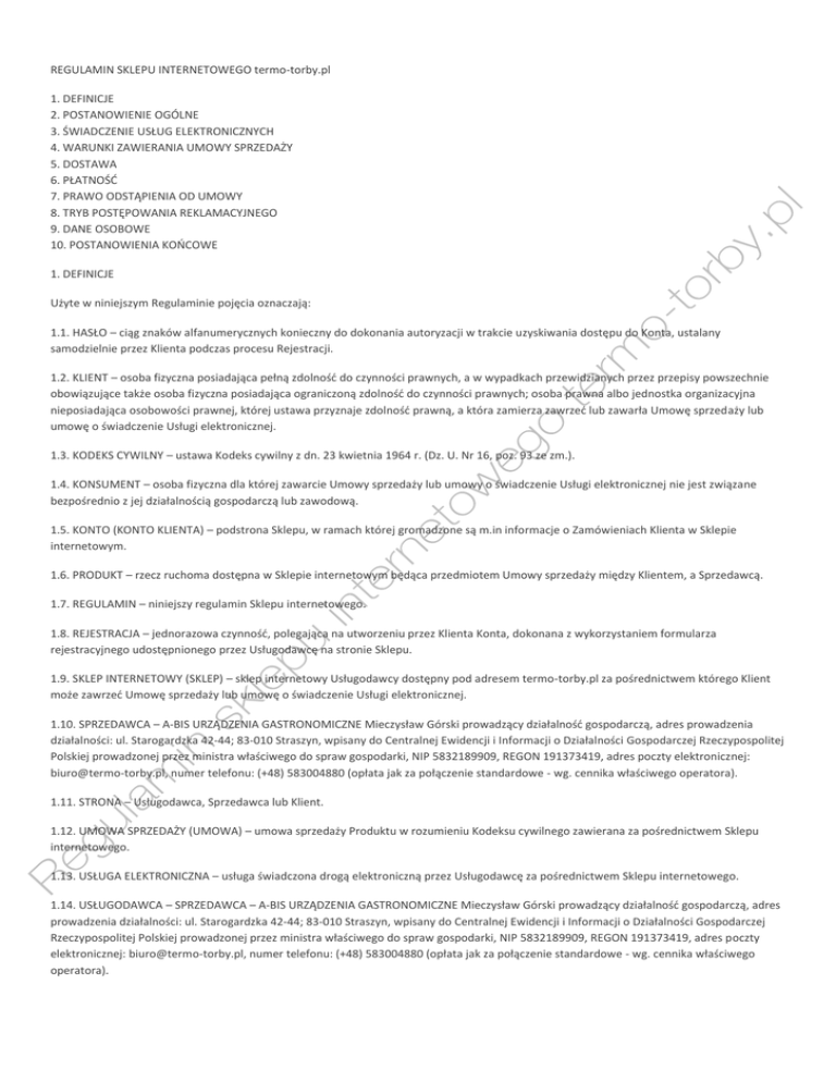 REGULAMIN SKLEPU INTERNETOWEGO termo-torby.pl 1. DEFINICJE 2. POSTANOWIENIE OGÓLNE 3. ŚWIADCZENIE USŁUG ELEKTRONICZNYCH 4. WARUNKI ZAWIERANIA UMOWY SPRZEDAŻY 5. DOSTAWA 6. PŁATNOŚĆ 7. PRAWO ODSTĄPIENIA OD UMOWY 8. TRYB POSTĘPOWANIA REKLAMACYJNEGO 9. DANE OSOBOWE 10. POSTANOWIENIA KOŃCOWE 1. DEFINICJE Użyte w niniejszym Regulaminie pojęcia oznaczają: 1.1. HASŁO – ciąg znaków alfanumerycznych konieczny do dokonania autoryzacji w trakcie uzyskiwania dostępu do Konta, ustalany samodzielnie przez Klienta podczas procesu Rejestracji. 1.2. KLIENT – osoba fizyczna posiadająca pełną zdolność do czynności prawnych, a w wypadkach przewidzianych przez przepisy powszechnie obowiązujące także osoba fizyczna posiadająca ograniczoną zdolność do czynności prawnych; osoba prawna albo jednostka organizacyjna nieposiadająca osobowości prawnej, której ustawa przyznaje zdolność prawną, a która zamierza zawrzeć lub zawarła Umowę sprzedaży lub umowę o świadczenie Usługi elektronicznej. 1.3. KODEKS CYWILNY – ustawa Kodeks cywilny z dn. 23 kwietnia 1964 r. (Dz. U. Nr 16, poz. 93 ze zm.). 1.4. KONSUMENT – osoba fizyczna dla której zawarcie Umowy sprzedaży lub umowy o świadczenie Usługi elektronicznej nie jest związane bezpośrednio z jej działalnością gospodarczą lub zawodową. 1.5. KONTO (KONTO KLIENTA) – podstrona Sklepu, w ramach której gromadzone są m.in informacje o Zamówieniach Klienta w Sklepie internetowym. 1.6. PRODUKT – rzecz ruchoma dostępna w Sklepie internetowym będąca przedmiotem Umowy sprzedaży między Klientem, a Sprzedawcą. 1.7. REGULAMIN – niniejszy regulamin Sklepu internetowego. 1.8. REJESTRACJA – jednorazowa czynność, polegająca na utworzeniu przez Klienta Konta, dokonana z wykorzystaniem formularza rejestracyjnego udostępnionego przez Usługodawcę na stronie Sklepu. 1.9. SKLEP INTERNETOWY (SKLEP) – sklep internetowy Usługodawcy dostępny pod adresem termo-torby.pl za pośrednictwem którego Klient może zawrzeć Umowę sprzedaży lub umowę o świadczenie Usługi elektronicznej. 1.10. SPRZEDAWCA – A-BIS URZĄDZENIA GASTRONOMICZNE Mieczysław Górski prowadzący działalność gospodarczą, adres prowadzenia działalności: ul. Starogardzka 42-44; 83-010 Straszyn, wpisany do Centralnej Ewidencji i Informacji o Działalności Gospodarczej Rzeczypospolitej Polskiej prowadzonej przez ministra właściwego do spraw gospodarki, NIP 5832189909, REGON 191373419, adres poczty elektronicznej: [email protected], numer telefonu: (+48) 583004880 (opłata jak za połączenie standardowe - wg. cennika właściwego operatora). 1.11. STRONA – Usługodawca, Sprzedawca lub Klient. 1.12. UMOWA SPRZEDAŻY (UMOWA) – umowa sprzedaży Produktu w rozumieniu Kodeksu cywilnego zawierana za pośrednictwem Sklepu internetowego. 1.13. USŁUGA ELEKTRONICZNA – usługa świadczona drogą elektroniczną przez Usługodawcę za pośrednictwem Sklepu internetowego. 1.14. USŁUGODAWCA – SPRZEDAWCA – A-BIS URZĄDZENIA GASTRONOMICZNE Mieczysław Górski prowadzący działalność gospodarczą, adres prowadzenia działalności: ul. Starogardzka 42-44; 83-010 Straszyn, wpisany do Centralnej Ewidencji i Informacji o Działalności Gospodarczej Rzeczypospolitej Polskiej prowadzonej przez ministra właściwego do spraw gospodarki, NIP 5832189909, REGON 191373419, adres poczty elektronicznej: [email protected], numer telefonu: (+48) 583004880 (opłata jak za połączenie standardowe - wg. cennika właściwego operatora). 1.15. ZAMÓWIENIE – oświadczenie woli Klienta zmierzające bezpośrednio do zawarcia Umowy sprzedaży Produktu i określające istotne jej warunki. 2. POSTANOWIENIA OGÓLNE 2.1. Postanowienia niniejszego Regulaminu nie mają na celu wyłączać ani ograniczać jakichkolwiek praw Klienta będącego jednocześnie Konsumentem przysługujących mu na mocy bezwzględnie wiążących przepisów prawa. W przypadku niezgodności postanowień niniejszego Regulaminu z powyższymi przepisami, pierwszeństwo mają te przepisy. 2.2. Regulamin określa zasady korzystania przez Klientów ze Sklepu Internetowego. 2.3. Niniejszy Regulamin jest regulaminem, o którym mowa w art. 8 ustawy z dnia 18 lipca 2002 r. o świadczeniu usług drogą elektroniczną (Dz. U. z 2002 r. Nr 144, poz. 1204 ze zm.), a także reguluje warunki zawierania Umów sprzedaży w Sklepie internetowym. 2.4. Sklep Internetowy prowadzony jest przez: Firma (nazwa): A-BIS URZĄDZENIA GASTRONOMICZNE Mieczysław Górski; Adres prowadzenia działalności / siedziby: ul. Starogardzka 42-44, 83-010 Straszyn; Organ, który zarejestrował działalność gospodarczą przedsiębiorcy: Wpis do Centralnej Ewidencji i Informacji o Działalności Gospodarczej Rzeczypospolitej Polskiej prowadzonej przez ministra właściwego do spraw gospodarki; NIP: 5832189909; REGON: 191373419; Adres poczty elektronicznej: [email protected]; Adres strony internetowej: www.termo-torby.pl; Numer telefonu: (+48) 583004880 (opłata jak za połączenie standardowe - wg cennika właściwego operatora). 2.5. Usługodawca świadczy za pośrednictwem Sklepu internetowego następujące Usługi elektroniczne: 2.5.1. Konto Klienta w Sklepie internetowym; 2.5.2. Interaktywny formularz umożliwiający Klientom złożenie Zamówienia w Sklepie internetowym. 2.6. Minimalne wymagania techniczne niezbędne do współpracy z systemem teleinformatycznym, którym posługuje się Usługodawca: 2.6.1. Komputer z dostępem do Internetu; 2.6.2. Dostęp do poczty elektronicznej. 2.6.3. Zalecana rozdzielczość monitora: 1024x768 pikseli; 2.6.4. Przeglądarka internetowa z włączoną obsługą JavaScript i cookies; w zaktualizowanej wersji. 2.7. Klienta obowiązuje zakaz dostarczania treści o charakterze bezprawnym. 2.8. Klient obowiązany jest do wprowadzania danych zgodnych ze stanem faktycznym. 2.9. Klient obowiązany jest do korzystania ze Sklepu internetowego w sposób zgodny z prawem i dobrymi obyczajami mając na uwa