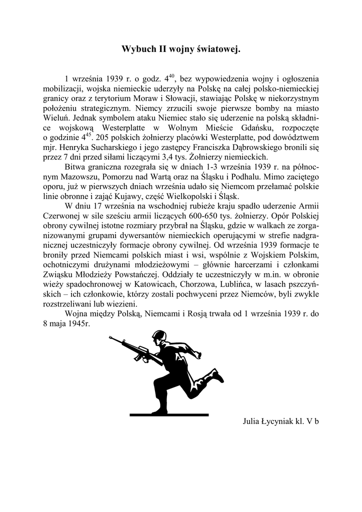 Wybuch II wojny światowej. 1 września 1939 r. o godz. 440, bez wypowiedzenia wojny i ogłoszenia mobilizacji, wojska niemieckie uderzyły na Polskę na całej polsko-niemieckiej granicy oraz z terytorium Moraw i Słowacji, stawiając Polskę w niekorzystnym połoŜeniu strategicznym. Niemcy zrzucili swoje pierwsze bomby na miasto Wieluń. Jednak symbolem ataku Niemiec stało się uderzenie na polską składnice wojskową Westerplatte w Wolnym Mieście Gdańsku, rozpoczęte o godzinie 445. 205 polskich Ŝołnierzy placówki Westerplatte, pod dowództwem mjr. Henryka Sucharskiego i jego zastępcy Franciszka Dąbrowskiego bronili się przez 7 dni przed siłami liczącymi 3,4 tys. śołnierzy niemieckich. Bitwa graniczna rozegrała się w dniach 1-3 września 1939 r. na północnym Mazowszu, Pomorzu nad Wartą oraz na Śląsku i Podhalu. Mimo zaciętego oporu, juŜ w pierwszych dniach września udało się Niemcom przełamać polskie linie obronne i zająć Kujawy, część Wielkopolski i Śląsk. W dniu 17 września na wschodniej rubieŜe kraju spadło uderzenie Armii Czerwonej w sile sześciu armii liczących 600-650 tys. Ŝołnierzy. Opór Polskiej obrony cywilnej istotne rozmiary przybrał na Śląsku, gdzie w walkach ze zorganizowanymi grupami dywersantów niemieckich operującymi w strefie nadgranicznej uczestniczyły formacje obrony cywilnej. Od września 1939 formacje te broniły przed Niemcami polskich miast i wsi, wspólnie z Wojskiem Polskim, ochotniczymi druŜynami młodzieŜowymi – głównie harcerzami i członkami Zwiąsku MłodzieŜy Powstańczej. Oddziały te uczestniczyły w m.in. w obronie wieŜy spadochronowej w Katowicach, Chorzowa, Lublińca, w lasach pszczyńskich – ich członkowie, którzy zostali pochwyceni przez Niemców, byli zwykle rozstrzeliwani lub wiezieni. Wojna między Polską, Niemcami i Rosją trwała od 1 września 1939 r. do 8 maja 1945r. Julia Łycyniak kl. V b