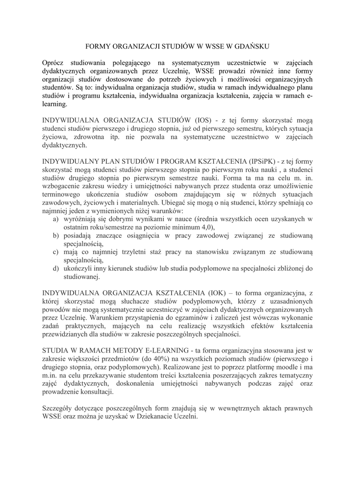 FORMY ORGANIZACJI STUDIÓW W WSSE W GDAŃSKU Oprócz studiowania polegającego na systematycznym uczestnictwie w zajęciach dydaktycznych organizowanych przez Uczelnię, WSSE prowadzi również inne formy organizacji studiów dostosowane do potrzeb życiowych i możliwości organizacyjnych studentów. Są to: indywidualna organizacja studiów, studia w ramach indywidualnego planu studiów i programu kształcenia, indywidualna organizacja kształcenia, zajęcia w ramach elearning. INDYWIDUALNA ORGANIZACJA STUDIÓW (IOS) - z tej formy skorzystać mogą studenci studiów pierwszego i drugiego stopnia, już od pierwszego semestru, których sytuacja życiowa, zdrowotna itp. nie pozwala na systematyczne uczestnictwo w zajęciach dydaktycznych. INDYWIDUALNY PLAN STUDIÓW I PROGRAM KSZTAŁCENIA (IPSiPK) - z tej formy skorzystać mogą studenci studiów pierwszego stopnia po pierwszym roku nauki , a studenci studiów drugiego stopnia po pierwszym semestrze nauki. Forma ta ma na celu m. in. wzbogacenie zakresu wiedzy i umiejętności nabywanych przez studenta oraz umożliwienie terminowego ukończenia studiów osobom znajdującym się w różnych sytuacjach zawodowych, życiowych i materialnych. Ubiegać się mogą o nią studenci, którzy spełniają co najmniej jeden z wymienionych niżej warunków: a) wyróżniają się dobrymi wynikami w nauce (średnia wszystkich ocen uzyskanych w ostatnim roku/semestrze na poziomie minimum 4,0), b) posiadają znaczące osiągnięcia w pracy zawodowej związanej ze studiowaną specjalnością, c) mają co najmniej trzyletni staż pracy na stanowisku związanym ze studiowaną specjalnością, d) ukończyli inny kierunek studiów lub studia podyplomowe na specjalności zbliżonej do studiowanej. INDYWIDUALNA ORGANIZACJA KSZTAŁCENIA (IOK) – to forma organizacyjna, z której skorzystać mogą słuchacze studiów podyplomowych, którzy z uzasadnionych powodów nie mogą systematycznie uczestniczyć w zajęciach dydaktycznych organizowanych przez Uczelnię. Warunkiem przystąpienia do egzaminów i zaliczeń jest wówczas wykonanie zadań praktycznych, mających na celu realizację wszystkich efektów kształcenia przewidzianych dla studiów w zakresie poszczególnych specjalności. STUDIA W RAMACH METODY E-LEARNING - ta forma organizacyjna stosowana jest w zakresie większości przedmiotów (do 40%) na wszystkich poziomach studiów (pierwszego i drugiego stopnia, oraz podyplomowych). Realizowane jest to poprzez platformę moodle i ma m.in. na celu przekazywanie studentom treści kształcenia poszerzających zakres tematyczny zajęć dydaktycznych, doskonalenia umiejętności nabywanych podczas zajęć oraz prowadzenie konsultacji. Szczegóły dotyczące poszczególnych form znajdują się w wewnętrznych aktach prawnych WSSE oraz można je uzyskać w Dziekanacie Uczelni.