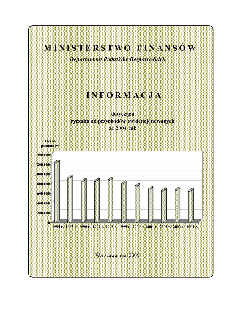 M IN IS TE R S TWO F IN AN S Ó W Departament Podatków Bezpośrednich INF ORM ACJ A dotycząca ryczałtu od przychodów ewidencjonowanych za 2004 rok Liczba podatników 1 400 000 1 200 000 1 000 000 800 000 600 000 400 000 200 000 0 1994 r. 1995 r. 1996 r. 1997 r. 1998 r. 1999 r. 2000 r. 2001 r. 2002 r. 2003 r. 2004 r. Warszawa, maj 2005 I. Wstęp Opodatkowaniu ryczałtem od przychodów ewidencjonowanych podlegają: - przychody osób fizycznych z pozarolniczej działalności gospodarczej, w tym również, gdy działalność ta jest prowadzona w formie spółki cywilnej osób fizycznych lub spółki jawnej osób fizycznych, - przychody osób fizycznych z tytułu umowy najmu, podnajmu, dzierżawy, poddzierżawy lub innych umów o podobnym charakterze. Przychody osób fizycznych z tytułu umowy najmu, podnajmu, dzierżawy, poddzierżawy lub innych umów o podobnym charakterze podlegają opodatkowaniu w formie ryczałtu od przychodów ewidencjonowanych również, jeżeli są osiągane przez osoby prowadzące działalność gospodarczą, a umowa nie jest zawarta w ramach prowadzonej działalności gospodarczej. Ryczałt od przychodów ewidencjonowanych z pozarolniczej działalności gospodarczej opłacają podatnicy w danym roku podatkowym jeżeli: 1/ w roku poprzedzającym rok podatkowy ich przychód z tej działalności nie przekroczył określonej ustawowo kwoty, 2/ rozpoczną wykonywanie działalności w roku podatkowym i nie korzystają z opodatkowania w formie karty podatkowej – bez względu na wysokość przychodów. W 2004 roku podatek w tej formie opłacali podatnicy, którzy w 2003 roku: a/ uzyskali przychody z działalności prowadzonej wyłącznie samodzielnie, w wysokości nie przekraczającej 250.000 euro (1.142.125 zł) lub b/ uzyskali przychody wyłącznie z działalności prowadzonej w formie spółki, a suma przychodów wspólników spółki z tej działalności nie przekroczyła kwoty 250.000 euro (1.142.125 zł). Ryczałt nie ma charakteru obligatoryjnego. Podatnik może wybrać każdą inną formę opodatkowania podatkiem dochodowym. W przypadku spółki takiego wyboru formy opodatkowania muszą dokonać wszyscy wspólnicy. Stawki ryczałtu w 2004 roku wynosiły: • 20% - przychodów osiąganych w zakresie wolnych zawodów, • 17% - przychodów ze świadczenia usług, • 10% - przychodów z odpłatnego zbycia praw majątkowych lub nieruchomości wykorzystywanych w działalności gospodarczej, 2 • 8,5% - przychodów: - z działalności usługowej, w tym z działalności gastronomicznej w zakresie przychodów ze sprzedaży napojów o zawartości alkoholu powyżej 1,5%, - z tytułu umowy najmu, podnajmu, dzierżawy, poddzierżawy lub innych umów o podobnym charakterze do kwoty stanowiącej równowartość 4.000 euro, od nadwyżki ponad tę kwotę ryczałt wynosi 20% , • 5,5% - przychodów z działalności wytwórczej, robót budowlanych lub w zakresie przewozów ładunków taborem samochodowym o ładowności powyżej 2 ton, • 3,0% - przychodów: - z działalności gastronomicznej, z wyjątkiem przychodów ze sprzedaży napojów o zawartości alkoholu powyżej 1,5%, - przychodów z działalności usługowej w zakresie handlu. II. Liczba podatników i przychód W 2004 roku ryczałt od przychodów ewidencjonowanych opłacało ogółem 639.407 podatników, tj. o 16.540 (2,5%) podatników mniej niż w 2003 roku z tego: 576.095 podatników osiągających przychody z pozarolniczej działalności gospodarczej (616.948 podatników w roku 2003) , 63.312 podatników osiągających przychody wyłącznie z tytułu umowy najmu, podnajmu, dzierżawy, poddzierżawy lub innych umów o podobnym charakterze (38.999 podatników w roku 2003). Od 2004 roku opodatkowaniu ryczałtem od przychodów ewidencjonowanych podlegają również przychody z tytułu umowy najmu, podnajmu, dzierżawy, poddzierżawy lub innych umów o podobnym charakterze osiągane przez osoby fizyczne prowadzące pozarolniczą działalność gospodarczą, jeżeli umowa nie została zawarta w ramach prowadzonej działalności gospodarczej. Zmiany ustawowe nie wpłynęły na zwiększenie liczby podatników opłacających ryczałt od przychodów ewidencjonowanych. Liczba podatników opłacających ryczałt z pozarolniczej działalności gospodarczej w porównaniu do roku 2003 zmniejszyła się o 40.853 podatników. 3 1. Podatnicy opłacający podatek dochodowy w formie ryczałtu osiągnęli w 2004 roku ogółem przychód w kwocie 33.167.855 tys. zł Przychód wg stawek i struktura przychodu: Wyszczególnienie Kwota przychodu w tys. zł Struktura % wg stawki 3,0% 10.879.120 32,80 wg stawki 5,5% 14.069.509 42,42 wg stawki 8,5% 7.657.823 23,09 wg stawki 10% 8.623 0,03 wg stawki 17% 123.970 0,37 wg stawki 20% 426.105 1,28 2.705 0,01 33.167.855 100,00 wg stawek określonych przez organ podatkowy Razem w tym: 1/ podatnicy uzyskujący przychody z pozarolniczej działalności gospodarczej przychód wg stawek i struktura przychodu: Wyszczególnienie Kwota przychodu w tys. zł Struktura % wg stawki 3,0% 10.879.120 33,79 wg stawki 5,5% 14.069.509 43,69 wg stawki 8,5% 7.096.404 22,04 wg stawki 10% 8.623 0,03 wg stawki 17% 123.970 0,38 wg stawki 20% 20.620 0,06 2.526 0,01 32.200.772 100,00 wg stawek określonych przez organ podatkowy Razem 4 2/ podatnicy uzyskujący przychody wyłącznie z tytułu umowy najmu, podnajmu, dzierżawy, poddzierżawy lub innych umów o podobnym charakterze przychód wg stawek i struktura przychodu: Wyszczególnienie Kwota przychodu w tys. zł Struktura % wg stawki 8,5% 561.419 58,05 wg stawki 20% 405.485 41,93 179 0,02 967.083 100,00 wg stawek określonych przez organ podatkowy Razem W ogólnej kwocie przychodów przychody osób fizycznych prowadzących pozarolniczą działalność gospodarczą wyniosły 32.200.772 tys. zł i stanowiły 97,1 %, a osób fizycznych osiągających przychody wyłącznie z tytułu umowy najmu, podnajmu, dzierżawy, poddzierżawy lub innych umów o podobnym charakterze wyni