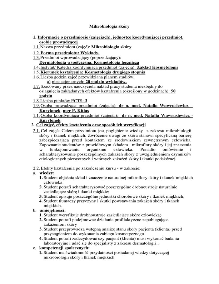 Mikrobiologia skóry 1. Informacje o przedmiocie (zajęciach