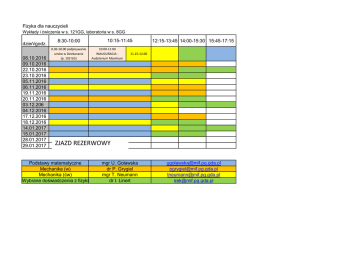 Fizyka dla nauczycieli Wykłady i ćwiczenia w s. 121GG, laboratoria w s. 8GG dzień/godz. 08.10.2016 09.10.2016 22.10.2016 23.10.2016 05.11.2016 06.11.2016 19.11.2016 20.11.2016 03.12.206 04.12.2016 17.12.2016 18.12.2016 14.01.2017 15.01.2017 28.01.2017 29.01.2017 8:30-10:00 8.30-10.00 podpisywanie umów w Dziekanacie (p. 102 GG) 10:15-11:45 10:00-11:00 INAUGURACJA Audytorium Maximum 12:15-13:45 14:00-15:30 15:45-17:15 11.15-12.00 ZJAZD REZERWOWY Podstawy matematyczne Mechanika (w) Mechanika (ćw) Wybrane doświadczenia z fizyki mgr U. Goławska dr P. Grygiel mgr T. Neumann dr I. Linert [email protected] [email protected] [email protected] [email protected]