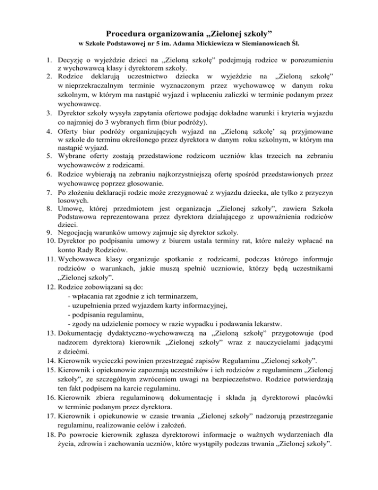 Procedura organizowania „Zielonej szkoły” w Szkole Podstawowej nr 5 im. Adama Mickiewicza w Siemianowicach Śl. 1. Decyzję o wyjeździe dzieci na „Zieloną szkołę” podejmują rodzice w porozumieniu z wychowawcą klasy i dyrektorem szkoły. 2. Rodzice deklarują uczestnictwo dziecka w wyjeździe na „Zieloną szkołę” w nieprzekraczalnym terminie wyznaczonym przez wychowawcę w danym roku szkolnym, w którym ma nastąpić wyjazd i wpłaceniu zaliczki w terminie podanym przez wychowawcę. 3. Dyrektor szkoły wysyła zapytania ofertowe podając dokładne warunki i kryteria wyjazdu co najmniej do 3 wybranych firm (biur podróży). 4. Oferty biur podróży organizujących wyjazd na „Zieloną szkołę’ są przyjmowane w szkole do terminu określonego przez dyrektora w danym roku szkolnym, w którym ma nastąpić wyjazd. 5. Wybrane oferty zostają przedstawione rodzicom uczniów klas trzecich na zebraniu wychowawców z rodzicami. 6. Rodzice wybierają na zebraniu najkorzystniejszą ofertę spośród przedstawionych przez wychowawcę poprzez głosowanie. 7. Po złożeniu deklaracji rodzic może zrezygnować z wyjazdu dziecka, ale tylko z przyczyn losowych. 8. Umowę, której przedmiotem jest organizacja „Zielonej szkoły”, zawiera Szkoła Podstawowa reprezentowana przez dyrektora działającego z upoważnienia rodziców dzieci. 9. Negocjacją warunków umowy zajmuje się dyrektor szkoły. 10. Dyrektor po podpisaniu umowy z biurem ustala terminy rat, które należy wpłacać na konto Rady Rodziców. 11. Wychowawca klasy organizuje spotkanie z rodzicami, podczas którego informuje rodziców o warunkach, jakie muszą spełnić uczniowie, którzy będą uczestnikami „Zielonej szkoły”. 12. Rodzice zobowiązani są do: - wpłacania rat zgodnie z ich terminarzem, - uzupełnienia przed wyjazdem karty informacyjnej, - podpisania regulaminu, - zgody na udzielenie pomocy w razie wypadku i podawania lekarstw. 13. Dokumentację dydaktyczno-wychowawczą na „Zieloną szkołę” przygotowuje (pod nadzorem dyrektora) kierownik „Zielonej szkoły” wraz z nauczycielami jadącymi z dziećmi. 14. Kierownik wycieczki powinien przestrzegać zapisów Regulaminu „Zielonej szkoły”. 15. Kierownik i opiekunowie zapoznają uczestników i ich rodziców z regulaminem „Zielonej szkoły”, ze szczególnym zwróceniem uwagi na bezpieczeństwo. Rodzice potwierdzają ten fakt podpisem na karcie regulaminu. 16. Kierownik zbiera regulaminową dokumentację i składa ją dyrektorowi placówki w terminie podanym przez dyrektora. 17. Kierownik i opiekunowie w czasie trwania „Zielonej szkoły” nadzorują przestrzeganie regulaminu, realizowanie celów i założeń. 18. Po powrocie kierownik zgłasza dyrektorowi informacje o ważnych wydarzeniach dla życia, zdrowia i zachowania uczniów, które wystąpiły podczas trwania „Zielonej szkoły”. 19. Po powrocie kierownik organizuje zebranie z rodzicami - podsumowanie „Zielonej szkoły”. 20. Informację o zachowaniu ucznia na „Zielonej szkole” kierownik przekaże wychowawcy kl. IV.