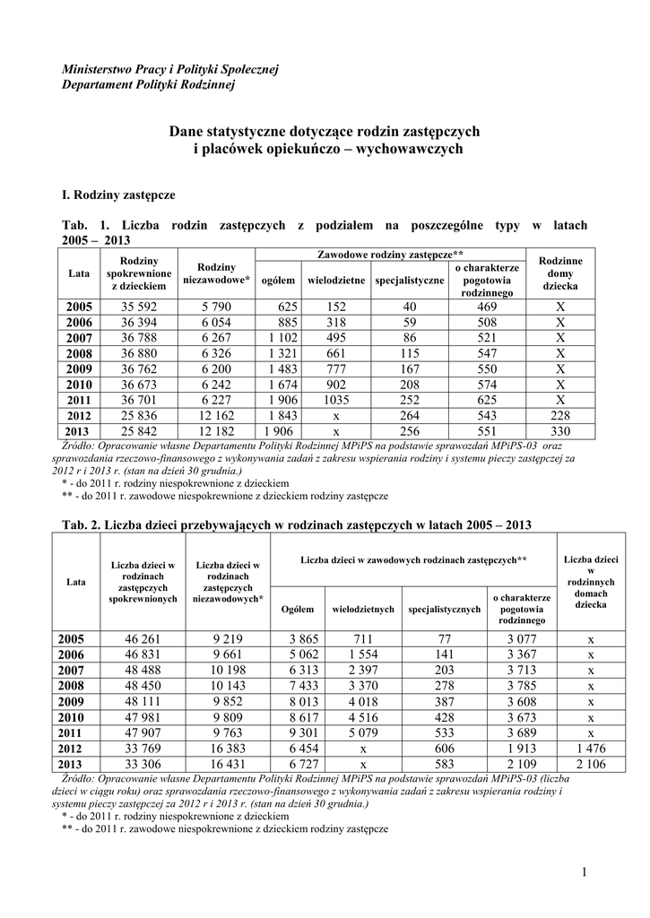 Ministerstwo Pracy i Polityki Społecznej Departament Polityki Rodzinnej Dane statystyczne dotyczące rodzin zastępczych i placówek opiekuńczo – wychowawczych I. Rodziny zastępcze Tab. 1. Liczba rodzin zastępczych z podziałem na poszczególne typy w latach 2005 – 2013 Lata 2005 2006 2007 2008 2009 2010 2011 2012 2013 Rodziny spokrewnione z dzieckiem Rodziny niezawodowe* ogółem 35 592 36 394 36 788 36 880 36 762 36 673 36 701 25 836 25 842 5 790 6 054 6 267 6 326 6 200 6 242 6 227 12 162 12 182 625 885 1 102 1 321 1 483 1 674 1 906 1 843 1 906 Zawodowe rodziny zastępcze** o charakterze wielodzietne specjalistyczne pogotowia rodzinnego 152 318 495 661 777 902 1035 x x 40 59 86 115 167 208 252 264 256 Rodzinne domy dziecka 469 508 521 547 550 574 625 543 551 X X X X X X X 228 330 Źródło: Opracowanie własne Departamentu Polityki Rodzinnej MPiPS na podstawie sprawozdań MPiPS-03 oraz sprawozdania rzeczowo-finansowego z wykonywania zadań z zakresu wspierania rodziny i systemu pieczy zastępczej za 2012 r i 2013 r. (stan na dzień 30 grudnia.) * - do 2011 r. rodziny niespokrewnione z dzieckiem ** - do 2011 r. zawodowe niespokrewnione z dzieckiem rodziny zastępcze Tab. 2. Liczba dzieci przebywających w rodzinach zastępczych w latach 2005 – 2013 Lata 2005 2006 2007 2008 2009 2010 2011 2012 2013 Liczba dzieci w rodzinach zastępczych spokrewnionych 46 261 46 831 48 488 48 450 48 111 47 981 47 907 33 769 33 306 Liczba dzieci w rodzinach zastępczych niezawodowych* 9 219 9 661 10 198 10 143 9 852 9 809 9 763 16 383 16 431 Liczba dzieci w zawodowych rodzinach zastępczych** Ogółem 3 865 5 062 6 313 7 433 8 013 8 617 9 301 6 454 6 727 wielodzietnych specjalistycznych o charakterze pogotowia rodzinnego 711 1 554 2 397 3 370 4 018 4 516 5 079 x x 77 141 203 278 387 428 533 606 583 3 077 3 367 3 713 3 785 3 608 3 673 3 689 1 913 2 109 Liczba dzieci w rodzinnych domach dziecka x x x x x x x 1 476 2 106 Źródło: Opracowanie własne Departamentu Polityki Rodzinnej MPiPS na podstawie sprawozdań MPiPS-03 (liczba dzieci w ciągu roku) oraz sprawozdania rzeczowo-finansowego z wykonywania zadań z zakresu wspierania rodziny i systemu pieczy zastępczej za 2012 r i 2013 r. (stan na dzień 30 grudnia.) * - do 2011 r. rodziny niespokrewnione z dzieckiem ** - do 2011 r. zawodowe niespokrewnione z dzieckiem rodziny zastępcze 1 II. Placówki opiekuńczo-wychowawcze Tab. 1. Liczba placówek opiekuńczo- wychowawczych z podziałem na poszczególne typy Lata 2005 2006 2007 2008 2009 2010 2011 2012 2013 Placówki Placówki Placówki opiekuńczoopiekuńczoopiekuńczowychowawcze typu wychowawcze typu wychowawcze typu interwencyjnego rodzinnego socjalizacyjnego 55 52 44 37 38 35 31 123 149 267 263 274 279 267 282 282 267 242 301 283 263 259 268 277 291 515 625 Placówki specjalistycznoterapeutyczne* 102 129 154 166 189 177 181 13 30 Źródło: Opracowanie własne Departamentu Polityki Rodzinnej MPiPS na podstawie sprawozdań MPiPS-03 oraz sprawozdania rzeczowo-finansowego z wykonywania zadań z zakresu wspierania rodziny i systemu pieczy zastępczej za 2012 r. i 2013 r. (stan na dzień 30 grudnia) * do 2011 placówki wielofunkcyjne Tab. 2. Liczba dzieci przebywających w poszczególnych typach placówek opiekuńczowychowawczych Lata 2005 2006 2007 2008 2009 2010 2011 2012 2013 Liczba dzieci w placówkach opiekuńczowychowawczych typu interwencyjnego Liczba dzieci w placówkach opiekuńczowychowawczych typu rodzinnego Liczba dzieci w placówkach opiekuńczowychowawczych typu socjalizacyjnego Liczba dzieci w placówkach specjalistycznoterapeutycznych* 4 157 4 998 4 619 2 955 2 628 2 058 1 819 2 217 1 927 2 252 2 187 2 261 2 226 2 242 2 495 2 524 2 232 2 030 16 527 13 951 12 505 11 343 11 106 10 660 10 787 15 967 15 626 7 736 10 890 12 234 13 291 13 736 13 404 13 003 109 366 Źródło: Opracowanie własne Departamentu Polityki Rodzinnej MPiPS na podstawie sprawozdań MPiPS-03 (liczba dzieci w ciągu roku) oraz sprawozdania rzeczowo-finansowego z wykonywania zadań z zakresu wspierania rodziny i systemu pieczy zastępczej za 2021 r. i 2013 r. (stan na dzień 30 grudnia ) * do 2011 placówki wielofunkcyjne 2