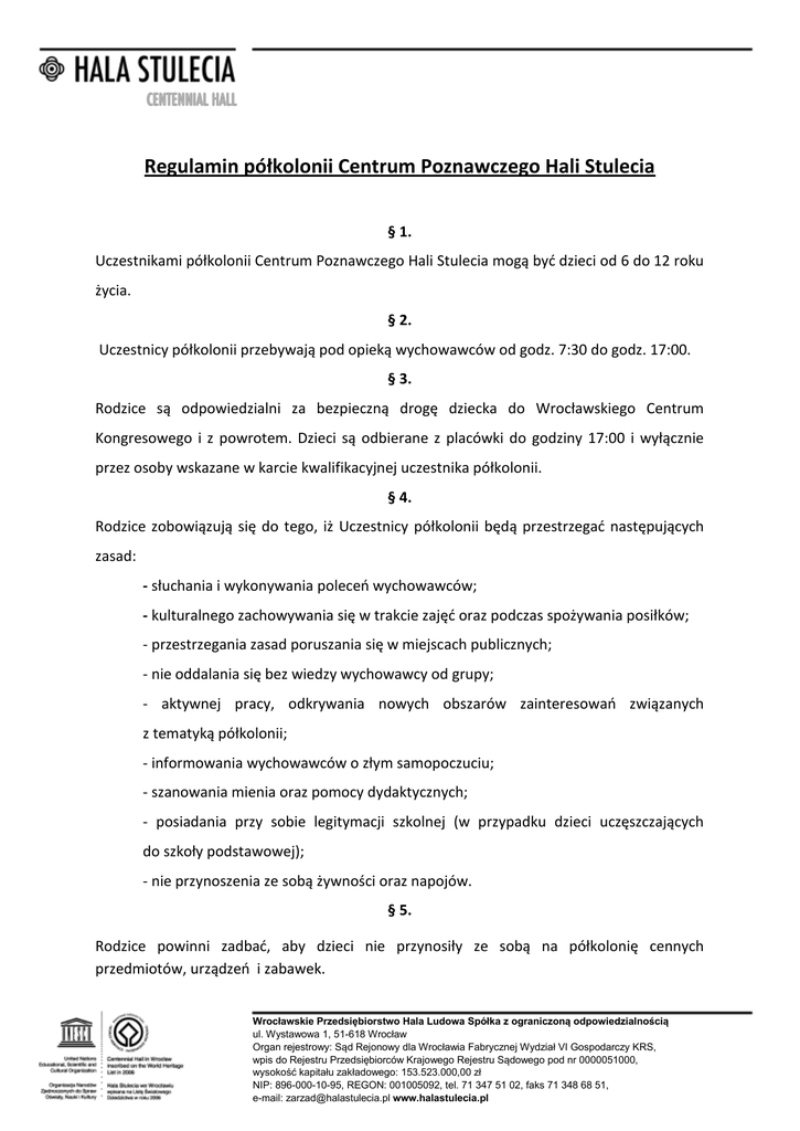 Regulamin półkolonii Centrum Poznawczego Hali Stulecia § 1. Uczestnikami półkolonii Centrum Poznawczego Hali Stulecia mogą być dzieci od 6 do 12 roku życia. § 2. Uczestnicy półkolonii przebywają pod opieką wychowawców od godz. 7:30 do godz. 17:00. § 3. Rodzice są odpowiedzialni za bezpieczną drogę dziecka do Wrocławskiego Centrum Kongresowego i z powrotem. Dzieci są odbierane z placówki do godziny 17:00 i wyłącznie przez osoby wskazane w karcie kwalifikacyjnej uczestnika półkolonii. § 4. Rodzice zobowiązują się do tego, iż Uczestnicy półkolonii będą przestrzegać następujących zasad: - słuchania i wykonywania poleceń wychowawców; - kulturalnego zachowywania się w trakcie zajęć oraz podczas spożywania posiłków; - przestrzegania zasad poruszania się w miejscach publicznych; - nie oddalania się bez wiedzy wychowawcy od grupy; - aktywnej pracy, odkrywania nowych obszarów zainteresowań związanych z tematyką półkolonii; - informowania wychowawców o złym samopoczuciu; - szanowania mienia oraz pomocy dydaktycznych; - posiadania przy sobie legitymacji szkolnej (w przypadku dzieci uczęszczających do szkoły podstawowej); - nie przynoszenia ze sobą żywności oraz napojów. § 5. Rodzice powinni zadbać, aby dzieci nie przynosiły ze sobą na półkolonię cennych przedmiotów, urządzeń i zabawek. Wrocławskie Przedsiębiorstwo Hala Ludowa Spółka z ograniczoną odpowiedzialnością ul. Wystawowa 1, 51-618 Wrocław Organ rejestrowy: Sąd Rejonowy dla Wrocławia Fabrycznej Wydział VI Gospodarczy KRS, wpis do Rejestru Przedsiębiorców Krajowego Rejestru Sądowego pod nr 0000051000, wysokość kapitału zakładowego: 153.523.000,00 zł NIP: 896-000-10-95, REGON: 001005092, tel. 71 347 51 02, faks 71 348 68 51, e-mail: [email protected] www.halastulecia.pl § 6. Organizatorzy nie odpowiadają za rzeczy zgubione przez uczestników podczas półkolonii oraz za zniszczenie rzeczy należących do dzieci, a dokonanych przez innych uczestników. § 7. Rodzice Uczestników ponoszą pełną odpowiedzialność materialną za ewentualne szkody wyrządzone w czasie pobytu na półkolonii przez Uczestnika będącego ich dzieckiem. §8. W przypadku rażącego naruszenia niniejszego Regulaminu lub norm społecznych, Organizatorowi przysługuje prawo do podjęcia decyzji o usunięciu Uczestnika półkolonii z placówki i uczestniczenia w zajęciach bez zwrotu jakichkolwiek kosztów. …………………………………………………. (Data i czytelny podpis) Wrocławskie Przedsiębiorstwo Hala Ludowa Spółka z ograniczoną odpowiedzialnością ul. Wystawowa 1, 51-618 Wrocław Organ rejestrowy: Sąd Rejonowy dla Wrocławia Fabrycznej Wydział VI Gospodarczy KRS, wpis do Rejestru Przedsiębiorców Krajowego Rejestru Sądowego pod nr 0000051000, wysokość kapitału zakładowego: 153.523.000,00 zł NIP: 896-000-10-95, REGON: 001005092, tel. 71 347 51 02, faks 71 348 68 51, e-mail: [email protected] www.halastulecia.pl