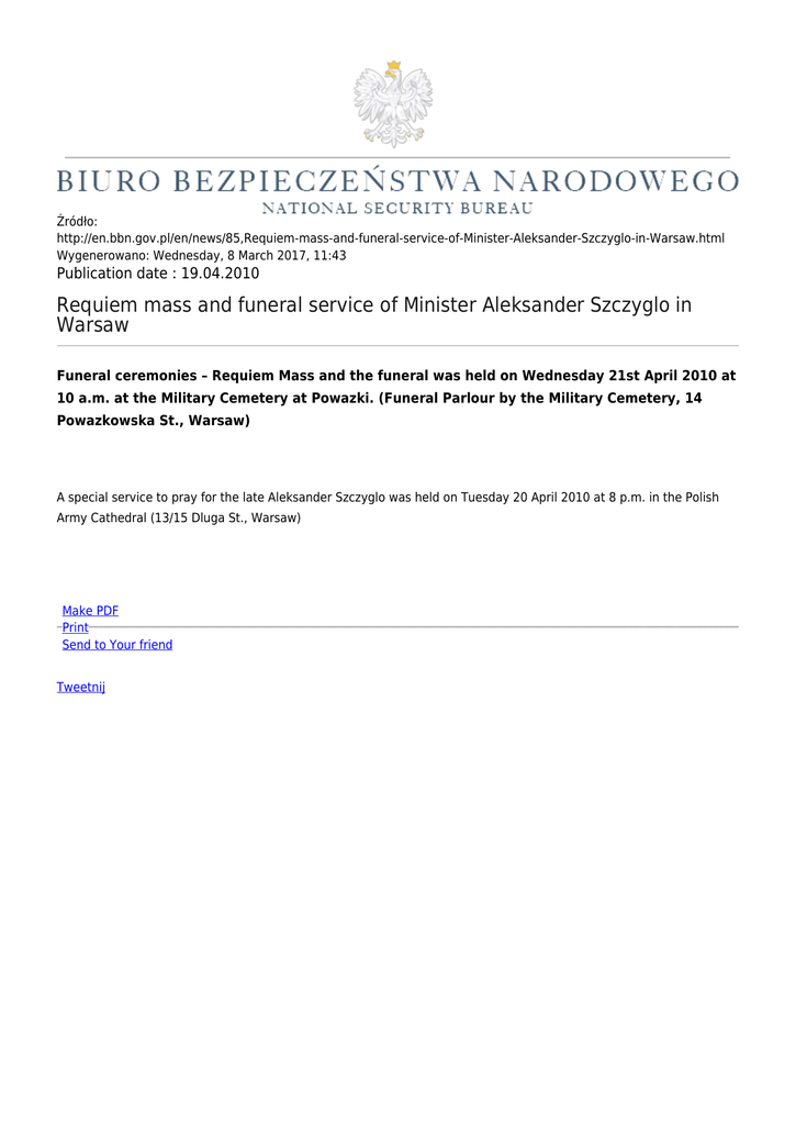 Źródło: http://en.bbn.gov.pl/en/news/85,Requiem-mass-and-funeral-service-of-Minister-Aleksander-Szczyglo-in-Warsaw.html Wygenerowano: Wednesday, 8 March 2017, 11:43 Publication date : 19.04.2010 Requiem mass and funeral service of Minister Aleksander Szczyglo in Warsaw Funeral ceremonies – Requiem Mass and the funeral was held on Wednesday 21st April 2010 at 10 a.m. at the Military Cemetery at Powazki. (Funeral Parlour by the Military Cemetery, 14 Powazkowska St., Warsaw) A special service to pray for the late Aleksander Szczyglo was held on Tuesday 20 April 2010 at 8 p.m. in the Polish Army Cathedral (13/15 Dluga St., Warsaw) Make PDF Print Send to Your friend Tweetnij