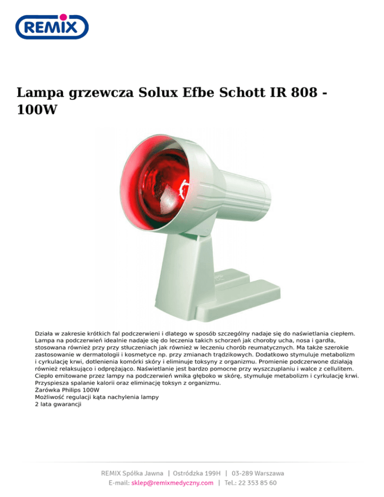 Lampa grzewcza Solux Efbe Schott IR 808 100W Działa w zakresie krótkich fal podczerwieni i dlatego w sposób szczególny nadaje się do naświetlania ciepłem. Lampa na podczerwień idealnie nadaje się do leczenia takich schorzeń jak choroby ucha, nosa i gardła, stosowana również przy przy stłuczeniach jak również w leczeniu chorób reumatycznych. Ma także szerokie zastosowanie w dermatologii i kosmetyce np. przy zmianach trądzikowych. Dodatkowo stymuluje metabolizm i cyrkulację krwi, dotlenienia komórki skóry i eliminuje toksyny z organizmu. Promienie podczerwone działają również relaksująco i odprężająco. Naświetlanie jest bardzo pomocne przy wyszczuplaniu i walce z cellulitem. Ciepło emitowane przez lampy na podczerwień wnika głęboko w skórę, stymuluje metabolizm i cyrkulację krwi. Przyspiesza spalanie kalorii oraz eliminację toksyn z organizmu. Żarówka Philips 100W Możliwość regulacji kąta nachylenia lampy 2 lata gwarancji