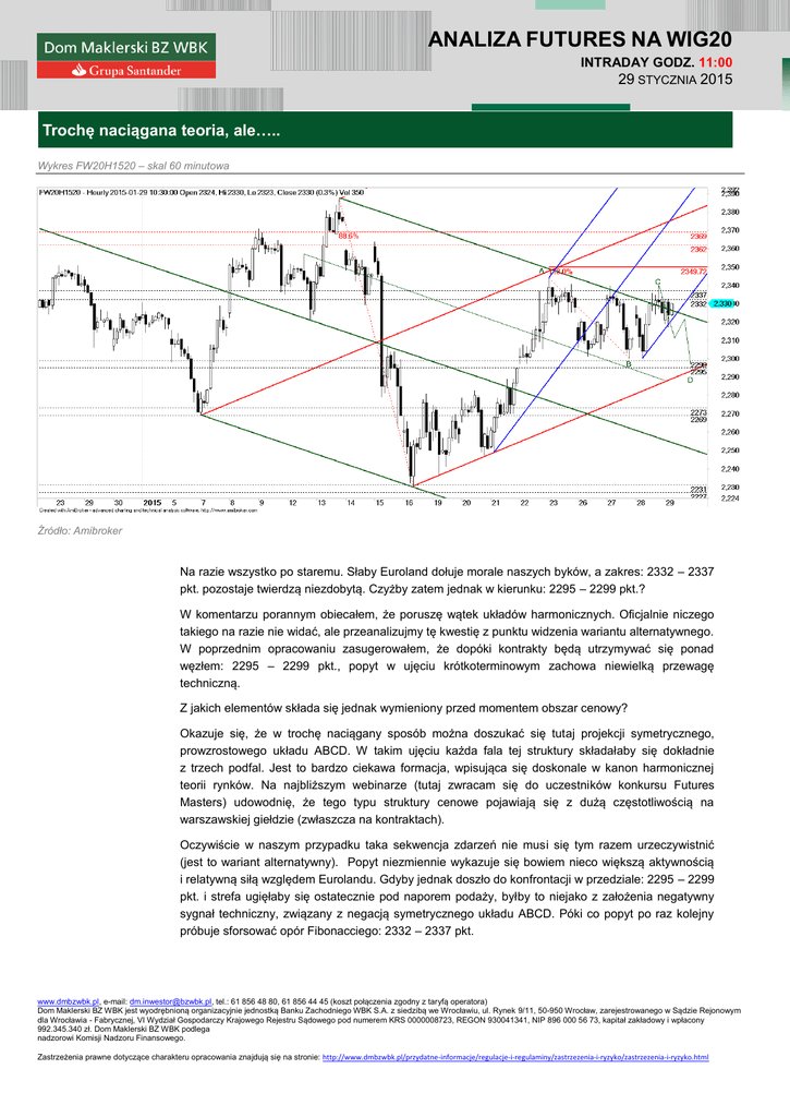 ANALIZA FUTURES NA WIG20 INTRADAY GODZ. 11:00 29 STYCZNIA 2015 Trochę naciągana teoria, ale….. Wykres FW20H1520 – skal 60 minutowa Źródło: Amibroker Na razie wszystko po staremu. Słaby Euroland dołuje morale naszych byków, a zakres: 2332 – 2337 pkt. pozostaje twierdzą niezdobytą. Czyżby zatem jednak w kierunku: 2295 – 2299 pkt.? W komentarzu porannym obiecałem, że poruszę wątek układów harmonicznych. Oficjalnie niczego takiego na razie nie widać, ale przeanalizujmy tę kwestię z punktu widzenia wariantu alternatywnego. W poprzednim opracowaniu zasugerowałem, że dopóki kontrakty będą utrzymywać się ponad węzłem: 2295 – 2299 pkt., popyt w ujęciu krótkoterminowym zachowa niewielką przewagę techniczną. Z jakich elementów składa się jednak wymieniony przed momentem obszar cenowy? Okazuje się, że w trochę naciągany sposób można doszukać się tutaj projekcji symetrycznego, prowzrostowego układu ABCD. W takim ujęciu każda fala tej struktury składałaby się dokładnie z trzech podfal. Jest to bardzo ciekawa formacja, wpisująca się doskonale w kanon harmonicznej teorii rynków. Na najbliższym webinarze (tutaj zwracam się do uczestników konkursu Futures Masters) udowodnię, że tego typu struktury cenowe pojawiają się z dużą częstotliwością na warszawskiej giełdzie (zwłaszcza na kontraktach). Oczywiście w naszym przypadku taka sekwencja zdarzeń nie musi się tym razem urzeczywistnić (jest to wariant alternatywny). Popyt niezmiennie wykazuje się bowiem nieco większą aktywnością i relatywną siłą względem Eurolandu. Gdyby jednak doszło do konfrontacji w przedziale: 2295 – 2299 pkt. i strefa ugięłaby się ostatecznie pod naporem podaży, byłby to niejako z założenia negatywny sygnał techniczny, związany z negacją symetrycznego układu ABCD. Póki co popyt po raz kolejny próbuje sforsować opór Fibonacciego: 2332 – 2337 pkt. www.dmbzwbk.pl, e-mail: [email protected], tel.: 61 856 48 80, 61 856 44 45 (koszt połączenia zgodny z taryfą operatora) Dom Maklerski BZ WBK jest wyodrębnioną organizacyjnie jednostką Banku Zachodniego WBK S.A. z siedzibą we Wrocławiu, ul. Rynek 9/11, 50-950 Wrocław, zarejestrowanego w Sądzie Rejonowym dla Wrocławia - Fabrycznej, VI Wydział Gospodarczy Krajowego Rejestru Sądowego pod numerem KRS 0000008723, REGON 930041341, NIP 896 000 56 73, kapitał zakładowy i wpłacony 992.345.340 zł. Dom Maklerski BZ WBK podlega nadzorowi Komisji Nadzoru Finansowego. Zastrzeżenia prawne dotyczące charakteru opracowania znajdują się na stronie: http://www.dmbzwbk.pl/przydatne-informacje/regulacje-i-regulaminy/zastrzezenia-i-ryzyko/zastrzezenia-i-ryzyko.html Paweł Danielewicz Analityk techniczny DM BZWBK [email protected] ANALIZA FUTURES NA WIG20 INTRADAY GODZ. 09:30 29 STYCZNIA 2015 Neutralny początek Wykres FW20H1520 – skal 60 minutowa Źródło: Amibroker Po raz kolejny popyt uaktywnił się wczoraj w rejonie intradayowej strefy wsparcia: 2295 – 2299 pkt., ale pojawiły się problemy z kontynuacją ruchu już w okolicy węzła podażowego: 2332 – 2337 pkt. Kontrakty pozostały zatem uwięzione w stosunkowo wąskim korytarzu cenowym, a styl handlu – z ruchami przeciwstawnymi w tle – nie uległ zmianie. Tak najkrócej można opisać przebieg wczorajszej odsłony. Dzisiejszego otwarcia z kolei (z niewielką luką bessy) nie można traktować jako sygnału technicznego. Transakcje nadal zawierane są bowiem w znanym nam już przedziale cenowym. Zgodnie z logiką ostatnich wydarzeń kontrakty mogłyby teraz z powodzeniem obrać kierunku południowy, by ponownie znaleźć się w rejonie węzła: 2295 – 2299 pkt, gdzie popyt zacząłby pewnie wywierać większą presję. W którymś momencie jednak musi dojść do przerwania tych powtarzających się sekwencji zdarzeń. Rynek bowiem aż tak przewidywalny z natury nie jest. Jak już wiemy z poprzednich opracowań, przełamanie węzła: 2332 – 2337 pkt. wraz z filtrem cenowym 2350 pkt. sygnalizowałoby możliwość wejścia kontraktów w nieco silniejszą fazę odreagowania, z opcją testu kluczowej strefy oporu: 2362 – 2369 pkt. Z punktu widzenia ujęcia intradayowego jest to na razie scenariusz bazowy, gdyż kontrakty utrzymują się niezmiennie ponad znanym nam już wsparciem technicznym: 2295 – 2299 pkt. Dopiero wybicie tej strefy groziłoby negacją całego, inicjowanego z przedziału cenowego: 2227 – 2231 pkt. ruchu wzrostowego. Tyle tylko, że węzeł: 2332 – 2337 pkt. odgrywa w dalszym ciągu nieprzypadkową rolę na wykresie. Paweł Danielewicz Analityk techniczny DM BZWBK [email protected] www.dmbzwbk.pl, e-mail: [email protected], tel.: 61 856 48 80, 61 856 44 45 (koszt połączenia zgodny z taryfą operatora) Dom Maklerski BZ WBK jest wyodrębnioną organizacyjnie jednostką Banku Zachodniego WBK S.A. z siedzibą we Wrocławiu, ul. Rynek 9/11, 50-950 Wrocław, zarejestrowanego w Sądzie Rejonowym dla Wrocławia - Fabrycznej, VI Wydział Gospodarczy Krajowego Rejestru Sądowego pod numerem KRS 0000008723, REGON 930041341, NIP 896 000 56 73, kapitał zakładowy i wpłacony 992.345.340 zł. Dom Maklerski BZ WBK podlega nadzorowi Komisji Nadzoru Finansowego. Zastrzeżenia prawne dotyczące charakteru opracowania znajdują się na stronie: http://www.dmbzwbk.pl/przydatne-informacje/regulacje-i-regulaminy/zastrzezenia-i-ryzyko/zastrzezenia-i-ryzyko.html ANALIZA FUTURES NA WIG20 INTRADAY GODZ. 09:30 29 STYCZNIA 2015 www.dmbzwbk.pl, e-mail: [email protected], tel.: 61 856 48 80, 61 856 44 45 (koszt połączenia zgodny z taryfą operatora) Dom Maklerski BZ WBK jest wyodrębnioną organizacyjnie jednostką Banku Zachodniego WBK S.A. z siedzibą we Wrocławiu, ul. Rynek 9/11, 50-950 Wrocław, zarejestrowanego w Sądzie Rejonowym dla Wrocławia - Fabrycznej, VI Wydział Gospodarczy Krajowego Rejestru Sądowego pod numerem KRS 0000008723, REGON 930041341, NIP 896 000 56 73, kapitał zakładowy i wpłacony 992.345