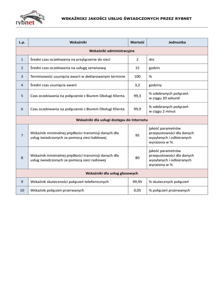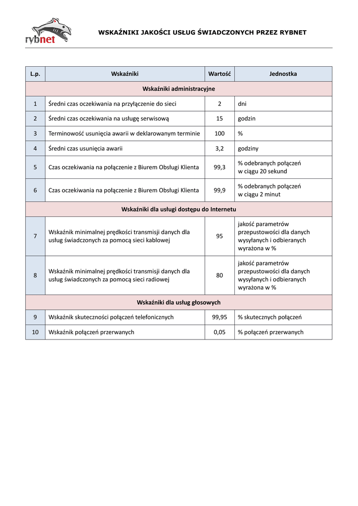 Wskaźniki jakości usług świadczonych przez Rybnet