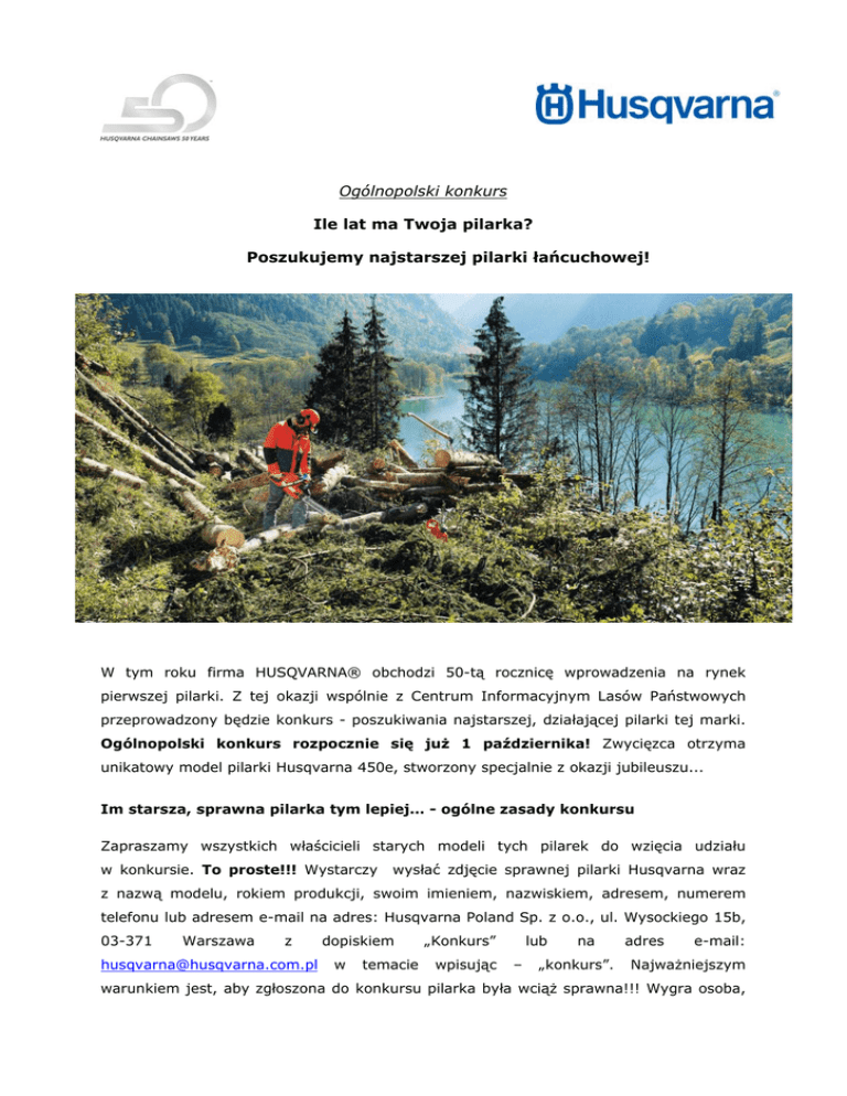 Ogólnopolski konkurs Ile lat ma Twoja pilarka? Poszukujemy najstarszej pilarki łańcuchowej! W tym roku firma HUSQVARNA® obchodzi 50-tą rocznicę wprowadzenia na rynek pierwszej pilarki. Z tej okazji wspólnie z Centrum Informacyjnym Lasów Państwowych przeprowadzony będzie konkurs - poszukiwania najstarszej, działającej pilarki tej marki. Ogólnopolski konkurs rozpocznie się już 1 października! Zwycięzca otrzyma unikatowy model pilarki Husqvarna 450e, stworzony specjalnie z okazji jubileuszu... Im starsza, sprawna pilarka tym lepiej… - ogólne zasady konkursu Zapraszamy wszystkich właścicieli starych modeli tych pilarek do wzięcia udziału w konkursie. To proste!!! Wystarczy wysłać zdjęcie sprawnej pilarki Husqvarna wraz z nazwą modelu, rokiem produkcji, swoim imieniem, nazwiskiem, adresem, numerem telefonu lub adresem e-mail na adres: Husqvarna Poland Sp. z o.o., ul. Wysockiego 15b, 03-371 Warszawa z [email protected] dopiskiem w temacie „Konkurs” wpisując lub – na „konkurs”. adres e-mail: Najważniejszym warunkiem jest, aby zgłoszona do konkursu pilarka była wciąż sprawna!!! Wygra osoba, która prześle zdjęcie najstarszej pilarki Husqvarna!!! W przypadku udziału w konkursie dwóch maszyn z takim samym rokiem produkcji - wygrywa zgłoszenie, które zostało nadesłane wcześniej (decyduje data na stemplu pocztowym/ data nadesłania e-maila). Na zgłoszenia czekamy do 30 listopada! Wszyscy uczestnicy konkursu zostaną nagrodzeni!!! Może Twoja pilarka „była świadkiem” ważnego wydarzenia w życiu Twoim, dziadków czy rodziców… może związane są z nią jakieś wspomnienia, niezapomniane historie?... Jeśli tak, to wraz ze zdjęciem pilarki prześlij krótki opis tej historii. Najciekawsze wspomnienia zostaną opublikowane, a jej autorzy dodatkowo nagrodzeni!!! Konkurs zaczynamy już 1 października!!! Zapraszamy!!! Uczestnicy konkursu wyrażają zgodę na przetwarzanie swoich danych osobowych przez Organizatora do celów związanych z realizacją niniejszego konkursu.