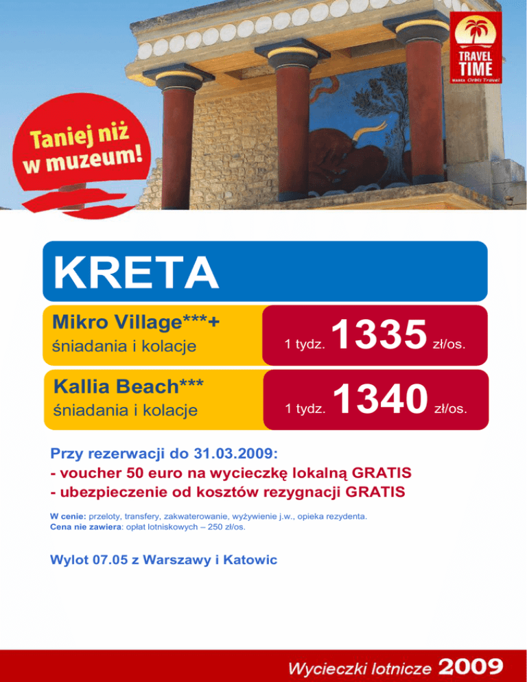 KRETA Mikro Village***+ śniadania i kolacje 1 tydz. 1335 zł/os. 1 tydz. 1340 zł/os. Kallia Beach*** śniadania i kolacje Przy rezerwacji do 31.03.2009: - voucher 50 euro na wycieczkę lokalną GRATIS - ubezpieczenie od kosztów rezygnacji GRATIS W cenie: przeloty, transfery, zakwaterowanie, wyżywienie j.w., opieka rezydenta. Cena nie zawiera: opłat lotniskowych – 250 zł/os. Wylot 07.05 z Warszawy i Katowic