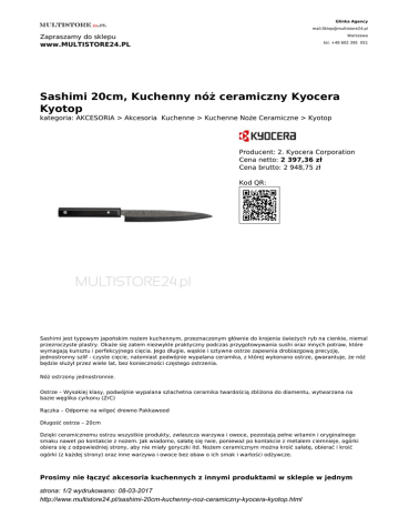 Glinka Agency mail;[email protected] Zapraszamy do sklepu www.MULTISTORE24.PL Warszawa tel. +48 602 395 051 Sashimi 20cm, Kuchenny nóż ceramiczny Kyocera Kyotop kategoria: AKCESORIA > Akcesoria Kuchenne > Kuchenne Noże Ceramiczne > Kyotop Producent: 2. Kyocera Corporation Cena netto: 2 397,36 zł Cena brutto: 2 948,75 zł Kod QR: Sashimi jest typowym japońskim nożem kuchennym, przeznaczonym głównie do krojenia świeżych ryb na cienkie, niemal przezroczyste plastry. Okaże się zatem niezwykle praktyczny podczas przygotowywania sushi oraz innych potraw, które wymagają kunsztu i perfekcyjnego cięcia. Jego długie, wąskie i sztywne ostrze zapewnia drobiazgową precyzję, jednostronny szlif - czyste cięcie, natomiast podwójnie wypalana ceramika, z której wykonano ostrze, gwarantuje, że nóż będzie służył przez wiele lat, bez konieczności częstego ostrzenia. Nóż ostrzony jednostronnie. Ostrze – Wysokiej klasy, podwójnie wypalana szlachetna ceramika twardością zbliżona do diamentu, wytwarzana na bazie węglika cyrkonu (ZrC) Rączka – Odporne na wilgoć drewno Pakkawood Długość ostrza – 20cm Dzięki ceramicznemu ostrzu wszystkie produkty, zwłaszcza warzywa i owoce, pozostają pełne witamin i oryginalnego smaku nawet po kontakcie z nożem. Jak wiadomo, sałatę się rwie, ponieważ po kontakcie z metalem ciemnieje, ogórki obiera się z odpowiedniej strony, aby nie miały goryczki itd. Nożem ceramicznym można kroić sałatę, obierać i kroić ogórki (z każdej strony) oraz inne warzywa i owoce bez obaw o ich smak i wartości odżywcze. Prosimy nie łączyć akcesoria kuchennych z innymi produktami w sklepie w jednym strona: 1/2 wydrukowano: 08-03-2017 http://www.multistore24.pl/sashimi-20cm-kuchenny-noz-ceramiczny-kyocera-kyotop.html zamówieniu, strona: 2/2 wydrukowano: 08-03-2017 http://www.multistore24.pl/sashimi-20cm-kuchenny-noz-ceramiczny-kyocera-kyotop.html