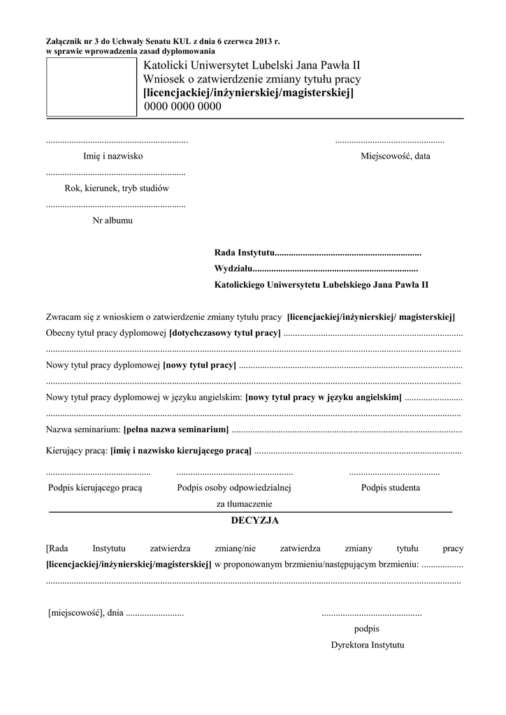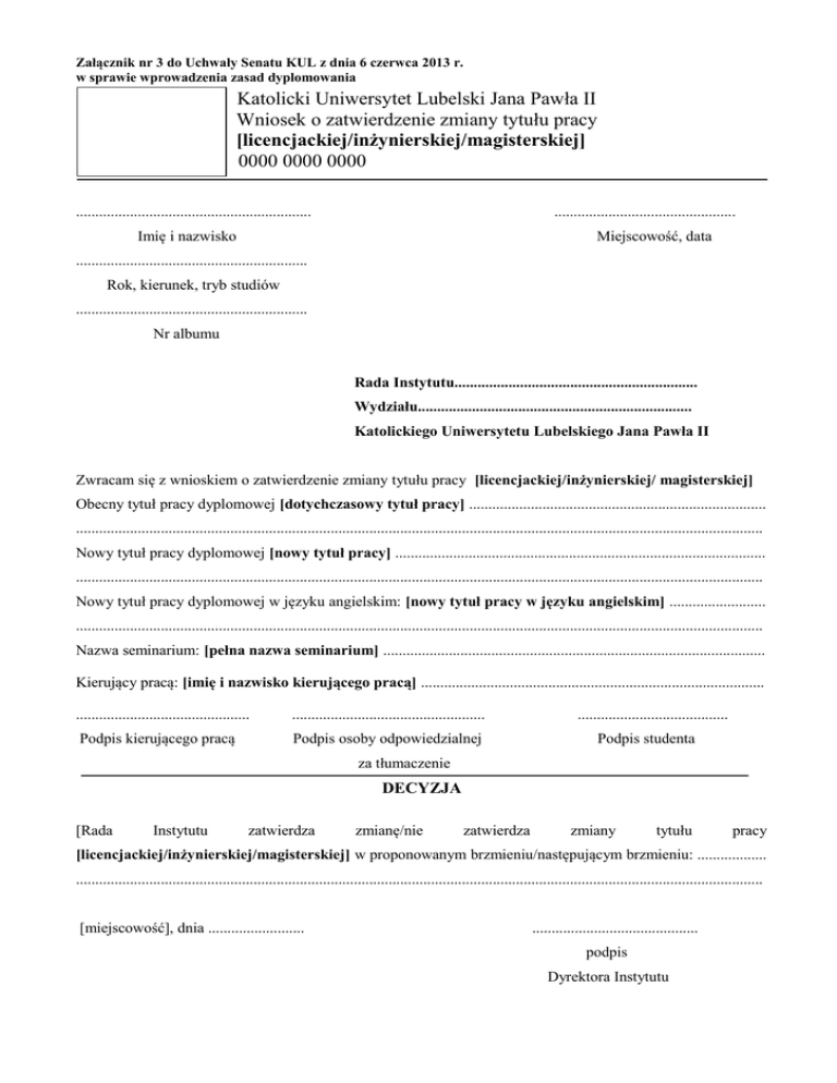 Załącznik nr 3 do Uchwały Senatu KUL z dnia 6 czerwca 2013 r. w sprawie wprowadzenia zasad dyplomowania Katolicki Uniwersytet Lubelski Jana Pawła II Wniosek o zatwierdzenie zmiany tytułu pracy [licencjackiej/inżynierskiej/magisterskiej] 0000 0000 0000 ............................................................. ............................................... Imię i nazwisko Miejscowość, data ............................................................ Rok, kierunek, tryb studiów ............................................................ Nr albumu Rada Instytutu............................................................... Wydziału....................................................................... Katolickiego Uniwersytetu Lubelskiego Jana Pawła II Zwracam się z wnioskiem o zatwierdzenie zmiany tytułu pracy [licencjackiej/inżynierskiej/ magisterskiej] Obecny tytuł pracy dyplomowej [dotychczasowy tytuł pracy] ............................................................................. .................................................................................................................................................................................. Nowy tytuł pracy dyplomowej [nowy tytuł pracy] ................................................................................................ .................................................................................................................................................................................. Nowy tytuł pracy dyplomowej w języku angielskim: [nowy tytuł pracy w języku angielskim] ......................... .................................................................................................................................................................................. Nazwa seminarium: [pełna nazwa seminarium] ................................................................................................... Kierujący pracą: [imię i nazwisko kierującego pracą] ......................................................................................... ............................................. .................................................. Podpis kierującego pracą Podpis osoby odpowiedzialnej ....................................... Podpis studenta za tłumaczenie DECYZJA [Rada Instytutu zatwierdza zmianę/nie zatwierdza zmiany tytułu pracy [licencjackiej/inżynierskiej/magisterskiej] w proponowanym brzmieniu/następującym brzmieniu: .................. .................................................................................................................................................................................. [miejscowość], dnia ......................... ........................................... podpis Dyrektora Instytutu