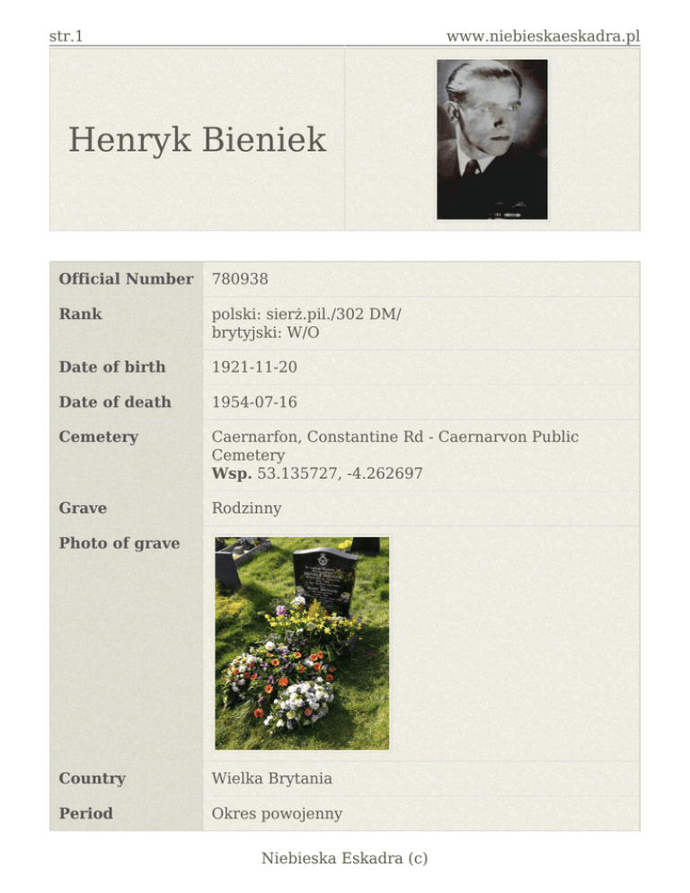 str.1 www.niebieskaeskadra.pl Henryk Bieniek Official Number 780938 Rank polski: sierż.pil./302 DM/ brytyjski: W/O Date of birth 1921-11-20 Date of death 1954-07-16 Cemetery Caernarfon, Constantine Rd - Caernarvon Public Cemetery Wsp. 53.135727, -4.262697 Grave Rodzinny Photo of grave Country Wielka Brytania Period Okres powojenny Niebieska Eskadra (c) str.2 www.niebieskaeskadra.pl Source "Polskie Siły Powietrzne..." T.J. i Anna Krzystek Informacja: www.veterans-uk.info Bieniek Henryk urodził się w m. Nowinki, pow. Lipsko (obecnie woj. mazowieckie) w rodzinie Wiktora i Feliksy Bieńków (W. Grudniak) Zdjęcia dzięki uprzejmości Steve Bieniek. Niebieska Eskadra (c)