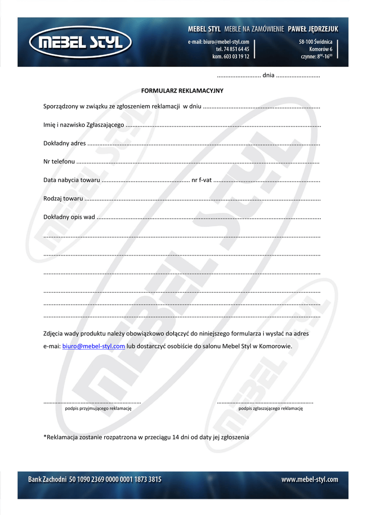 .......................... dnia .......................... FORMULARZ REKLAMACYJNY Sporządzony w związku ze zgłoszeniem reklamacji w dniu ..................................................................... Imię i nazwisko Zgłaszającego ................................................................................................................... Dokładny adres ......................................................................................................................................... Nr telefonu ............................................................................................................................................... Data nabycia towaru .................................................... nr f-vat ............................................................... Rodzaj towaru ........................................................................................................................................... Dokładny opis wad .................................................................................................................................... ................................................................................................................................................................... ................................................................................................................................................................... ................................................................................................................................................................... ................................................................................................................................................................... ................................................................................................................................................................... ................................................................................................................................................................... Zdjęcia wady produktu należy obowiązkowo dołączyć do niniejszego formularza i wysłać na adres e-mai: [email protected] lub dostarczyć osobiście do salonu Mebel Styl w Komorowie. ……………………………………………………… podpis przyjmującego reklamację …………………………………………………….. podpis zgłaszającego reklamację *Reklamacja zostanie rozpatrzona w przeciągu 14 dni od daty jej zgłoszenia