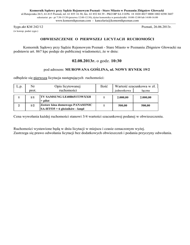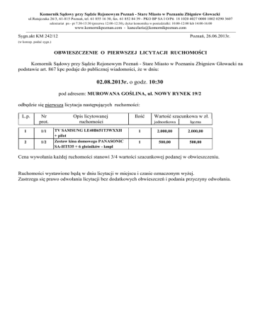 Komornik Sądowy przy Sądzie Rejonowym Poznań - Stare Miasto w Poznaniu Zbigniew Głowacki ul.Ratajczaka 26/3, 61-815 Poznań, tel. 61 855 16 30, fax. 61 852 84 39 - PKO BP SA I O/Pń 18 1020 4027 0000 1002 0290 3607 sekretariat pn - pt 7:30-15:30 (przerwa 12:00-12:30), dyżur komornika w poniedziałki: 10:00-12:00 lub 14:00-16:00 www.komornikpoznan.com - [email protected] Sygn.akt KM 242/12 Poznań, 26.06.2013r. (w koresp. podać sygn.) OBWIESZCZENIE O PIERWSZEJ LICYTACJI RUCHOMOŚCI Komornik Sądowy przy Sądzie Rejonowym Poznań - Stare Miasto w Poznaniu Zbigniew Głowacki na podstawie art. 867 kpc podaje do publicznej wiadomości, że w dniu: 02.08.2013r. o godz. 10:30 pod adresem: MUROWANA GOŚLINA, ul. NOWY RYNEK 19/2 odbędzie się pierwsza licytacja następujących ruchomości: L.p. Nr prot. 1 1/1 2 1/2 Opis licytowanej ruchomości TV SAMSUNG LE40B651T3WXXH + pilot Zestaw kina domowego PANASONIC SA-HT535 + 6 głośników - kmpl Ilość Wartość szacunkowa w zł. jednostkowa łączna 1 2.000,00 2.000,00 1 500,00 500,00 Cena wywołania każdej ruchomości stanowi 3/4 wartości szacunkowej podanej w obwieszczeniu. Ruchomości wystawione będą w dniu licytacji w miejscu i czasie oznaczonym wyżej. Zastrzega się prawo odwołania licytacji bez dodatkowych obwieszczeń i podania przyczyny odwołania.