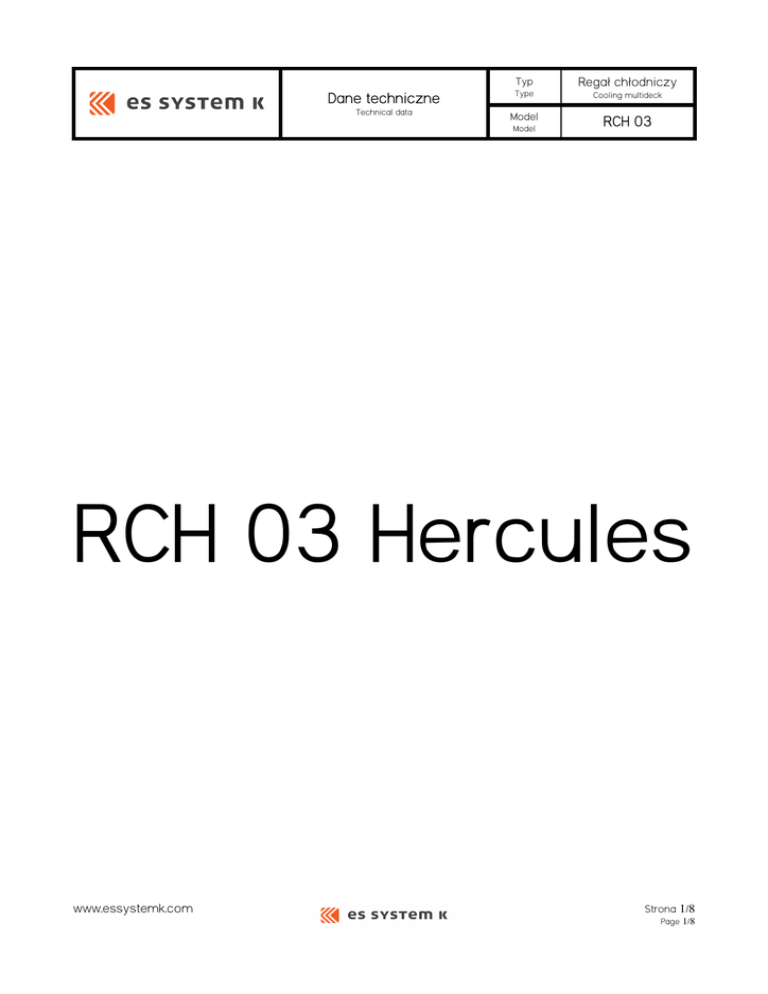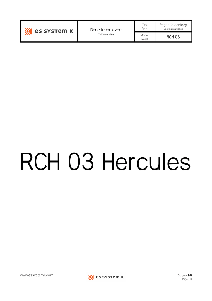 Typ Dane techniczne Type Technical data Model Model Regał chłodniczy Cooling multideck RCH 03 RCH 03 Hercules www.essystemk.com Strona 1/8 Page 1/8 Typ Dane techniczne Type Technical data Model Model Regał chłodniczy Cooling multideck RCH 03 SPIS TREŚCI: 1. Informacje ogólne ............................................................................................................................................................................................................................................ 3 General information 2. Informacje elektryczne ............................................................................................................................................................................................................................................ 4 Electrical information 3. Informacje chłodnicze ............................................................................................................................................................................................................................................ 5 Cooling information 4. Wymiary ...................................................................................................................................................................................................................................................................... 6 Dimmensions 5. Uwagi ................................................................................................................................................................................................................................................................................................. 8 Points www.essystemk.com Strona 2/8 Page 2/8 Dane techniczne Type Informacje ogólne Model Module RCH 03 1,88 2,15 2,50 3,75 Długość bez boków [mm] 1875 2150 2500 3750 Długość z bokami [mm] 1975 2250 2600 3850 Wysokość [mm] 2010 2010 2010 2010 Szerokość [mm] 780 780 780 780 [m2] 3,9 4,48 5,21 7,82 [dm3] 975 1120 1300 1955 Length without sides Lenght with sides Height Width Powierzchnia wystawowa (4x400 [mm] + 1x485 [mm]) Display area Pojemność użytkowa (4x400 [mm] + 1x485 [mm]) Net volume Waga [kg] Weight chłodniczy Typ Type cooling Klasa temperaturowa H1 Temperature class Zakres temperatur Temperature range [oC] Czynnik chłodniczy +2 ÷ +10 Refrigerant R404A (R507) Typ odmrażania naturalne (elektryczne)* Defrosting natural / electrical * Grubość boków Thickness of bumper Obciążenie półki Max. shelf load *) Cooling multideck Model General information Moduł Regał chłodniczy Typ Technical data [mm] 50 [kg/m2] 200 typ odmrażania w wersji standardowej – naturalne, opcjonalnie odmrażanie elektryczne defrosting type in normal version – natural, opitional – electrical defrosting www.essystemk.com Strona 3/8 Page 3/8 Dane techniczne Type Informacje elektryczne Model 230 Power supply Moduł RCH 03 50 [V] [Hz] 1,88 2,15 2,50 3,75 [W] 840 **) 945 **) 1100 **) 1675 **) [W] 40 51 61 91 Oświetlenie podstawowe Ilość 2 2 2 3 Main lighting [W] 58 60 72 108 3 4 4 6 [mm] Ø200 Ø200 Ø200 Ø200 [o] 28 28 28 28 M4Q045 M4Q045 M4Q045 M4Q045 108 144 144 216 ESM M1G055 ESM M1G055 ESM M1G055 ESM M1G055 [W] 15 20 20 30 [W] 130 130 130 130 1,88 2,15 2,50 3,75 336 / 1176 **) 385 / 1330 **) 407 / 1507 **) 545 / 2220 **) Module Moc odszraniania **) Power of defrost Moc grzałki antykondensacyjnej Power of antidew heater Ilość Quanitity Średnica Typ śmigła Diameter Type of blade Wentylatory komory Fans of room Kąt Pitch Typ Standardowe Standard Type Moc Power [W] Typ Energooszczędne High efficiency Type Moc Power Moc silnika rolety elektrycznej Power of moto rollo Moduł Module Nominalny pobór mocy Nominal power consumption Nominalne zużycie energii elektrycznej Nominal electric energy consumption **) Cooling multideck Model Electrical information Napięcie zasilania Regał chłodniczy Typ Technical data [W] [kWh/24h] elektryczne odszranianie w opcji electrical defrosting in optional version www.essystemk.com Strona 4/8 Page 4/8 Dane techniczne Type Informacje chłodnicze Model Refrigerant Cooling multideck RCH 03 Model Cooling information Czynnik chłodniczy Regał chłodniczy Typ Technical data R404A, R507 Klasa klimatyczna 3 Climatic class Temperatura odparownia [oC] -10 Temperatura otoczenia [oC] 25 Temperatura skraplania [oC] +35 Wilgotność względna [%] 60 Prędkość powietrza [m/s] 0,15 Oświetlenie [lx] 600 Evaporating temperature Condensing temperature Ambient temperature Relative humadity Air speed Lighting Moduł 1,88 2,15 2,50 3,75 H1 H1 H1 H1 +2 ÷ +10 +2 ÷ +10 +2 ÷ +10 +2 ÷ +10 - - - - [W] 2900 3300 3800 5800 [mm] Ø10 Ø10 Ø10 Ø10 [mm] Ø16 Ø16 Ø16 Ø16 Module Klasa temperaturowa Temperature class Zakres temperatur [oC] Temperature range Agregat chłodniczy Condensing unit Zapotrzebowanie na moc chłodniczą Refrigeration capacities dla /for t0= -10 [oC] Cieczowy Przyłącza Connectors Liquid Gazowy Gas Typ Zawór rozprężny Expansion valve TISE-SW lub/or TIE-SW Type TIO-002 lub /or TIO-003 Dysza Orifice Nastawa temperatury Setting of temperature Dyferencjał sterowania Differential of temperature TIO-003 [oC] +2 Ilość odszraniań na dobę [oC] 2 Maksymalny czas odszraniania 6 Number of defrost per 24h Maximum defrost duration Czas ociekania Dripping time Temperatura końca odszraniania End of defrosting temperature www.essystemk.com TIO-003 lub /or TIO-004 TIO-003 [min] 45 [min] 10 [oC] +8 Strona 5/8 Page 5/8 Dane techniczne Typ Technical data Type Wymiarmensions Model Model Regał chłodniczy Cooling multideck RCH 03 Przekrój urządzenia www.essystemk.com Strona 6/8 Page 6/8 Dane techniczne Type Wymiary Model Dimensions RCH 03 1,88 RCH 03 2,5 www.essystemk.com Typ Technical data Regał chłodniczy Model Cooling multideck RCH 03 RCH 03 2,15 RCH 03 3,75 Strona 7/8 Page 7/8 Dane techniczne Type Uwagi Model Points www.essystemk.com Typ Technical data Model Regał chłodniczy 