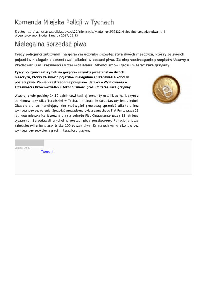 Komenda Miejska Policji w Tychach Źródło: http://tychy.slaska.policja.gov.pl/k27/informacje/wiadomosci/66322,Nielegalna-sprzedaz-piwa.html Wygenerowano: Środa, 8 marca 2017, 11:43 Nielegalna sprzedaż piwa Tyscy policjanci zatrzymali na gorącym uczynku przestępstwa dwóch mężczyzn, którzy ze swoich pojazdów nielegalnie sprzedawali alkohol w postaci piwa. Za nieprzestrzeganie przepisów Ustawy o Wychowaniu w Trzeźwości i Przeciwdziałaniu Alkoholizmowi grozi im teraz kara grzywny. Tyscy policjanci zatrzymali na gorącym uczynku przestępstwa dwóch mężczyzn, którzy ze swoich pojazdów nielegalnie sprzedawali alkohol w postaci piwa. Za nieprzestrzeganie przepisów Ustawy o Wychowaniu w Trzeźwości i Przeciwdziałaniu Alkoholizmowi grozi im teraz kara grzywny. Wczoraj około godziny 14.10 dzielnicowi tyskiej komendy ustalili, że na jednym z parkingów przy ulicy Turyńskiej w Tychach nielegalnie sprzedawany jest alkohol. Okazało się, że handlujący nim mężczyźni prowadzą sprzedaż alkoholu bez wymaganego zezwolenia. Sprzedaż prowadzona była z samochodu Fiat Punto przez 25 letniego mieszkańca Jaworzna oraz z pojazdu Fiat Cinquecento przez 35 letniego tyszanina. Sprzedawali alkohol w postaci piwa puszkowego. Funkcjonariusze zabezpieczyli u handlarzy blisko 100 puszek piwa. Za sprzedawanie alkoholu bez wymaganego zezwolenia grozi im teraz kara grzywny. Ocena: 0/5 (0) Tweetnij