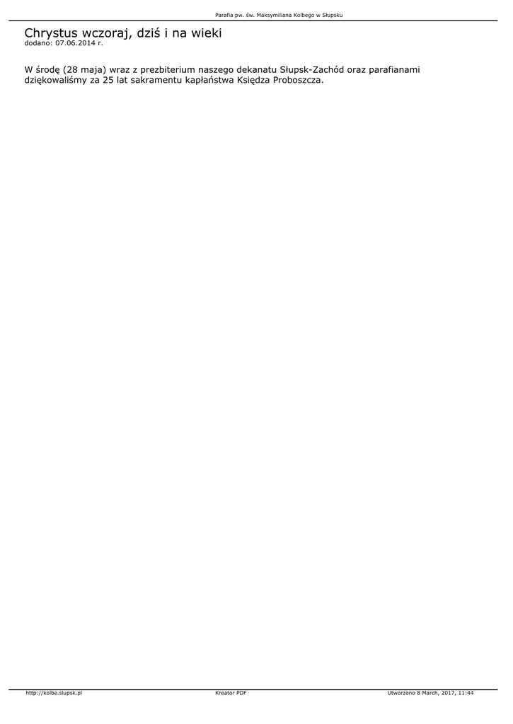 Parafia pw. św. Maksymiliana Kolbego w Słupsku Chrystus wczoraj, dziś i na wieki dodano: 07.06.2014 r. W środę (28 maja) wraz z prezbiterium naszego dekanatu Słupsk-Zachód oraz parafianami dziękowaliśmy za 25 lat sakramentu kapłaństwa Księdza Proboszcza. http://kolbe.slupsk.pl Kreator PDF Utworzono 8 March, 2017, 11:44