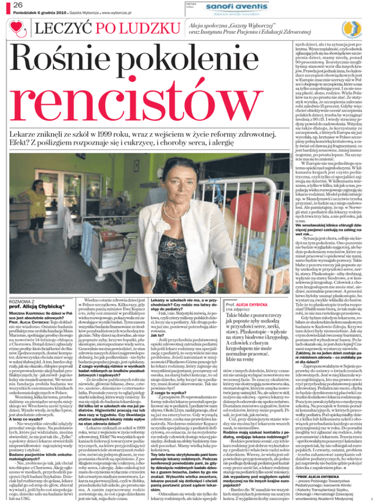 26 PARTNER CYKLU Poniedziałek 6 grudnia 2010 Gazeta Wyborcza www.wyborcza.pl + + LECZYĆ PO LUDZKU Akcja społeczna „Gazety Wyborczej” oraz Instytutu Praw Pacjenta i Edukacji Zdrowotnej Rośnie pokolenie rencistów ŁUKASZ GIZA Lekarze zniknęli ze szkół w 1999 roku, wraz z wejściem w życie reformy zdrowotnej. Efekt? Z poślizgiem rozpoznaje się i cukrzycę, i choroby serca, i alergię nych dzieci, ale i tu sytuacja jest pokrętna. Wyszczepialność, czyli odsetek zgłaszających się na obowiązkowe szczepienia dzieci, mamy niezłą, ponad 90-procentową. Teoretycznie moglibyśmy stanowić wzór dla innych krajów. Prawda jest jednak inna, bo kalendarz szczepień obowiązkowych jest w Europie znacznie szerszy niż w Polsce iobejmuje te szczepienia, które unas są tylko uzupełniającymi. I za nie muszą płacić, słono, rodzice. Wielu Polaków na to po prostu nie stać. Ze statystyk wynika, że szczepienia zalecane robi zaledwie 15 procent. Gdyby więc chcieć obiektywnie ocenić szczepienia polskich dzieci, trzeba by wyciągnąć średnią z 90 i 15. I wtedy stracimy jedyny powód do zadowolenia. Wstydzę się także dlatego, że korzystamy ze szczepionek, z których Europa się już wycofała, np. krztusiec w Polsce szczepimy pełną komórką krztuścową, a cały świat od dawna jej fragmentami, co jest bardziej sensowne, mniej immunogenne, po prostu lepsze. Na szczęście ma się to zmienić. W Europie nie ma jednolitego systemu opieki nad najmłodszymi. W kilkunastu krajach jest czysto pediatryczna, czyli tylko ci specjaliści zajmują się dziećmi. W kilkunastu mieszana, a tylko w kilku, tak jak u nas, populacją wieku rozwojowego zajmują się lekarze rodzinni. Model polski istnieje np. w Skandynawii i uczciwie trzeba przyznać, że ludzie są z niego zadowoleni. Ale pamiętajmy, że np. w Norwegii staż z pediatrii dla lekarzy rodzinnych trwa trzy lata, a nie pół roku, jak u nas. We wrocławskiej klinice chirurgii dziecięcej pacjenci czekają na zabieg nawet rok... ROZMOWA Z prof. Alicją Chybicką* MARZENA KASPERSKA: Ile dzieci w Polsce jest absolutnie zdrowych? PROF. ALICJA CHYBICKA: Tego dokład- nie nie wiadomo. Ostatnie badania profilaktyczne zrobiła fundacja Mam Marzenie, spełniając prośbę chorego na nowotwór 14-letniego chłopca z Chorzowa. Dotąd dzieci zgłaszały różne prośby: ktoś chciał lecieć do Stanów Zjednoczonych, dostać komputer, dziewczynka chciała mieć sesję wsukni ślubnej itd. Aten, bardzo dojrzały, jak się okazało, chłopiec poprosił o przeprowadzenie akcji badań profilaktycznych, by – jak mówił – jego koledzy nie musieli umierać. We wrześniu fundacja zrobiła badania we wszystkich osiemnastu klinikach onkohematologicznych w Polsce. Wcześniej, kilka lat temu, przebadaliśmy za pieniądze urzędu miejskiego we Wrocławiu sześć tysięcy dzieci. Wyszło wtedy, że tylko 3 proc. jest absolutnie zdrowych. A teraz co wyszło? – Nie wszystkie ośrodki zdążyły przesłać swoje dane. Na podstawie tych, które już widziałam, można stwierdzić, że nie jest tak źle. „Tylko” u połowy dzieci lekarze stwierdzili nieprawidłowości – najczęściej wady postawy i otyłość. Badano pacjentów klinik onkohematologicznych? – Nie, zrobiono je tak, jak chciał ten chłopiec z Chorzowa. Akcję ogłoszono w mediach, przychodzili pacjenci i byli badani fizykalnie. Dzieciak był rozbierany do golasa, lekarz oglądał go od stóp do głów, zbierał wywiad i, jeśli było coś niepokojącego, dziecko szło na badanie krwi lub na USG. Wiedza o stanie zdrowia dzieci jest w Polsce szczątkowa. Kilka razy, gdy prosiłam panią minister Ewę Kopacz o to, żeby coś zmienić w profilaktyce wieku rozwojowego, pokazywała mi zadowalające wyniki badań. Tymczasem wszystkie badania finansowane ze środków pozabudżetowych wychodzą tragicznie. Niby dzieci są dorodne, ale mają popsute zęby, krzywe łopatki, płaskostopie, nierozpoznane wady serca. Generalnie można powiedzieć, że stan zdrowia naszych dzieci najprawdopodobniej, bo jak podkreślam – nie było badania populacyjnego, jest opłakany. Z czego wynikają różnice w wynikach badań robionych ze środków pozabudżetowych i rządowych? – Ze środków publicznych robi się niewiele, głównie bilanse, dwu-, cztero-, sześcio-, dziesięcio- i czternastolatka. Pozostałe rzeczy to ogląd pielęgniarki szkolnej, która waży i mierzy. To ma się nijak do badania lekarskiego. Od kilku lat w szkołach nie ma już pediatrów. Higienistki pracują raz lub dwa razy w tygodniu. Czy likwidacja etatów szkolnych lekarzy miała wpływ na stan zdrowia dzieci? – Lekarze zniknęli ze szkół w 1999 roku, wraz z wejściem w życie reformy zdrowotnej. Efekt? Na wszystkich spotkaniach federacji towarzystw pediatrycznych, na które przyjeżdżają też przedstawiciele stowarzyszeń rodziców, mówi się jednym głosem, że rozpoznania chorób są opóźnione. Z poślizgiem rozpoznaje się icukrzycę, ichoroby serca, i alergię. Jako onkolog też mam do czynienia wyłącznie ztrzecim lub czwartym stadium nowotworu. Lekarza na pierwszej linii, czyli w żłobku, przedszkolu lub szkole, po prostu nie ma. A zanim zapracowany rodzic zorientuje się, że coś z jego dzieckiem jest nie tak, mija dużo czasu. Lekarzy w szkołach nie ma, a w przychodniach? Czy rodzic ma łatwy dostęp do pediatry? – Itak, inie. Statystyki mówią, że połowa, czyli cztery miliony polskich dzieci, leczy się u pediatry. Ale druga połowa już nie, ponieważ potrzebują skierowania. Jak to? – Jeśli przychodnia podstawowej opieki zdrowotnej zatrudnia pediatrę lub jeśli lekarz rodzinny ma specjalizację z pediatrii, to oczywiście nie ma problemu. Jeżeli natomiast w miejscowości Pikutkowo Górne pracuje tylko lekarz rodzinny, który zajmuje się wszystkimi pacjentami, począwszy od oseska, na starej babci kończąc, to od niego dziecko, żeby leczyć się u pediatry, musi dostać skierowanie. Ta