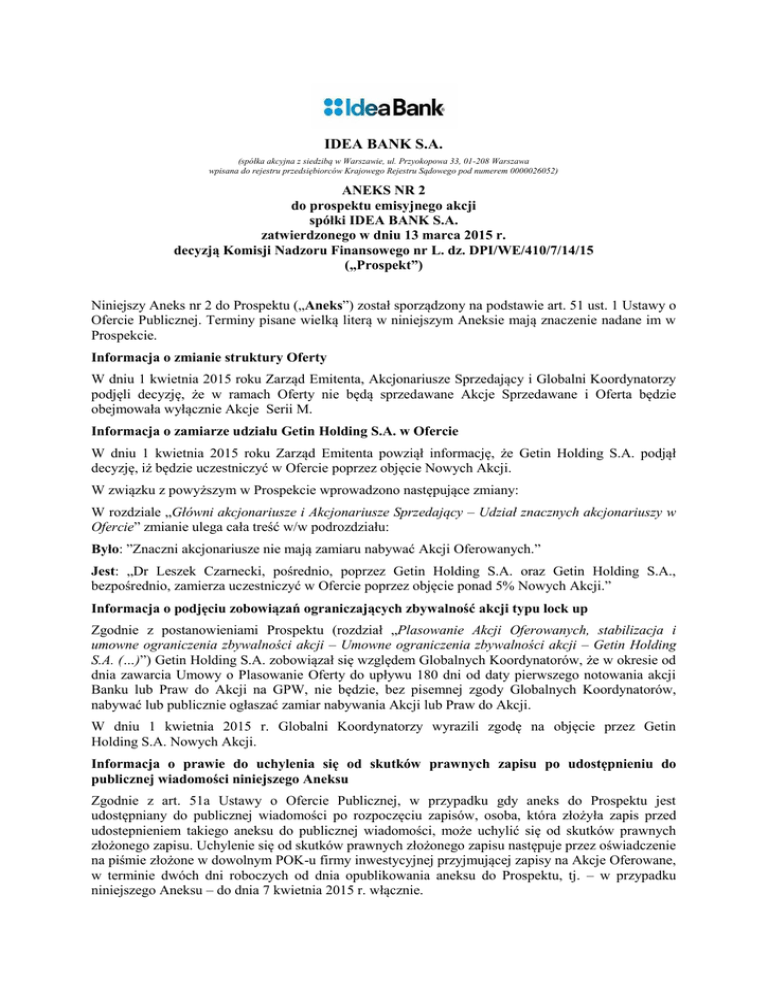 IDEA BANK S.A. (spółka akcyjna z siedzibą w Warszawie, ul. Przyokopowa 33, 01-208 Warszawa wpisana do rejestru przedsiębiorców Krajowego Rejestru Sądowego pod numerem 0000026052) ANEKS NR 2 do prospektu emisyjnego akcji spółki IDEA BANK S.A. zatwierdzonego w dniu 13 marca 2015 r. decyzją Komisji Nadzoru Finansowego nr L. dz. DPI/WE/410/7/14/15 („Prospekt”) Niniejszy Aneks nr 2 do Prospektu („Aneks”) został sporządzony na podstawie art. 51 ust. 1 Ustawy o Ofercie Publicznej. Terminy pisane wielką literą w niniejszym Aneksie mają znaczenie nadane im w Prospekcie. Informacja o zmianie struktury Oferty W dniu 1 kwietnia 2015 roku Zarząd Emitenta, Akcjonariusze Sprzedający i Globalni Koordynatorzy podjęli decyzję, że w ramach Oferty nie będą sprzedawane Akcje Sprzedawane i Oferta będzie obejmowała wyłącznie Akcje Serii M. Informacja o zamiarze udziału Getin Holding S.A. w Ofercie W dniu 1 kwietnia 2015 roku Zarząd Emitenta powziął informację, że Getin Holding S.A. podjął decyzję, iż będzie uczestniczyć w Ofercie poprzez objęcie Nowych Akcji. W związku z powyższym w Prospekcie wprowadzono następujące zmiany: W rozdziale „Główni akcjonariusze i Akcjonariusze Sprzedający – Udział znacznych akcjonariuszy w Ofercie” zmianie ulega cała treść w/w podrozdziału: Było: ”Znaczni akcjonariusze nie mają zamiaru nabywać Akcji Oferowanych.” Jest: „Dr Leszek Czarnecki, pośrednio, poprzez Getin Holding S.A. oraz Getin Holding S.A., bezpośrednio, zamierza uczestniczyć w Ofercie poprzez objęcie ponad 5% Nowych Akcji.” Informacja o podjęciu zobowiązań ograniczających zbywalność akcji typu lock up Zgodnie z postanowieniami Prospektu (rozdział „Plasowanie Akcji Oferowanych, stabilizacja i umowne ograniczenia zbywalności akcji – Umowne ograniczenia zbywalności akcji – Getin Holding S.A. (…)”) Getin Holding S.A. zobowiązał się względem Globalnych Koordynatorów, że w okresie od dnia zawarcia Umowy o Plasowanie Oferty do upływu 180 dni od daty pierwszego notowania akcji Banku lub Praw do Akcji na GPW, nie będzie, bez pisemnej zgody Globalnych Koordynatorów, nabywać lub publicznie ogłaszać zamiar nabywania Akcji lub Praw do Akcji. W dniu 1 kwietnia 2015 r. Globalni Koordynatorzy wyrazili zgodę na objęcie przez Getin Holding S.A. Nowych Akcji. Informacja o prawie do uchylenia się od skutków prawnych zapisu po udostępnieniu do publicznej wiadomości niniejszego Aneksu Zgodnie z art. 51a Ustawy o Ofercie Publicznej, w przypadku gdy aneks do Prospektu jest udostępniany do publicznej wiadomości po rozpoczęciu zapisów, osoba, która złożyła zapis przed udostepnieniem takiego aneksu do publicznej wiadomości, może uchylić się od skutków prawnych złożonego zapisu. Uchylenie się od skutków prawnych złożonego zapisu następuje przez oświadczenie na piśmie złożone w dowolnym POK-u firmy inwestycyjnej przyjmującej zapisy na Akcje Oferowane, w terminie dwóch dni roboczych od dnia opublikowania aneksu do Prospektu, tj. – w przypadku niniejszego Aneksu – do dnia 7 kwietnia 2015 r. włącznie.