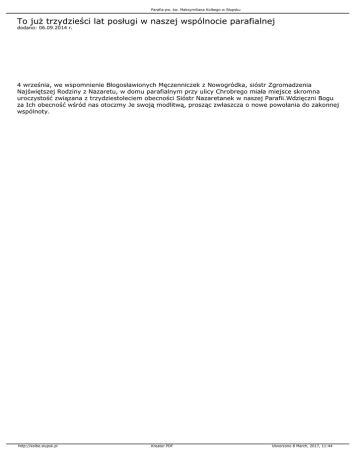 Parafia pw. św. Maksymiliana Kolbego w Słupsku To już trzydzieści lat posługi w naszej wspólnocie parafialnej dodano: 06.09.2014 r. 4 września, we wspomnienie Błogosławionych Męczenniczek z Nowogródka, sióstr Zgromadzenia Najświętszej Rodziny z Nazaretu, w domu parafialnym przy ulicy Chrobrego miała miejsce skromna uroczystość związana z trzydziestoleciem obecności Sióstr Nazaretanek w naszej Parafii.Wdzięczni Bogu za Ich obecność wśród nas otoczmy Je swoją modlitwą, prosząc zwłaszcza o nowe powołania do zakonnej wspólnoty. http://kolbe.slupsk.pl Kreator PDF Utworzono 8 March, 2017, 11:44