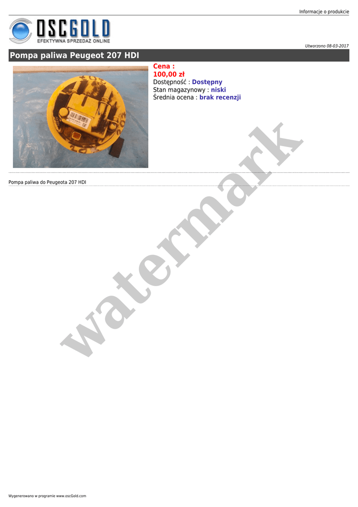 Informacje o produkcie Utworzono 08-03-2017 Pompa paliwa Peugeot 207 HDI Cena : 100,00 zł w at Pompa paliwa do Peugeota 207 HDI er m ar k Dostępność : Dostępny Stan magazynowy : niski Średnia ocena : brak recenzji Wygenerowano w programie www.oscGold.com