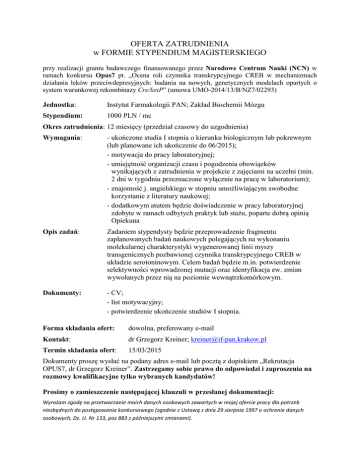 OFERTA ZATRUDNIENIA w FORMIE STYPENDIUM MAGISTERSKIEGO przy realizacji grantu badawczego finansowanego przez Narodowe Centrum Nauki (NCN) w ramach konkursu Opus7 pt. „Ocena roli czynnika transkrypcyjnego CREB w mechanizmach działania leków przeciwdepresyjnych: badania na nowych, genetycznych modelach opartych o system warunkowej rekombinazy Cre/loxP” (umowa UMO-2014/13/B/NZ7/02293) Jednostka: Instytut Farmakologii PAN; Zakład Biochemii Mózgu Stypendium: 1000 PLN / mc Okres zatrudnienia: 12 miesięcy (przedział czasowy do uzgodnienia) Wymagania: - ukończone studia I stopnia o kierunku biologicznym lub pokrewnym (lub planowane ich ukończenie do 06/2015); - motywacja do pracy laboratoryjnej; - umiejętność organizacji czasu i pogodzenia obowiązków wynikających z zatrudnienia w projekcie z zajęciami na uczelni (min. 2 dni w tygodniu przeznaczone wyłącznie na pracę w laboratorium); - znajomość j. angielskiego w stopniu umożliwiającym swobodne korzystanie z literatury naukowej; - dodatkowym atutem będzie doświadczenie w pracy laboratoryjnej zdobyte w ramach odbytych praktyk lub stażu, poparte dobrą opinią Opiekuna Opis zadań: Zadaniem stypendysty będzie przeprowadzenie fragmentu zaplanowanych badań naukowych polegających na wykonaniu molekularnej charakterystyki wygenerowanej linii myszy transgenicznych pozbawionej czynnika transkrypcyjnego CREB w układzie serotoninowym. Celem badań będzie m.in. potwierdzenie selektywności wprowadzonej mutacji oraz identyfikacja ew. zmian wywołanych przez nią na poziomie wewnątrzkomórkowym. Dokumenty: - CV; - list motywacyjny; - potwierdzenie ukończenie studiów I stopnia. Forma składania ofert: dowolna, preferowany e-mail Kontakt: dr Grzegorz Kreiner; [email protected] Termin składania ofert: 15/03/2015 Dokumenty proszę wysłać na podany adres e-mail lub pocztą z dopiskiem „Rekrutacja OPUS7, dr Grzegorz Kreiner”. Zastrzegamy sobie prawo do odpowiedzi i zaproszenia na rozmowy kwalifikacyjne tylko wybranych kandydatów! Prosimy o zamieszczenie następującej klauzuli w przesłanej dokumentacji: Wyrażam zgodę na przetwarzanie moich danych osobowych zawartych w mojej ofercie pracy dla potrzeb niezbędnych do postępowania konkursowego (zgodnie z Ustawą z dnia 29 sierpnia 1997 o ochronie danych osobowych, Dz. U. Nr 133, poz 883 z późniejszymi zmianami).