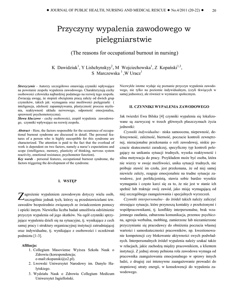 ●●JOURNAL ● JOURNALOF OFPUBLIC PUBLICHEALTH, HEALTH,NURSING NURSINGAND ANDMEDICAL MEDICALRESCUE RESCUE●●No.4/2011 No.4/2011(20-22) ● 20 Przyczyny wypalenia zawodowego w pielęgniarstwie (The reasons for occupational burnout in nursing) K Dawidziuk1, Y Lishchynskyy2, M Wojciechowska1, Z Kopański1,3, S Marczewska 1 ,W Uracz1 Streszczenie - Autorzy szczegółowo omawiają czynniki wpływające na powstanie zespołu wypalenia zawodowego. Charakteryzują cechy osobowości człowieka najbardziej podatnego na rozwój tego zespołu. Zwracają uwagę, że stopień obciążenia pracą zależy od dwóch grup czynników, takich jak: wymagania oraz możliwości pielęgniarki ( inteligencja, zdolność zapamiętywania, plastyczność procesu myślenia, reaktywność układu nerwowego, odporność emocjonalna, sprawność psychomotoryczna). Słowa kluczowe - cechy osobowości, zespół wypalenia zawodowego, czynniki wpływające na rozwój zespołu. Abstract - Here, the factors responsible for the occurrence of occupational burnout syndrome are discussed in detail. The personal features of a person who is highly susceptible for this syndrome are characterized. The attention is paid to the fact that the overload of work is dependent on two factors, namely a nurse’s expectations and scope (intelligence, memory, plasticity of thinking, nervous system reactivity, emotional resistance, psychomotor function). Key words - personal features, occupational burnout syndrome, the factors triggering the development of the syndrome. I. WSTĘP agrożenie wypaleniem zawodowym dotyczy wielu osób, szczególnie jednak tych, którzy są przedstawicielami tzw. zawodów bezpośrednio związanych ze świadczeniem pomocy i opieki innym. Niewielka liczba badań umożliwia odróżnienie przyczyn wypalenia od jego skutków. Na ogół czynniki sprzyjające wypaleniu dzieli się na sytuacyjne, tj. wynikające z cech samej pracy i struktury organizacyjnej instytucji zatrudniającej oraz indywidualne, tj. wynikające z osobowości i oczekiwań podmiotu [1-3]. Z Afiliacja: 1. Collegium Masoviense Wyższa Szkoła Nauk o Zdrowiu (korespondencja; e-mail:[email protected]). 2. Lwowski Uniwersytet Narodowy im. Danylo Halytskiego. 3. Wydziału Nauk o Zdrowiu Collegium Medicum Uniwersytet Jagielloński. Niezwykle istotne wydaje się poznanie przyczyn wypalenia zawodowego, nie tylko na poziomie indywidualnym, (czyli tkwiących w samej jednostce), ale również w wymiarze społecznym. II. CZYNNIKI WYPALENIA ZAWODOWEGO Jak twierdzi Ewa Bilska [4] czynniki wypalenia się lokalizowane są zazwyczaj w trzech głównych płaszczyznach życia jednostki: Czynniki indywidualne– niska samoocena, niepewność, defensywność, zależność, bierność, poczucie kontroli zewnętrznej, nieracjonalne przekonania o roli zawodowej, niskie poczucie skuteczności zaradczej, specyficzny typ kontroli polegający na unikaniu sytuacji trudnych, wysoka reaktywność i silna motywacja do pracy. Przykładem może być osoba, która nie wierzy w swoje możliwości, unika sytuacji trudnych, nie próbuje stawić im czoła, jest przekonana, że od niej samej niewiele zależy, reaguje emocjonalnie na trudne sytuacje zawodowe, jest perfekcjonistą, stawia sobie bardzo wysokie wymagania i często karci się za to, że nie jest w stanie ich spełnić lub traktuje swój zawód, jako misję wymagającą od niej szczególnego zaangażowania i specjalnych wyrzeczeń. Czynniki interpersonalne– do źródeł takich należy zaliczyć stresujące sytuacje, które przynoszą kontakty z przełożonymi i współpracownikami, tj. konflikty interpersonalne, brak wzajemnego zaufania, zaburzona komunikacja, przemoc psychiczna, agresja werbalna, mobbing, zamierzone lub niezamierzone przyczynianie się pracodawcy do obniżenia poczucia własnej wartości i samoskuteczności pracowników, np. kwestionowanie kompetencji czy blokowanie aktywności swych podwładnych. Interpersonalnych źródeł wypalenia należy szukać także w relacjach, jakie zachodzą między pracownikiem, a klientem instytucji. Z jednej strony pełniona rola zawodowa wymaga od pracownika zaangażowania emocjonalnego w sprawy innych ludzi, z drugiej zaś intensywne zaangażowanie prowadzi do stopniowej utraty energii, w konsekwencji do wypalenia zawodowego. ● JOURNAL OF PUBLIC HEALTH, NURSING AND MEDICAL RESCUE ● No.4/2011 ● Czynniki organizacyjne– wiążą się one z przypisanymi pracownikowi obowiązkami i sposobem przekazu ich w postaci nakazów i zakazów tworzących zbiór oczekiwań wobec niego. Bardzo często zakres tych oczekiwań i sposób ich komunikowania stają się źródłem doświadczanego stresu, zwłaszcza gdy pracownik przeciążony jest nadmierną ilością obowiązków; stawiane są mu wymagania, których nie jest w stanie zrealizować w przewidzianym czasie lub przy pomocy pozostawionych mu środków; cele instytucji są sprzeczne z wartościami i normami uznawanymi przez pracownika; ilość informacji niezbędnych do prawidłowego wykonania obowiązków jest niewystarczająca lub są one niejasne, niedokładne, zniekształcone. Innym sposobem scharakteryzowania przyczyn wypalenia jest doszukiwanie się ich w sześciu obszarach, w których mogą pojawić się niezgodności pomiędzy osobą, a jej środowiskiem pracy. Są to: przeciążenie pracą, kontrola czyli jak duży mamy wpływ na to co robimy (brak kontroli powoduje poważny stres), uznanie i nagroda (poczucie niewystarczającej nagrody lub brak uznania może w znaczny sposób przyczyniać się do wypalenia), relacje między pracownikami, konflikty, brak wsparcia społecznego, sprawiedliwość społeczna (poczucie krzywdy, pomijania przy awansach, premiach, brak możliwości podejmowania nowych działań powoduje złość, wrogość i większy stres) [5-7]. Zdarza się, że borykający się z codziennymi trudnościami pracownicy przenoszą swe problemy na pracę zawodową. Przeżywając silne napięcie emocjonalne, obci