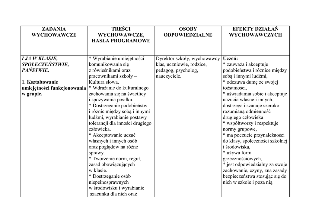 ZADANIA WYCHOWAWCZE TREŚCI WYCHOWAWCZE, HASŁA PROGRAMOWE * Wyrabianie umiejętności komunikowania się z rówieśnikami oraz pracownikami szkoły – Kultura słowa. 1. Kształtowanie umiejętności funkcjonowania * Wdrażanie do kulturalnego zachowania się na świetlicy w grupie. i spożywania posiłku. * Dostrzeganie podobieństw i różnic między sobą i innymi ludźmi, wyrabianie postawy tolerancji dla inności drugiego człowieka. * Akceptowanie uczuć własnych i innych osób oraz poglądów na różne sprawy. * Tworzenie norm, reguł, zasad obowiązujących w klasie. * Dostrzeganie osób niepełnosprawnych w środowisku i wyrabianie szacunku dla nich oraz I JA W KLASIE, SPOŁECZEŃSTWIE, PAŃSTWIE. OSOBY ODPOWIEDZIALNE EFEKTY DZIAŁAŃ WYCHOWAWCZYCH Dyrektor szkoły, wychowawcy klas, uczniowie, rodzice, pedagog, psycholog, nauczyciele. Uczeń: * zauważa i akceptuje podobieństwa i różnice między sobą i innymi ludźmi, * odczuwa dumę ze swojej tożsamości, * uświadamia sobie i akceptuje uczucia własne i innych, dostrzega i szanuje szeroko rozumianą odmienność drugiego człowieka * współtworzy i respektuje normy grupowe, * ma poczucie przynależności do klasy, społeczności szkolnej i środowiska, * używa form grzecznościowych, * jest odpowiedzialny za swoje zachowanie, czyny, zna zasady bezpieczeństwa stosując się do nich w szkole i poza nią 2. Kształtowanie radzenia sobie w trudnych sytuacjach. uwrażliwianie na niesienie im pomocy. * Pomoc młodszym dzieciom z oddziału przedszkolnego poprzez uczestnictwo w akcji „Zabawka i książeczka”. * Udział uczniów szkolnej akcji pomocy dla zwierząt w schronisku „Kołderka dla pieska” * Wyrabianie umiejętności podejmowania decyzji w sytuacjach problemowych. * Kształtowanie postawy asertywności i rozwijanie zdolności empatii. * Wyrabianie umiejętności przeciwdziałania agresji i poszanowanie godności drugiego człowieka poprzez udział w ogólnopolskiej akcji „Noc Profilaktyki”. * Realizacja zadań Rządowego Programu „Bezpieczna i Przyjazna Szkoła 2014-2016”. * Kształtowanie umiejętności rozwiązywania problemów, a w sytuacjach trudnych przy współpracy z Policją, Wychowawcy klas, pedagog, uczniowie, rodzice, placówki oświatowo - wychowawcze, organizacje pozarządowe działające na rzecz dziecka i rodziny. Uczeń: * potrafi radzić sobie w trudnych sytuacjach, * wie, do kogo może zwrócić się o pomoc, * zna formy odmawiania innym osobom, * rozróżnia dobro i zło w sytuacjach codziennych i odpowiednio reaguje, * zna i przestrzega zasady współdziałania w grupie, * zna i wdraża w życie sposoby walki z agresją, * wykazuje umiejętności empatyczne, * zna swoje prawa i obowiązki zawarte w Statucie szkoły 3. Kształtowanie szacunku do tradycji i historii szkoły, własnej rodziny, regionu i kraju. sądem, PPP. * Reagowanie na pojawiające się problemy i zgłaszanie ich bezpośrednio do wychowawcy i pedagoga szkolnego. * Dostrzeganie swoich mocnych i słabych stron. * Wpajanie i respektowanie zasad funkcjonowania w grupie, społeczności szkolnej i środowisku. * Wyrabianie umiejętności korzystania z praw ucznia, człowieka oraz wskazywanie związku pomiędzy prawami, a obowiązkami. * Uświadamianie wartości rodziny i wyrabianie szacunku dla jej członków. * Ważność podtrzymywania tradycji rodzinnych. klasowych i szkolnych. * Wyrabianie szacunku dla tradycji i symboli szkolnych, państwowych. * Rozwijanie wiedzy na temat patrona szkoły. * Poznawanie historii, kultury i tradycji regionu oraz kraju Dyrektor szkoły, wychowawcy klas, pedagog, uczniowie, rodzice, władze miasta, nauczyciele historii, wiedzy o społeczeństwie. Uczeń: * zna charakterystyczne cechy swojej rodziny, * rozumie znaczenie podtrzymywania tradycji szkolnych, rodzinnych, regionalnych, * zna zabytki swojej miejscowości, regionu, kraju, * odczuwa dumę z piękna swojego kraju, * zna symbole szkolne i narodowe i potrafi właściwie 4. Kształtowanie umiejętności skutecznej komunikacji. Tworzenie kontaktów interpersonalnych. - wycieczki szkolne, zielone szkoły, koło regionalne. * Kształtowanie postaw patriotycznych oraz szacunku dla środowiska lokalnego i szkoły. * Kształtowanie szacunku dla Ojczyzny i symboli narodowych. * Wzmacnianie poczucia przynależności do społeczności lokalnej, bycia Polakiem, Europejczykiem. * Przygotowywanie uczniów do świadomego korzystania z praw obywatelskich. * Uświadamianie znaczenia obchodów rocznicowych i ważnych wydarzeń państwowych. * Wdrażanie do aktywnego słuchania. * Kształtowanie umiejętności kulturalnego egzekwowania swoich praw z poszanowaniem rozmówcy. * Kształtowanie umiejętności wyrażania swojego zdania, próśb, sądów, oczekiwań. wobec nich się zachowywać, * zna najważniejsze fakty dotyczące patrona szkoły, * godnie zachowuje się podczas uroczystości szkolnych, regionalnych, państwowych, * zna słowa hymnu państwowego, * potrafi przyjąć właściwą postawę podczas jego wykonywania oraz wnoszenia sztandaru szkolnego, * stara się pogłębiać swoją wiedzę na temat swojego regionu, kraju, Europy, * jest dumny z przynależności do swojej rodziny, klasy, szkoły, regionu,kraju Wychowawcy klas, nauczyciele uczący, pedagog, uczniowie, rodzice, koło dziennikarskie, koło teatralne. Uczeń: * jest świadomy własnej tożsamości, * dostrzega świat własnych potrzeb i zasób swoich możliwości oraz potrzeby innych ludzi, * organizuje pomoc koleżeńską dla uczniów z trudnościami * Organizowanie pomocy koleżeńskiej. * Uświadamianie praw i obowiązków ucznia oraz konsekwencje w razie ich niewypełniania. * Zapoznanie z różnymi formami wypowiedzi. * Rozpoznawanie i rozumienie założeń komunikacji werbalnej i pozawerbalnej z uwzględnieniem ich etycznego wymiaru (szczerość, kłamstwo, manipulacja, agresja słowna) * Wyrabianie umiejętności właściwego współdziałania uczniów gimnazjum i szko